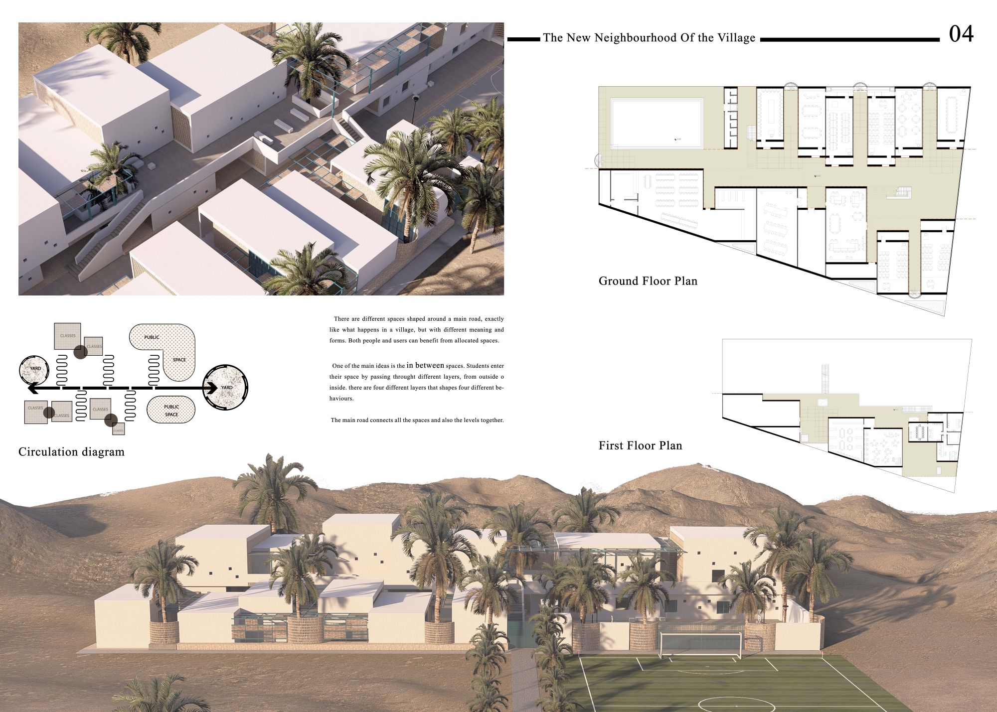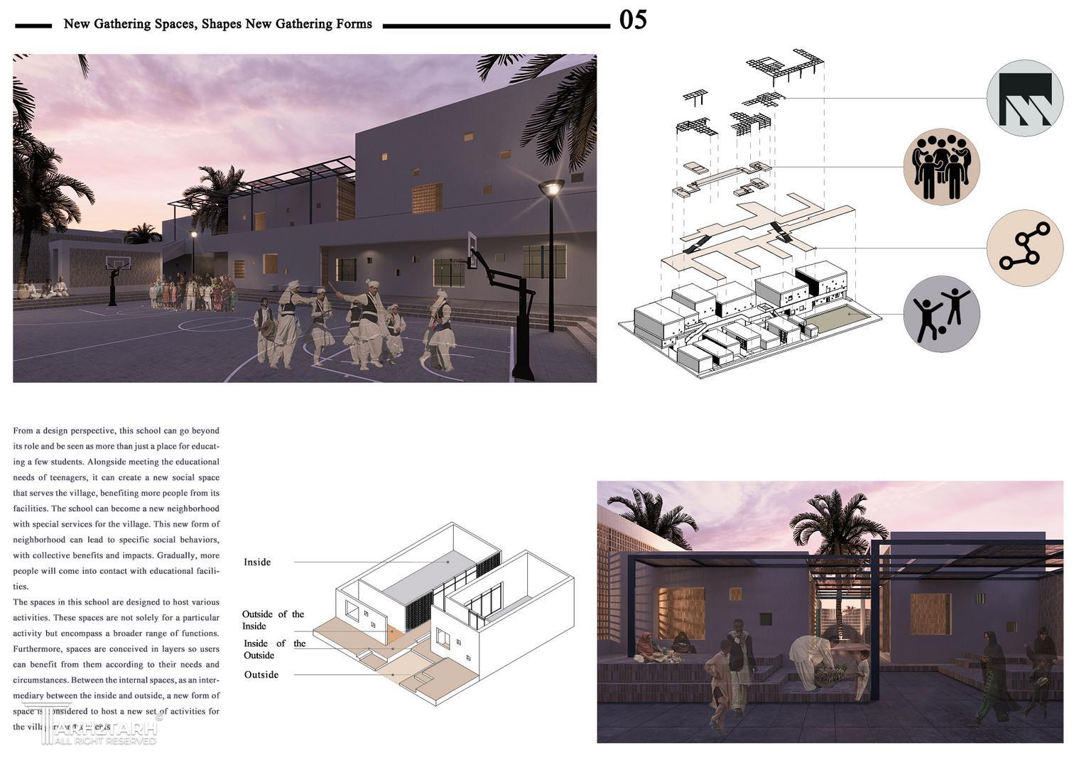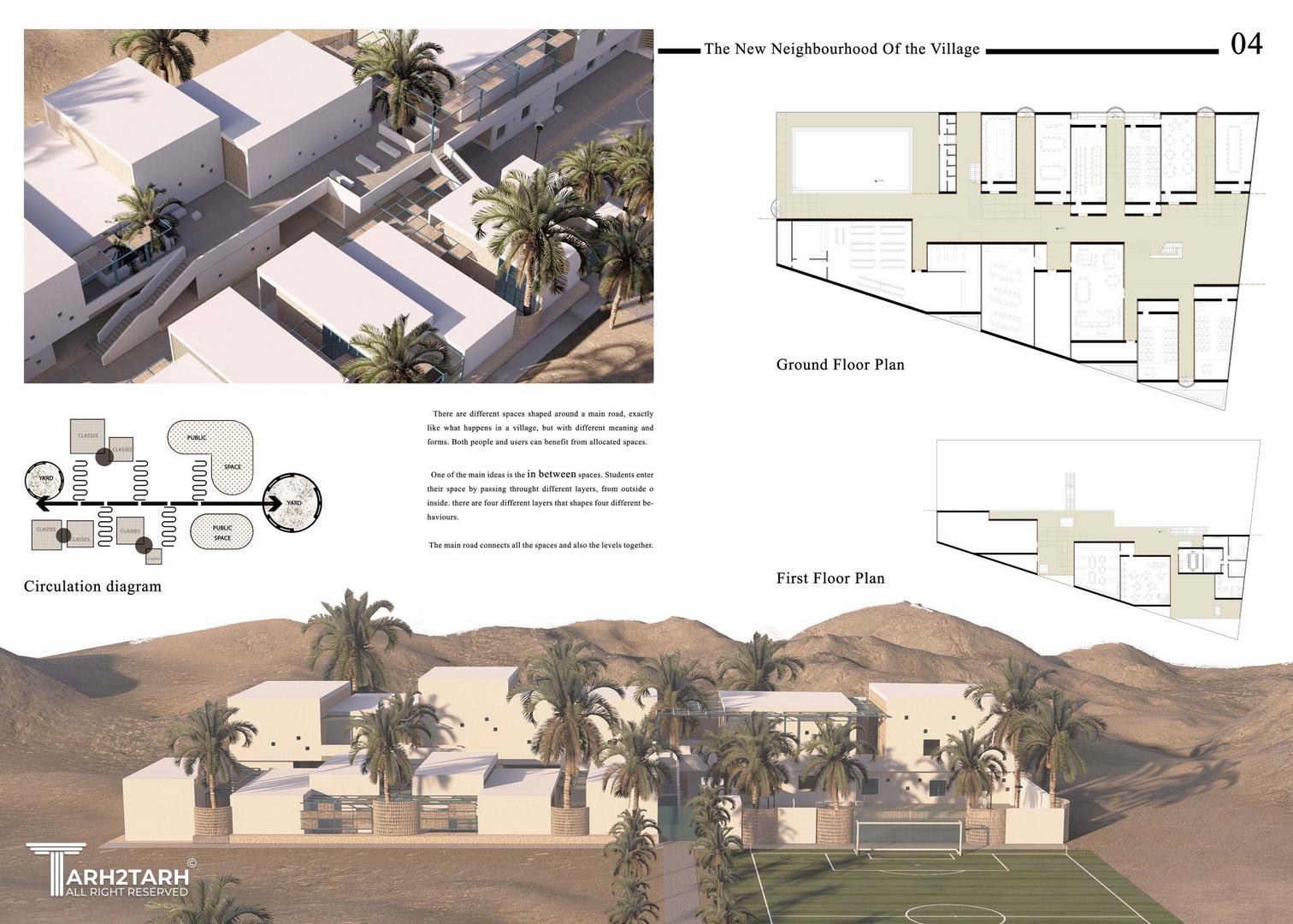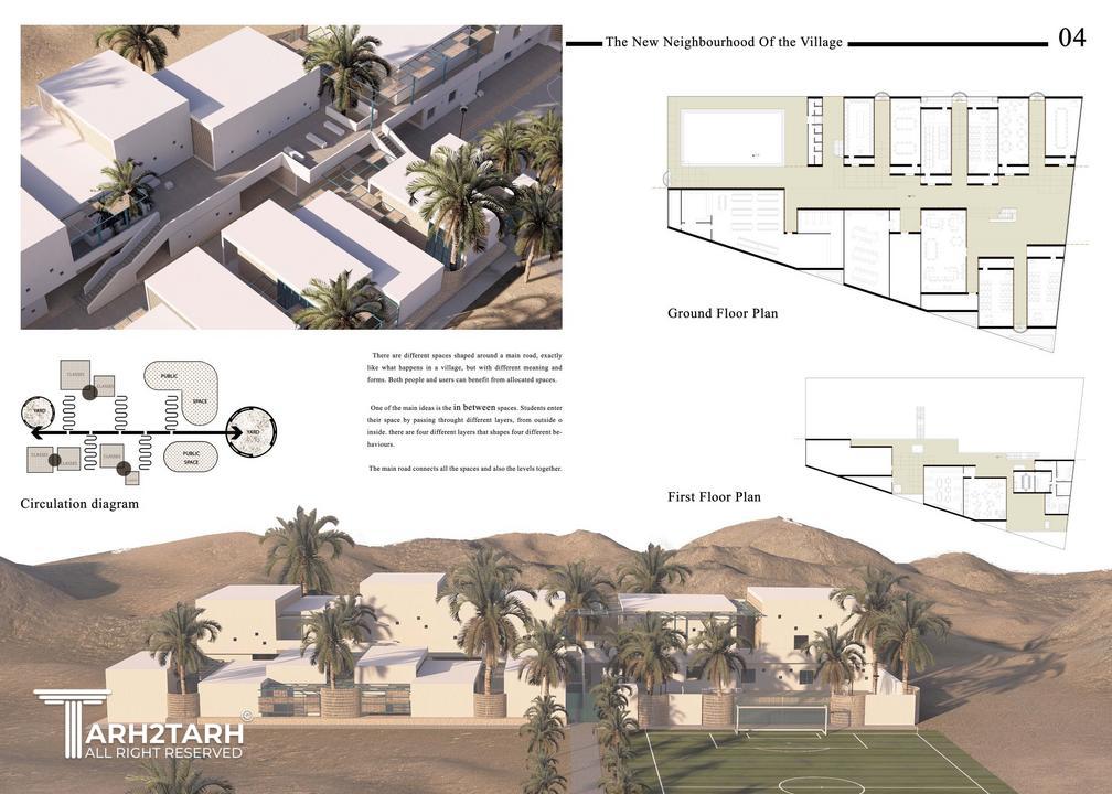 در روند طراحی سعی شد تا نگاه تازه ای به ایده و هویت مدرسه داده شود. هویتی که در واقع پتانسیل شکل دادن هویت روستا را نیز داشته باشد. سعی شد تا مدرسه به مثابه ی محله ای نو در گوشه ی روستا دیده شود تا نه تنها در ارتقا علمی دانش آموزان کمک کند بلکه در ارتقا فرهنگی کلیه ی شهروندان نیز نقش داشته باشد.