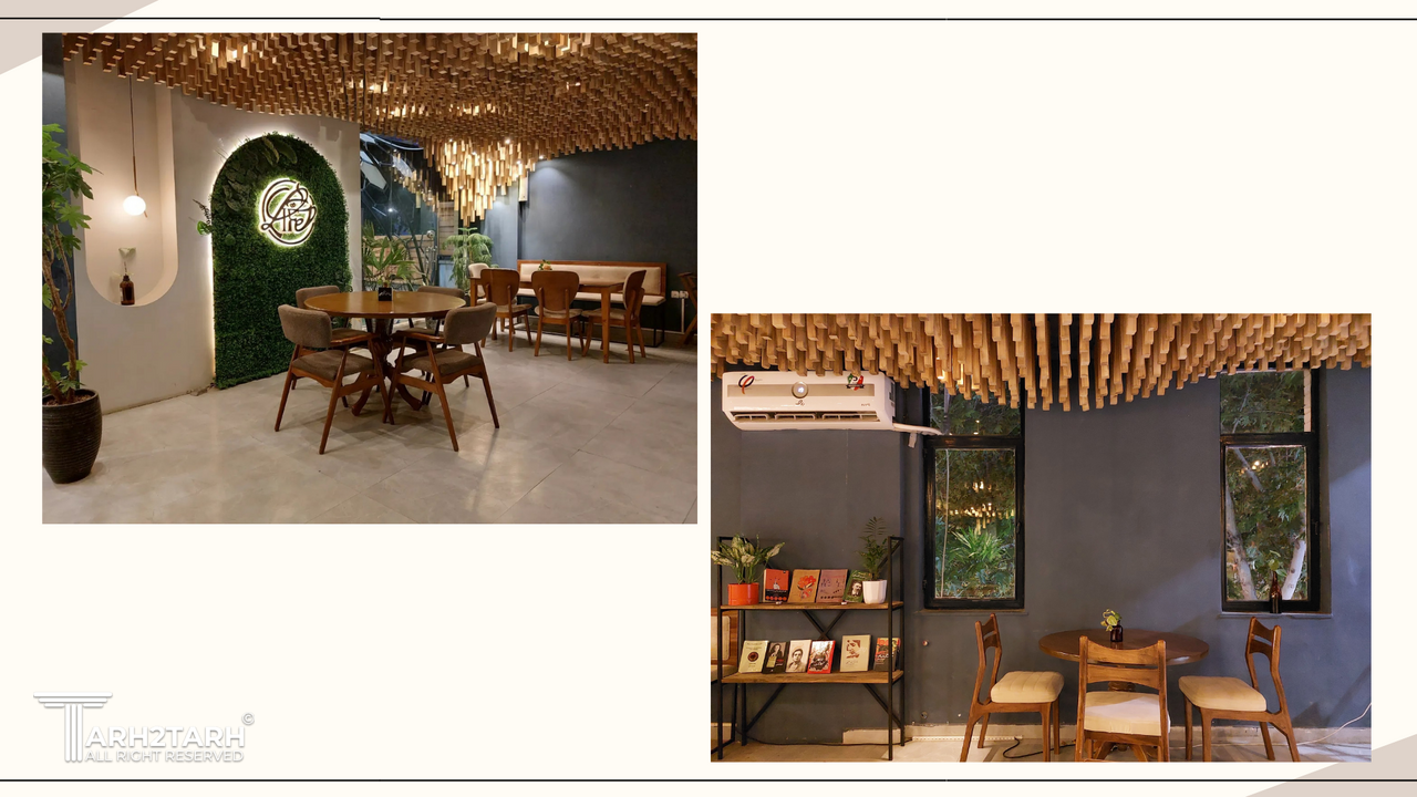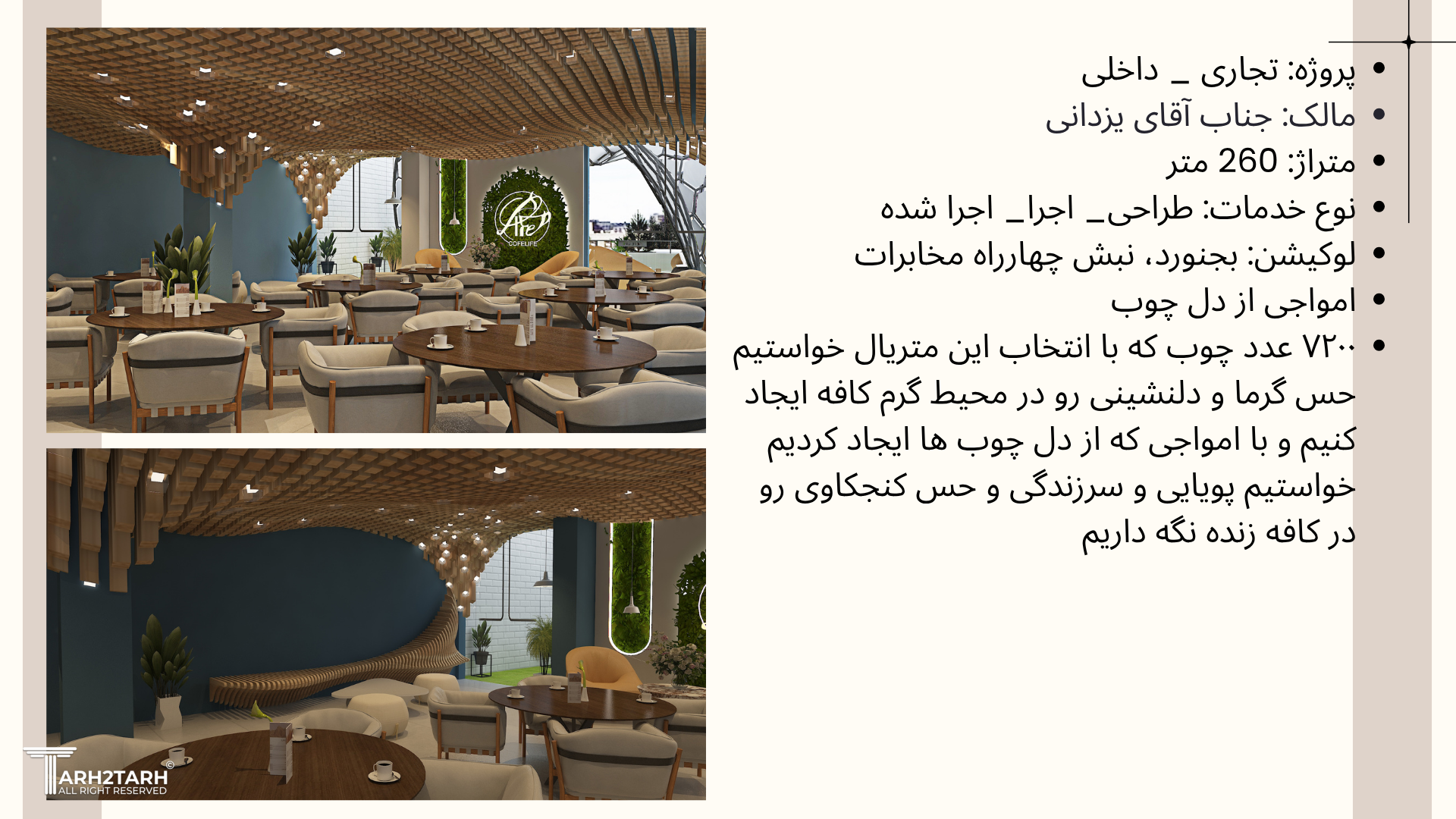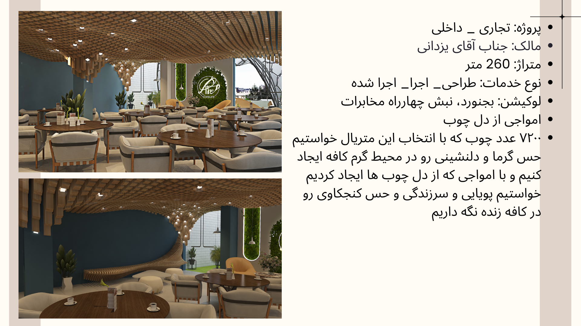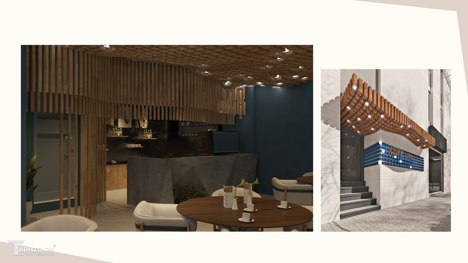 طراحی واجرای این پروژه تجربه ای بسیار متفاوتی برای ما ایجادکرد امواجی از دل چوب ۷۲۰۰عددچوب که با انتخاب این متریال خواستیم حس گرما ودلنشینی رو درمحیط گرم کافه ایجاد کنیم وبا امواجی که از دل چوب ها ایجاد کردیم خواستیم پویایی وکنجکاوی رو درکافه ایجاد کنیم