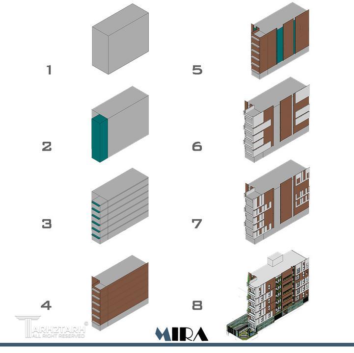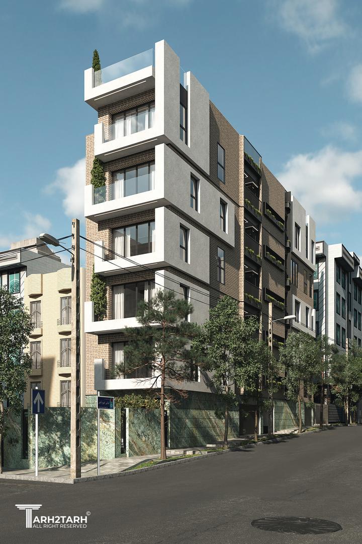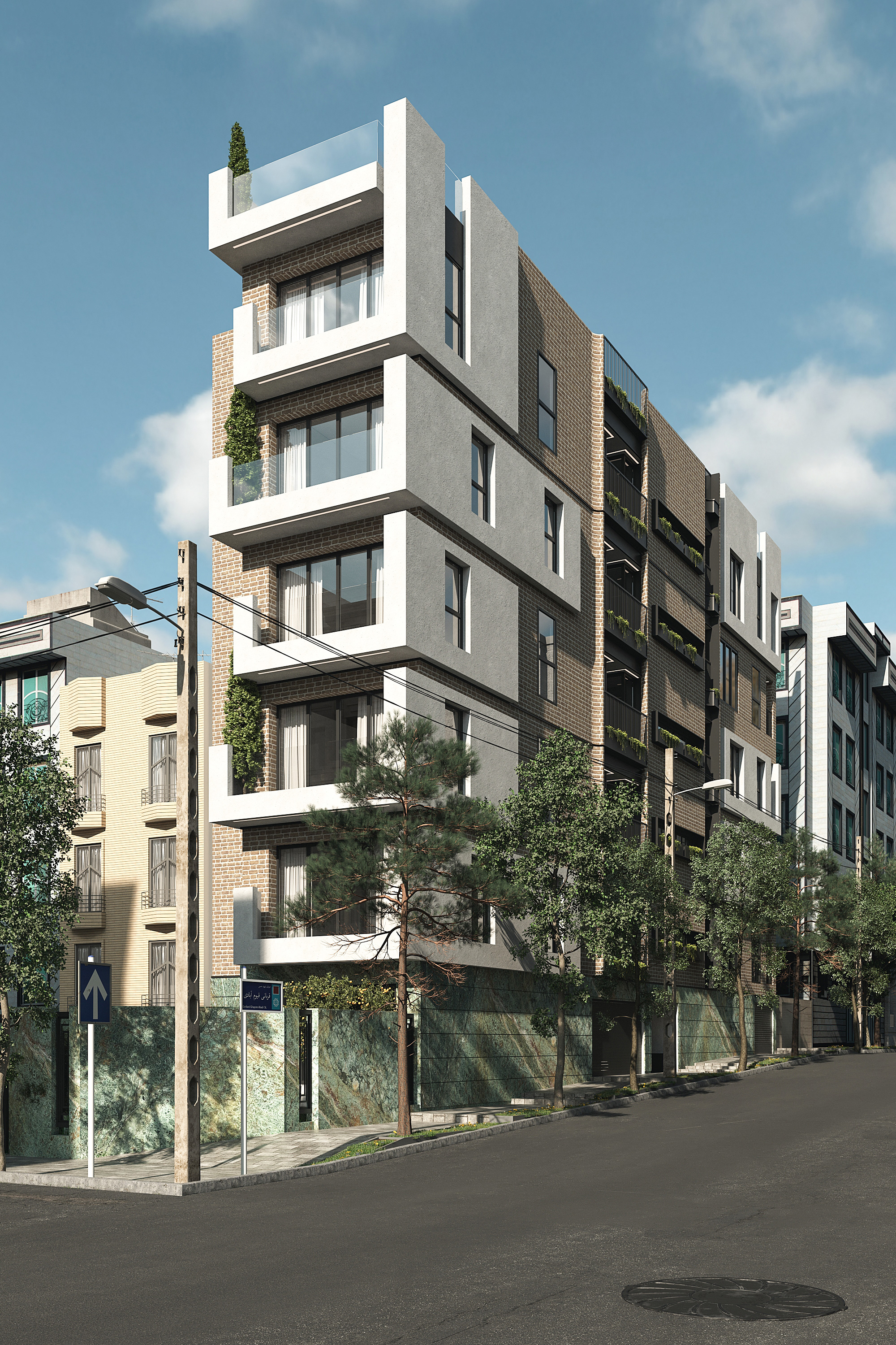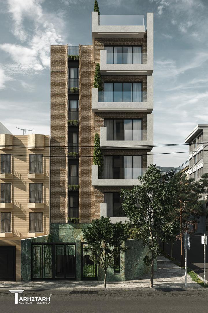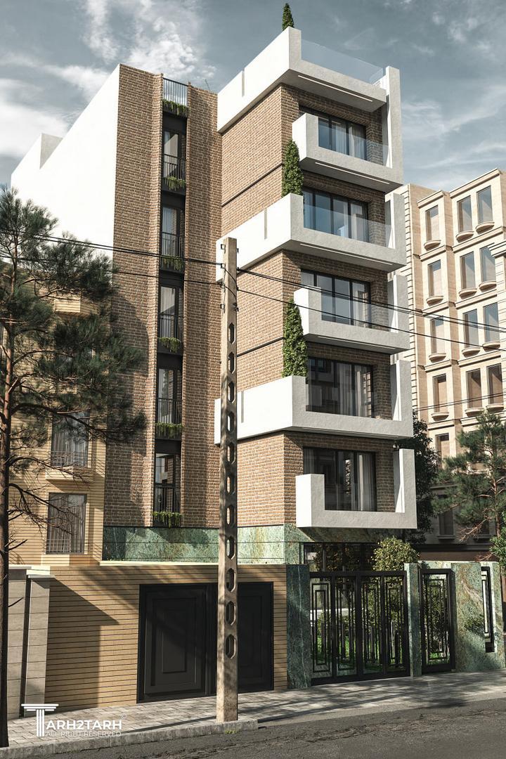 در طراحی این پروژه به دلیل عقب نشینی و کمبود تراکم یا طبقه 6اوم اضافه بشود یا شکست به ملک اضافه بشود که این شکست برای ما تبدیل به یک فرصت شد . ما تصمیم گرفتیم بالکن های این پروژه رو در جلوی این شکستگی قرار بدیم و کل نما رو بافت اجری تصور کردیم
