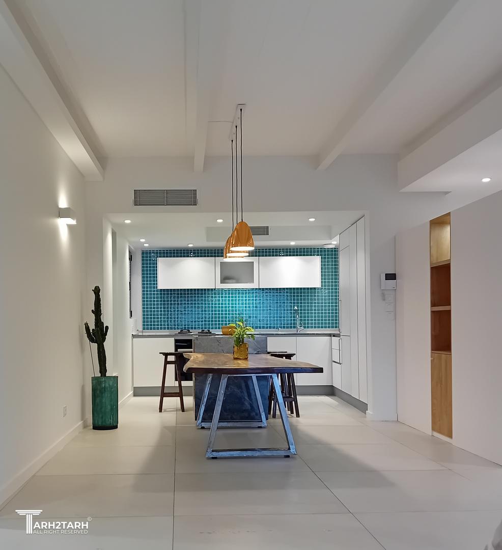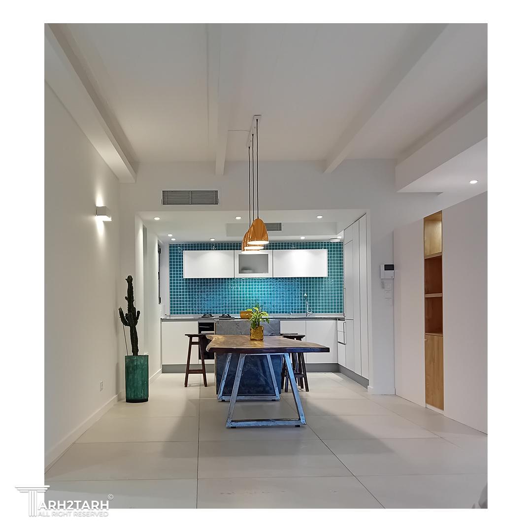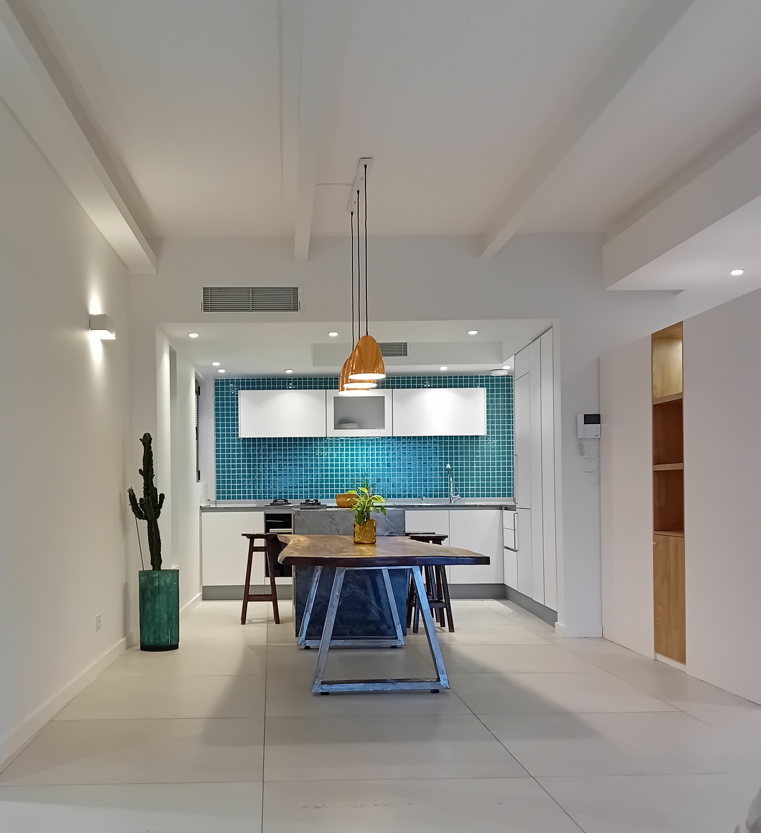 بازآفرینی یک خانه؛ ترکیب سادگی و اصالت ترکیب رنگهای ملایم، متریال طبیعی و طراحی مینیمال، فضایی گرم و صمیمی ایجاد کرده است. کاشیهای سبز آبی در آشپزخانه، حس طراوت و پویایی را به فضا اضافه کرده و کنتراستی چشمنواز با طراحی مدرن به وجود آورده است
