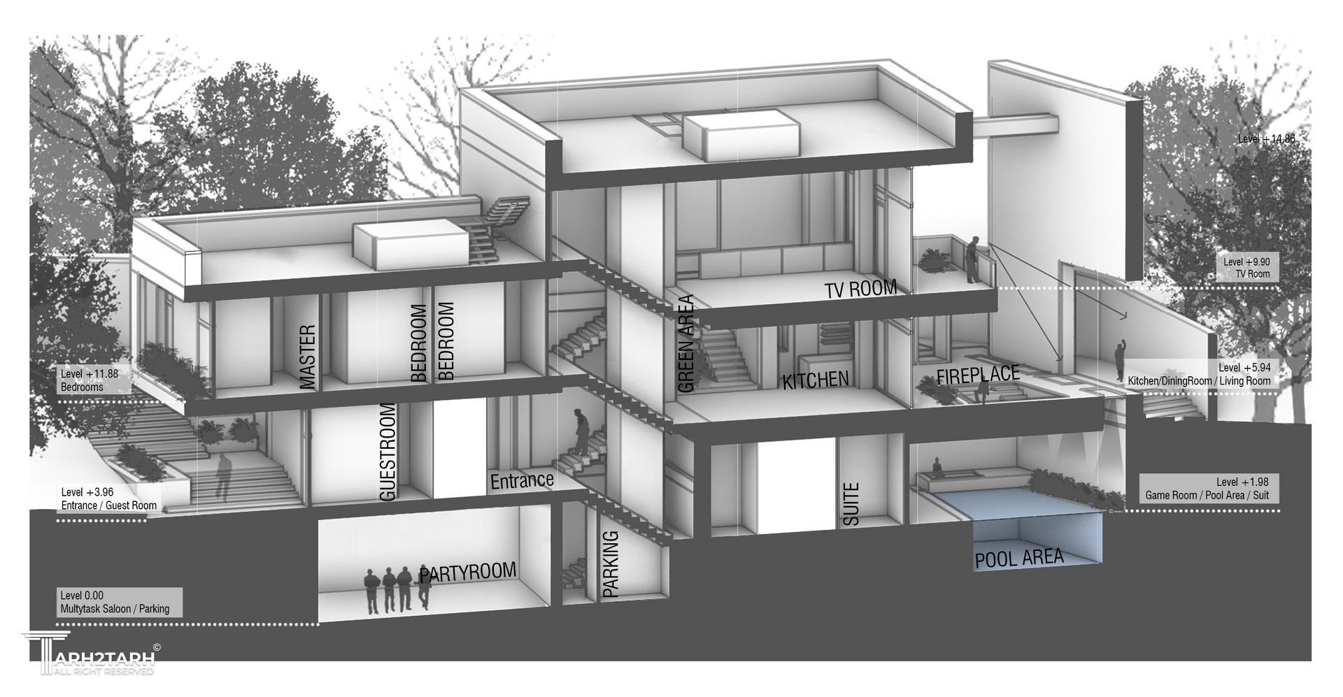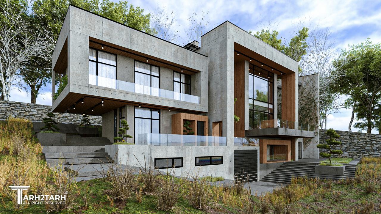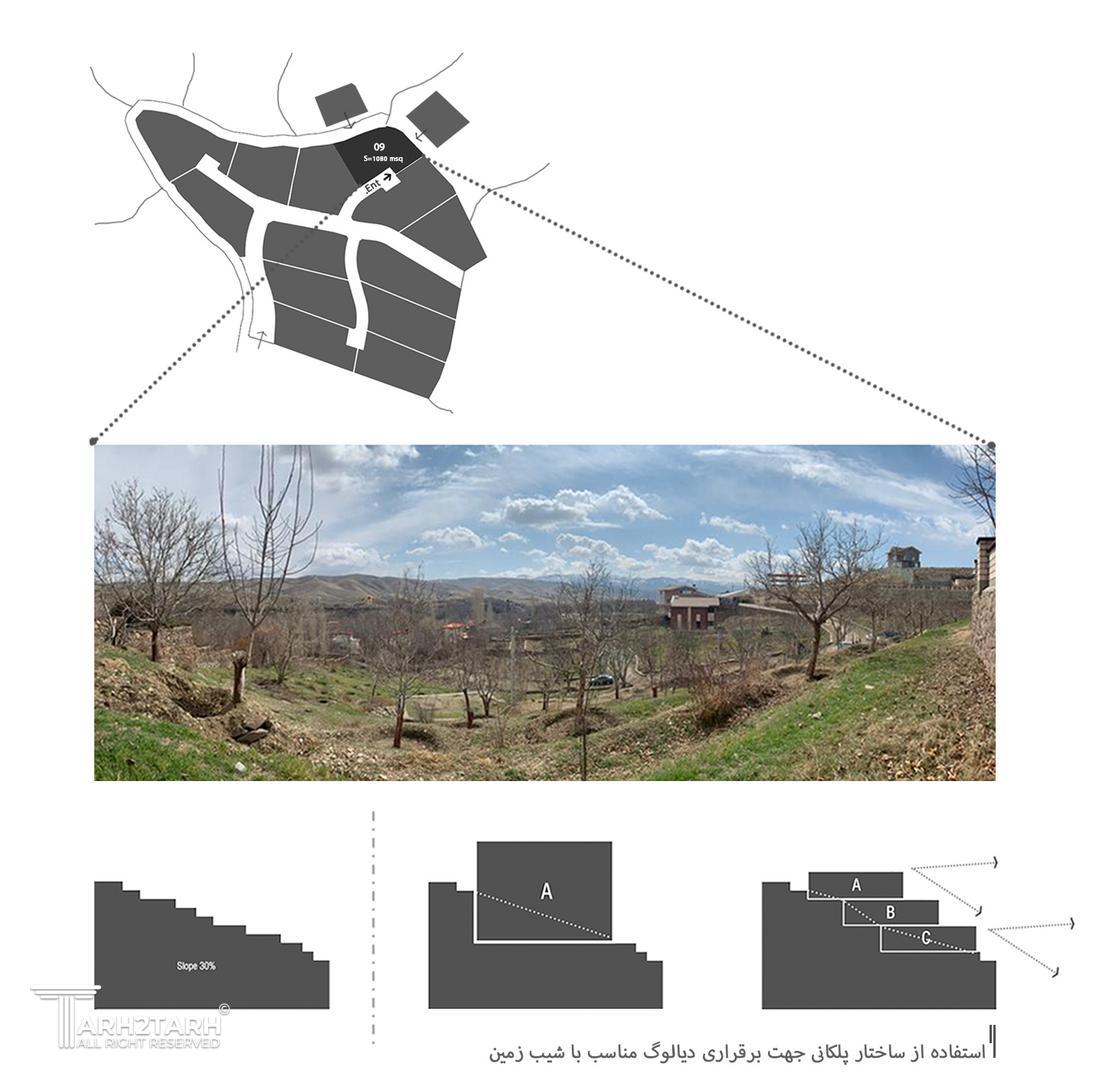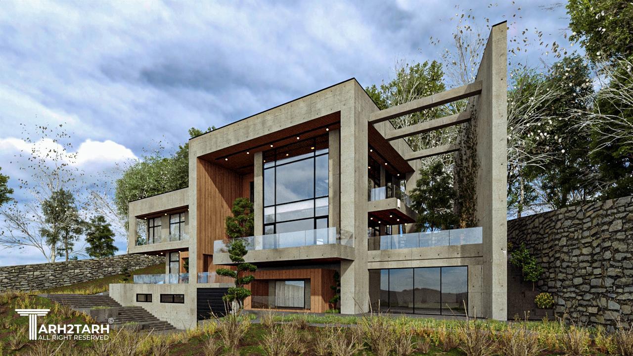 پروژه ویلای بادامستان در گیلاوند تهران در زمینی در یک شهرک خصوصی تعریف شده است. ابتدای امر در برقراری دیالوگ مناسب با شیب زمین، ساختار پلکانی برای بنا در راس طراحی قرار گرفته است. در ادامه بر اساس خواسته اصلی مالک مبنی بر برخورداری از فضاهای جانبی مانند اتاق بازی، استخر، سالن مراسم و یک سوییت جداگانه - همارزش با فضاهای موسوم در یک ویلا - و در عین حال داشتن حریم جداگانه برای هر یک از این فضاها، طراحی حول زون ارتباطی عمودی ساختمان (پله و آسانسور) شکل گرفتهاست که با توجه به کشیدگی شرقی-غربی زمین و در راستای استفاده هر چه بیشتر از نور و منظره جنوبی، عملکردها به طور جداگانه در نیمطبقههایی در شرق و غرب رون جانمایی شدهاند تا در عین ارتباط، هر یک دارای حریم نیز باشند. همچنین با توجه به همجواری سایت با ویلاهای مشرف در ضلع شمالی، بازشوهای ساختمان در این جهت محدود شده و در مقابل، ضلع جنوبی به سمت دید 180 درجه به چشمانداز زیبا آن کاملا گشوده شده است. از طرفی دیواره بلند شرقی مانع اشراف همسایه این امتداد به تراس بزرگ اصلی و بخش نیمه خصوصی ویلا خواهد بود. پله در این پروژه به عنوان یک زون جدا تعریف شده است. زون میانی و واسط که کاربری های مختلف ویلا را در نیم طبقه های شرقی و غربی به هم مرتبط می کند. تاثیر ان در نما هم در غالب یک حجم شیشه ای برون گرا در میانه ساختمان مشهود می باشد کهن که توسط تک درخت بلند جلوی ان مورد تاکید واقع می شود