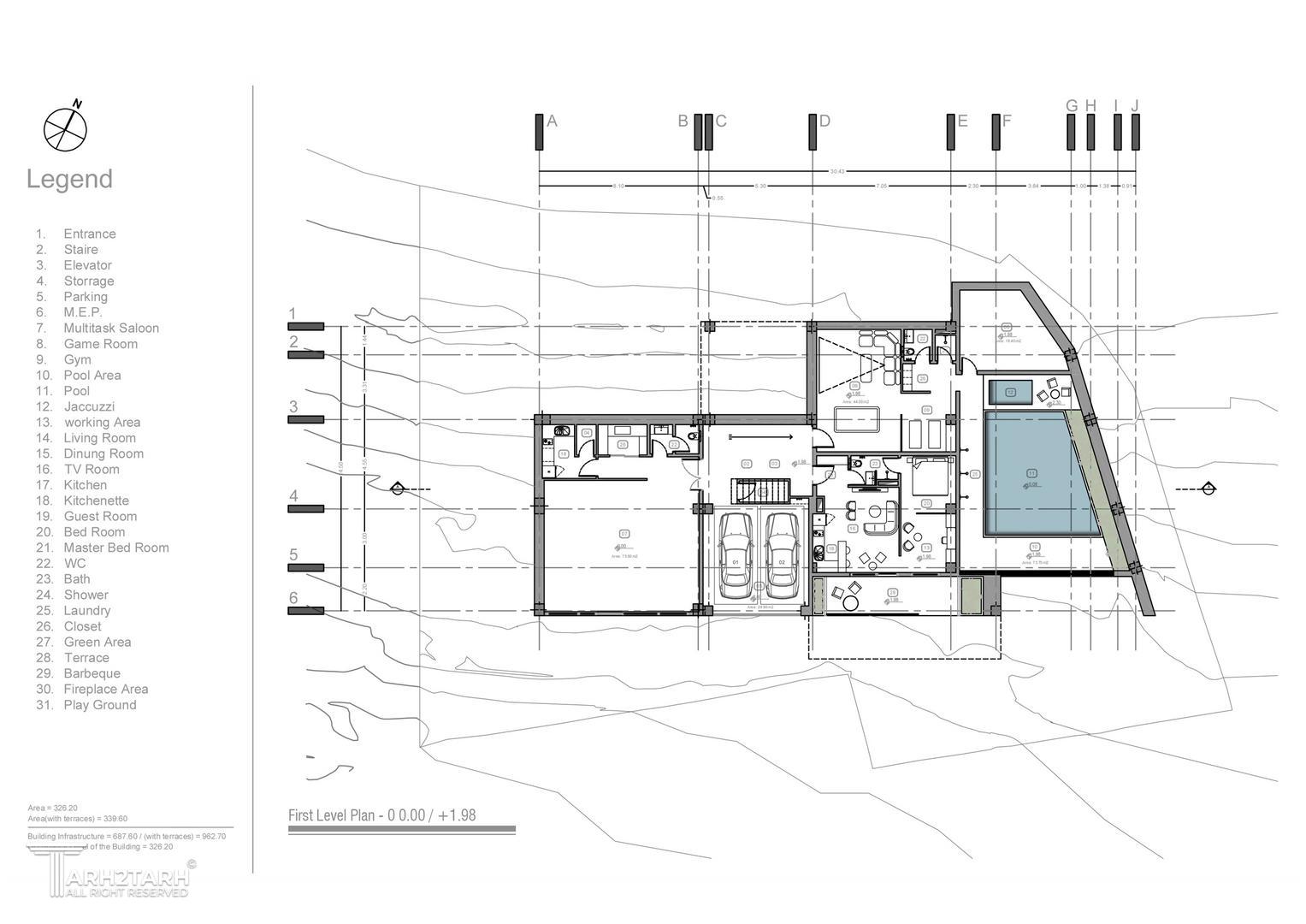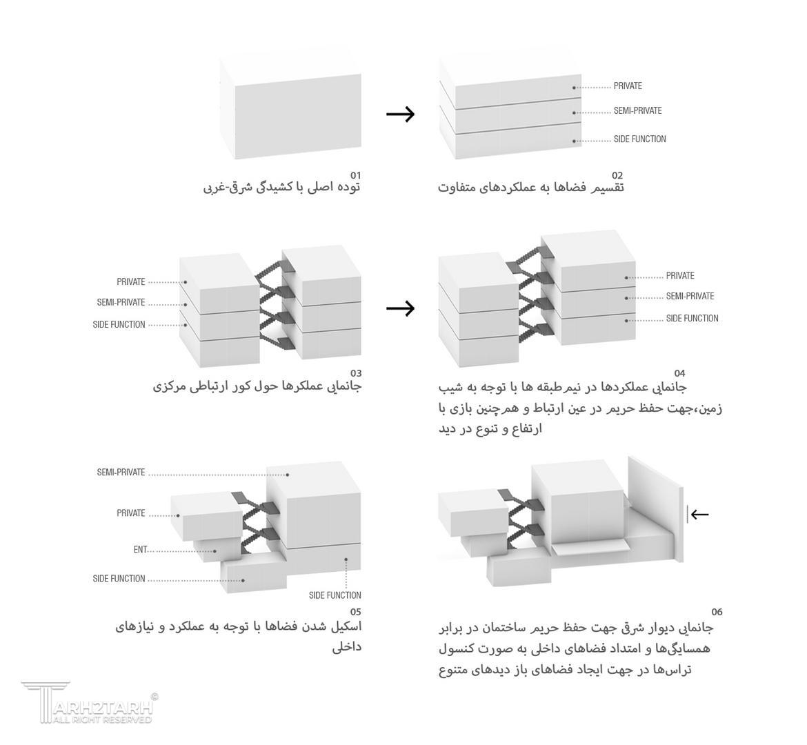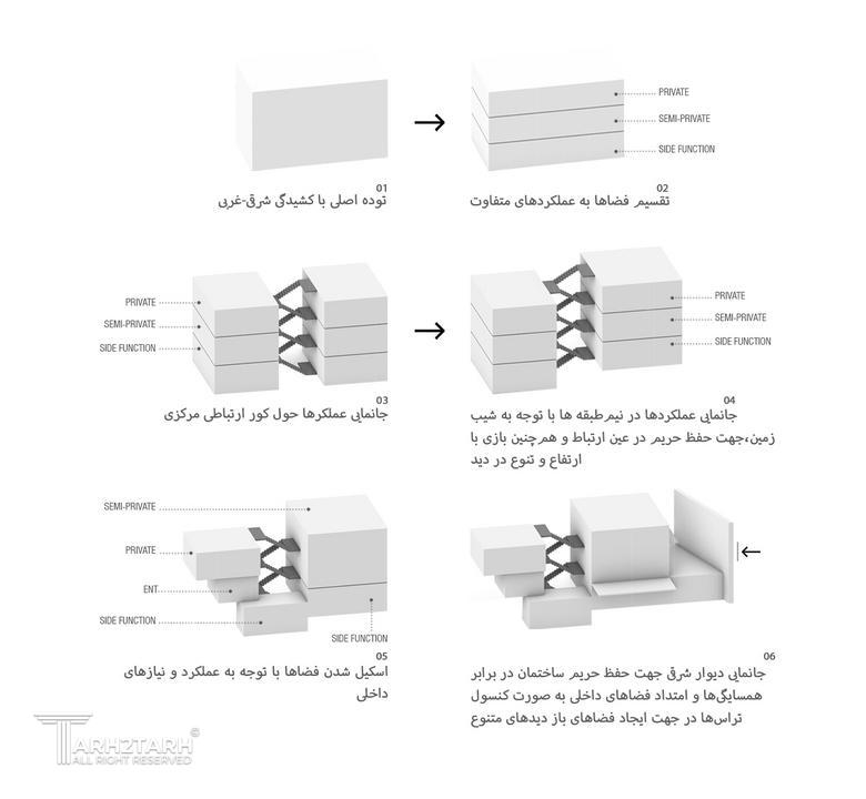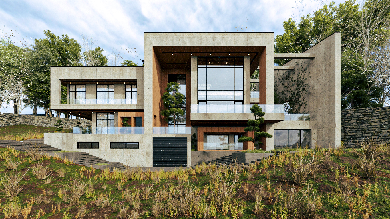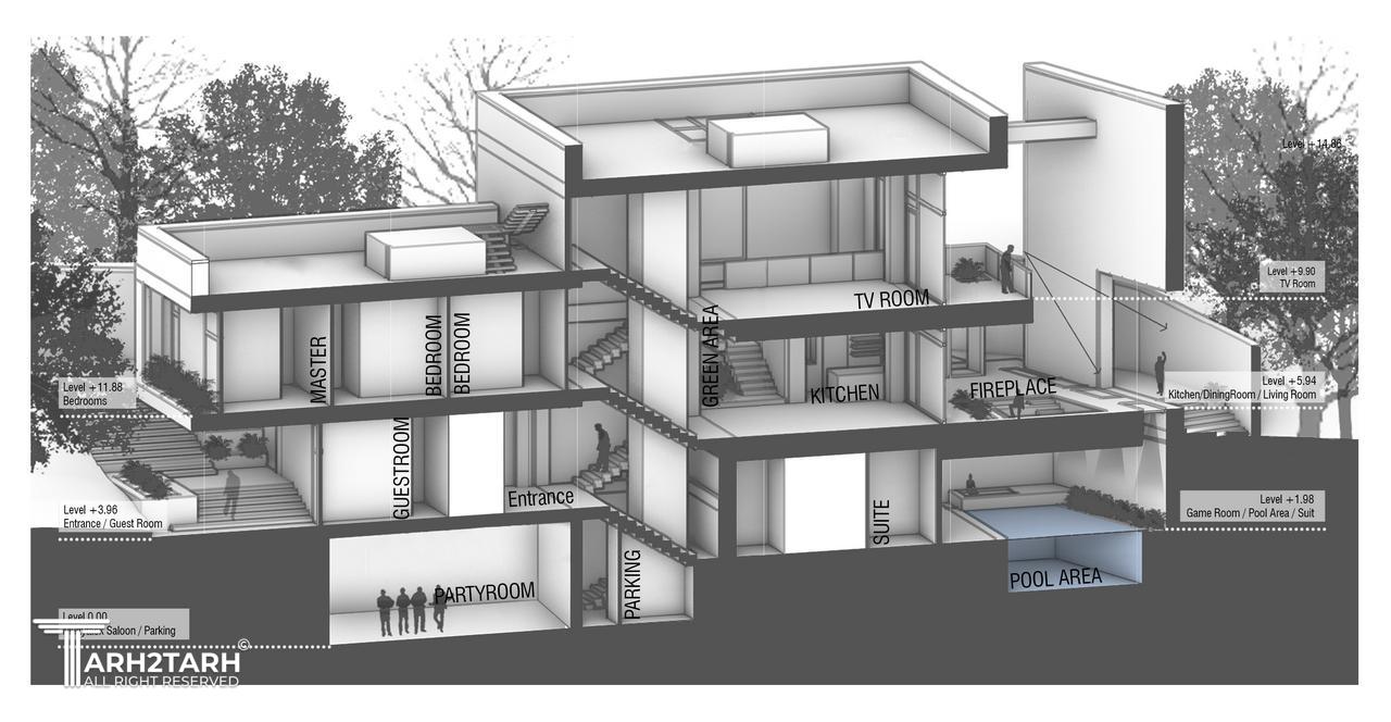پروژه ویلای بادامستان در گیلاوند تهران در زمینی در یک شهرک خصوصی تعریف شده است. ابتدای امر در برقراری دیالوگ مناسب با شیب زمین، ساختار پلکانی برای بنا در راس طراحی قرار گرفته است. در ادامه بر اساس خواسته اصلی مالک مبنی بر برخورداری از فضاهای جانبی مانند اتاق بازی، استخر، سالن مراسم و یک سوییت جداگانه - همارزش با فضاهای موسوم در یک ویلا - و در عین حال داشتن حریم جداگانه برای هر یک از این فضاها، طراحی حول زون ارتباطی عمودی ساختمان (پله و آسانسور) شکل گرفتهاست که با توجه به کشیدگی شرقی-غربی زمین و در راستای استفاده هر چه بیشتر از نور و منظره جنوبی، عملکردها به طور جداگانه در نیمطبقههایی در شرق و غرب رون جانمایی شدهاند تا در عین ارتباط، هر یک دارای حریم نیز باشند. همچنین با توجه به همجواری سایت با ویلاهای مشرف در ضلع شمالی، بازشوهای ساختمان در این جهت محدود شده و در مقابل، ضلع جنوبی به سمت دید 180 درجه به چشمانداز زیبا آن کاملا گشوده شده است. از طرفی دیواره بلند شرقی مانع اشراف همسایه این امتداد به تراس بزرگ اصلی و بخش نیمه خصوصی ویلا خواهد بود. پله در این پروژه به عنوان یک زون جدا تعریف شده است. زون میانی و واسط که کاربری های مختلف ویلا را در نیم طبقه های شرقی و غربی به هم مرتبط می کند. تاثیر ان در نما هم در غالب یک حجم شیشه ای برون گرا در میانه ساختمان مشهود می باشد کهن که توسط تک درخت بلند جلوی ان مورد تاکید واقع می شود