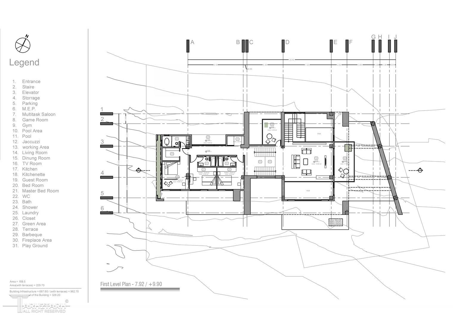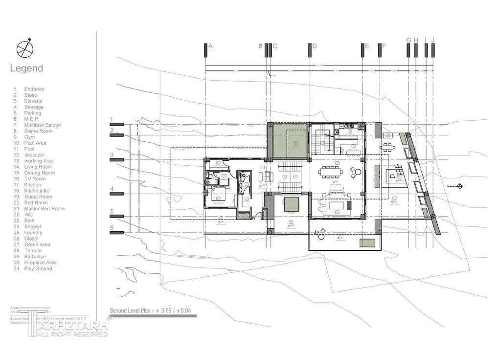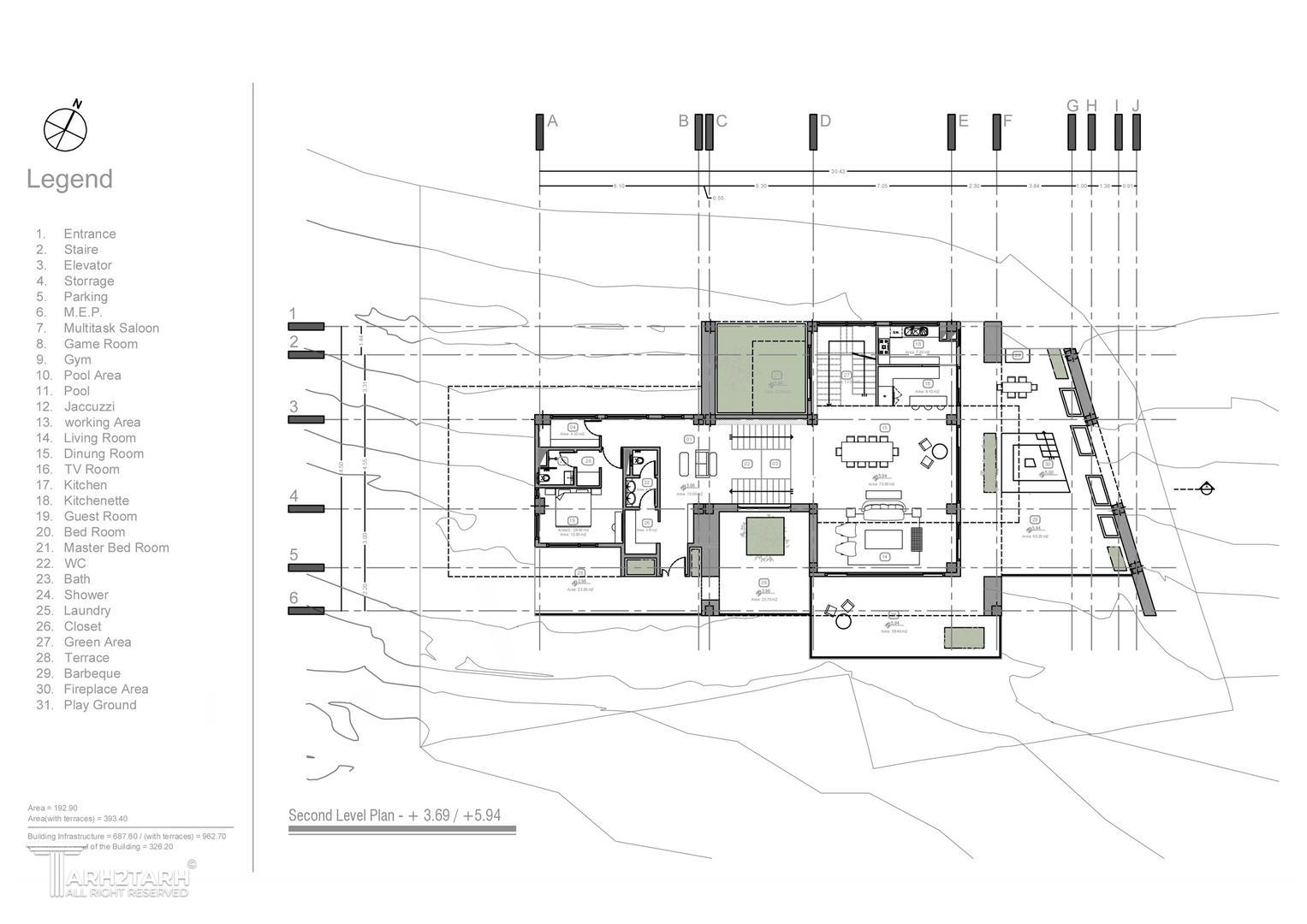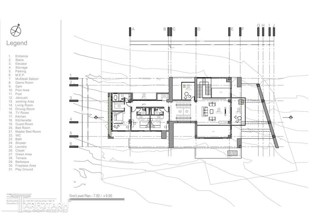پروژه ویلای بادامستان در گیلاوند تهران در زمینی در یک شهرک خصوصی تعریف شده است. ابتدای امر در برقراری دیالوگ مناسب با شیب زمین، ساختار پلکانی برای بنا در راس طراحی قرار گرفته است. در ادامه بر اساس خواسته اصلی مالک مبنی بر برخورداری از فضاهای جانبی مانند اتاق بازی، استخر، سالن مراسم و یک سوییت جداگانه - همارزش با فضاهای موسوم در یک ویلا - و در عین حال داشتن حریم جداگانه برای هر یک از این فضاها، طراحی حول زون ارتباطی عمودی ساختمان (پله و آسانسور) شکل گرفتهاست که با توجه به کشیدگی شرقی-غربی زمین و در راستای استفاده هر چه بیشتر از نور و منظره جنوبی، عملکردها به طور جداگانه در نیمطبقههایی در شرق و غرب رون جانمایی شدهاند تا در عین ارتباط، هر یک دارای حریم نیز باشند. همچنین با توجه به همجواری سایت با ویلاهای مشرف در ضلع شمالی، بازشوهای ساختمان در این جهت محدود شده و در مقابل، ضلع جنوبی به سمت دید 180 درجه به چشمانداز زیبا آن کاملا گشوده شده است. از طرفی دیواره بلند شرقی مانع اشراف همسایه این امتداد به تراس بزرگ اصلی و بخش نیمه خصوصی ویلا خواهد بود. پله در این پروژه به عنوان یک زون جدا تعریف شده است. زون میانی و واسط که کاربری های مختلف ویلا را در نیم طبقه های شرقی و غربی به هم مرتبط می کند. تاثیر ان در نما هم در غالب یک حجم شیشه ای برون گرا در میانه ساختمان مشهود می باشد کهن که توسط تک درخت بلند جلوی ان مورد تاکید واقع می شود