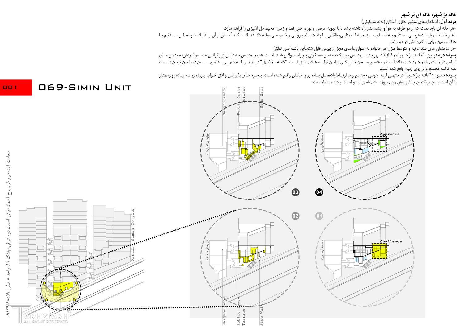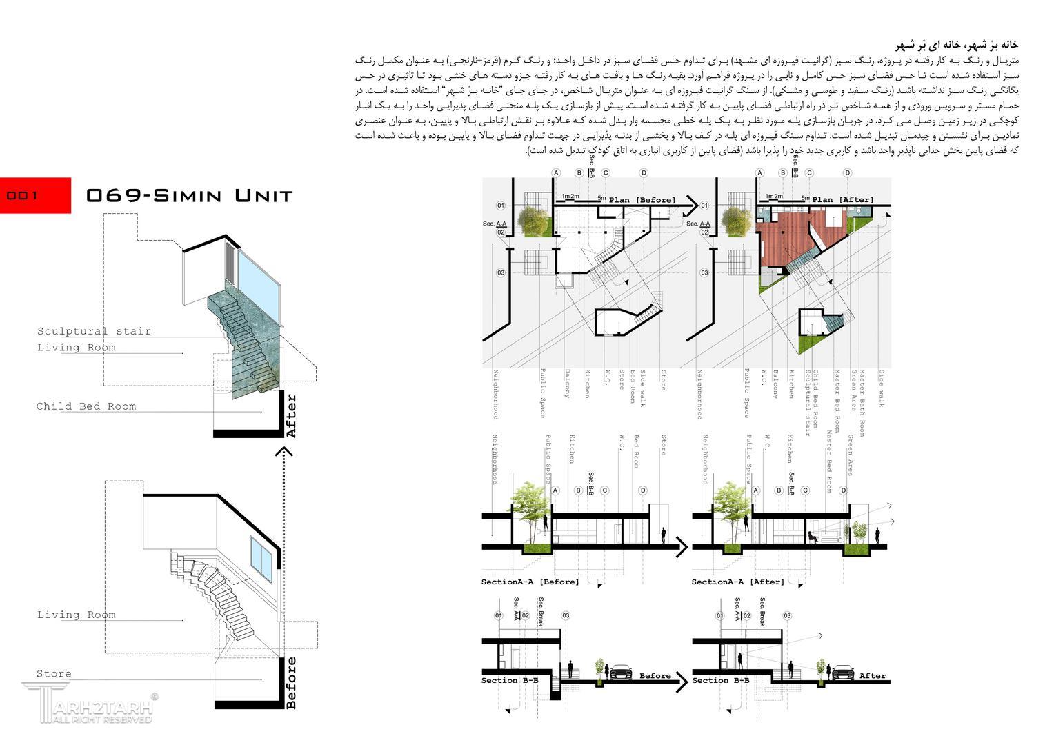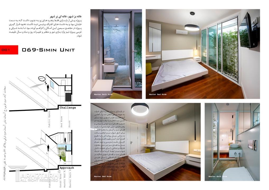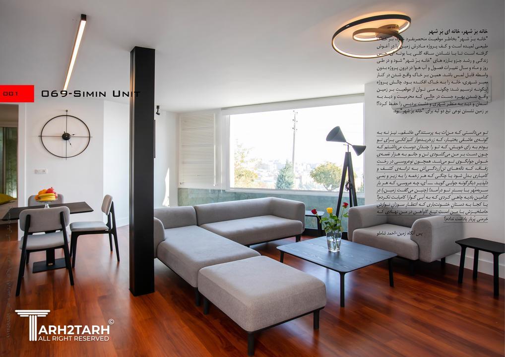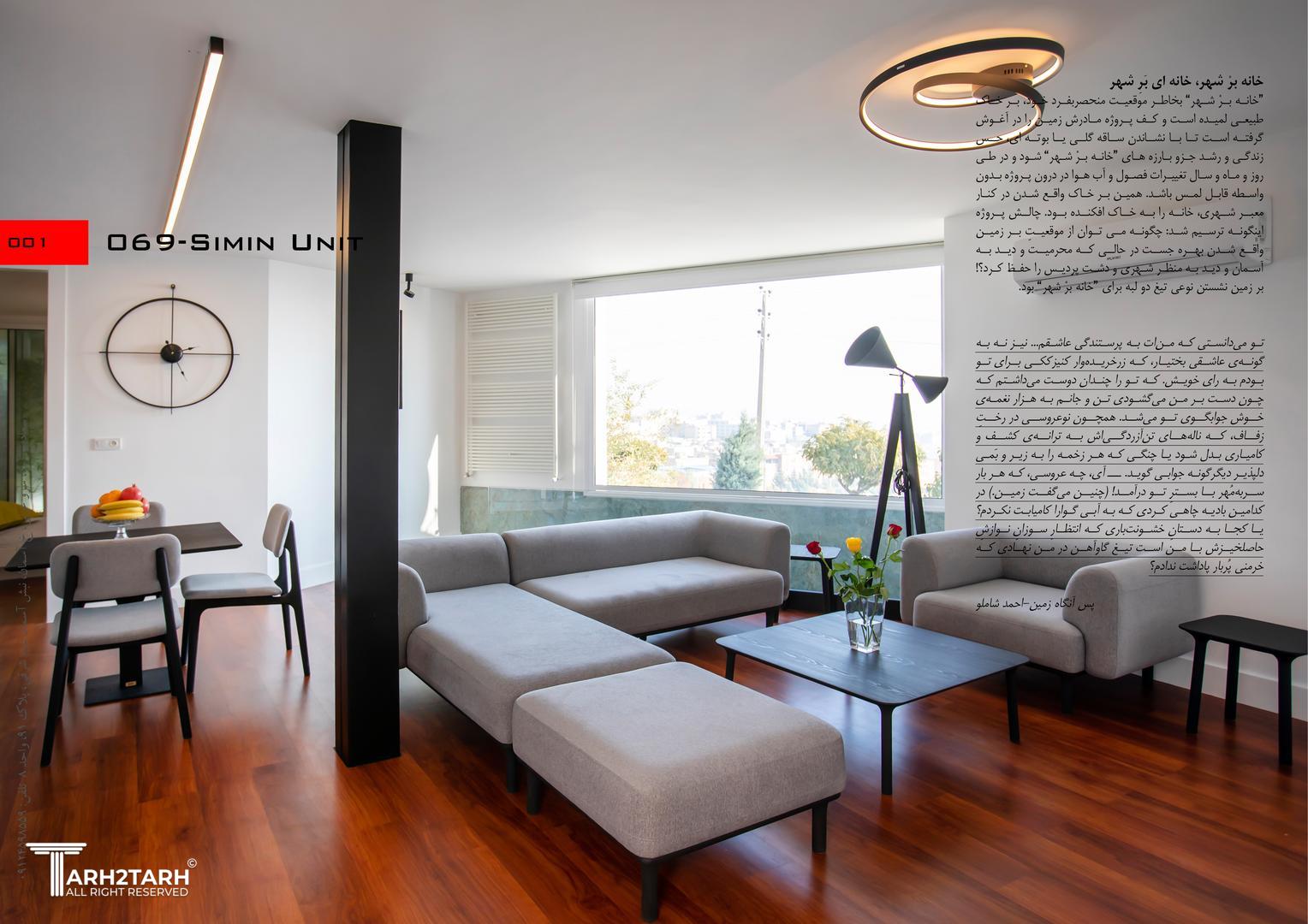 پروژه سیمین یک واحد مسکونی در منتهی الیه مجتمع سیمین است که به دلیل موقعیت خاص زمین مجتمع، واحد بر روی زمین واقع شده است و ما از این امکان پروژه برای کشیدن فضای سبز به داخل واحد استفاده کردیم و تلاش کردیم که با کنترل محرمیت در جداره پیاده رو بهترین نورگیری را برای واحد فراهم کنیم