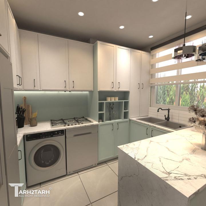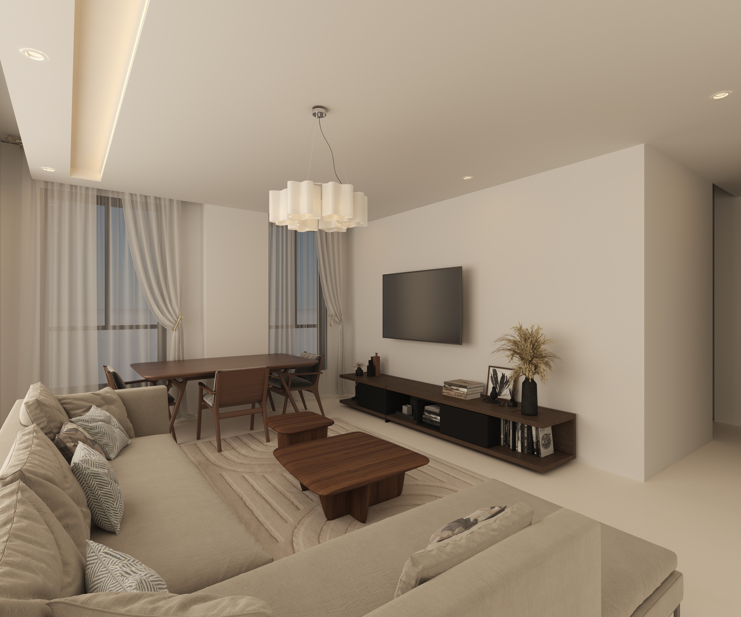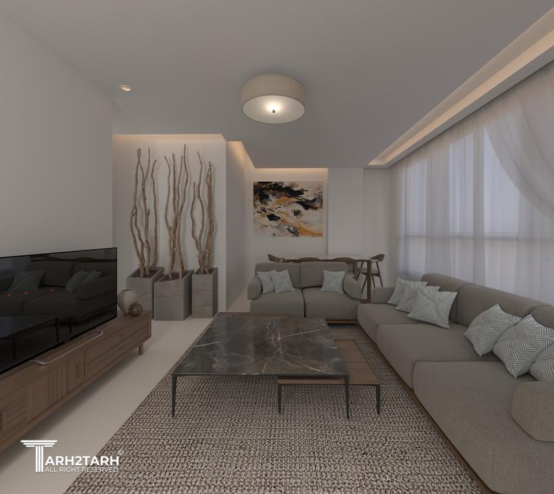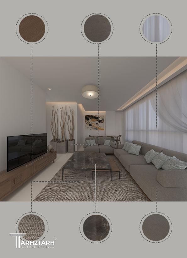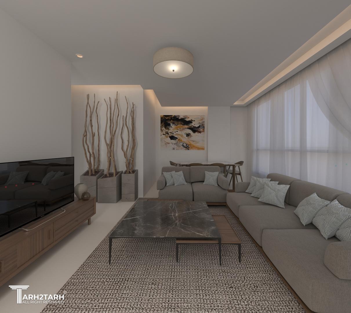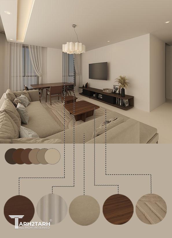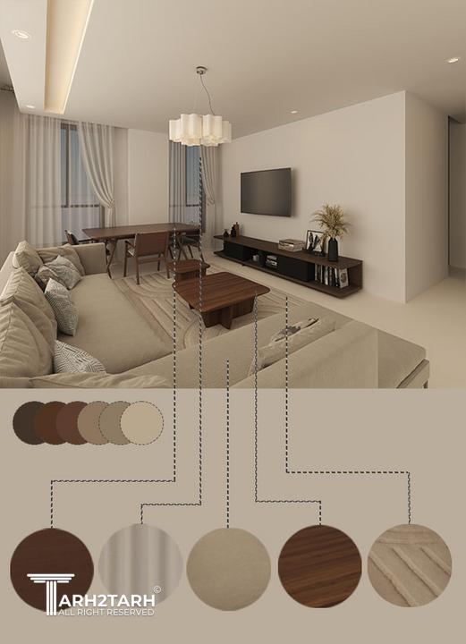 این طراحی داخلی به سبک مدرن است. پالت رنگی خنثی (کرم و بژ) با استفاده از چوب تیره برای مبلمان، کنتراست گرمی ایجاد کرده است. نورپردازی چند لایه با استفاده از نورهای مخفی خطی در سقف ، جلوه بصری فضا را تکمیل میکند.
