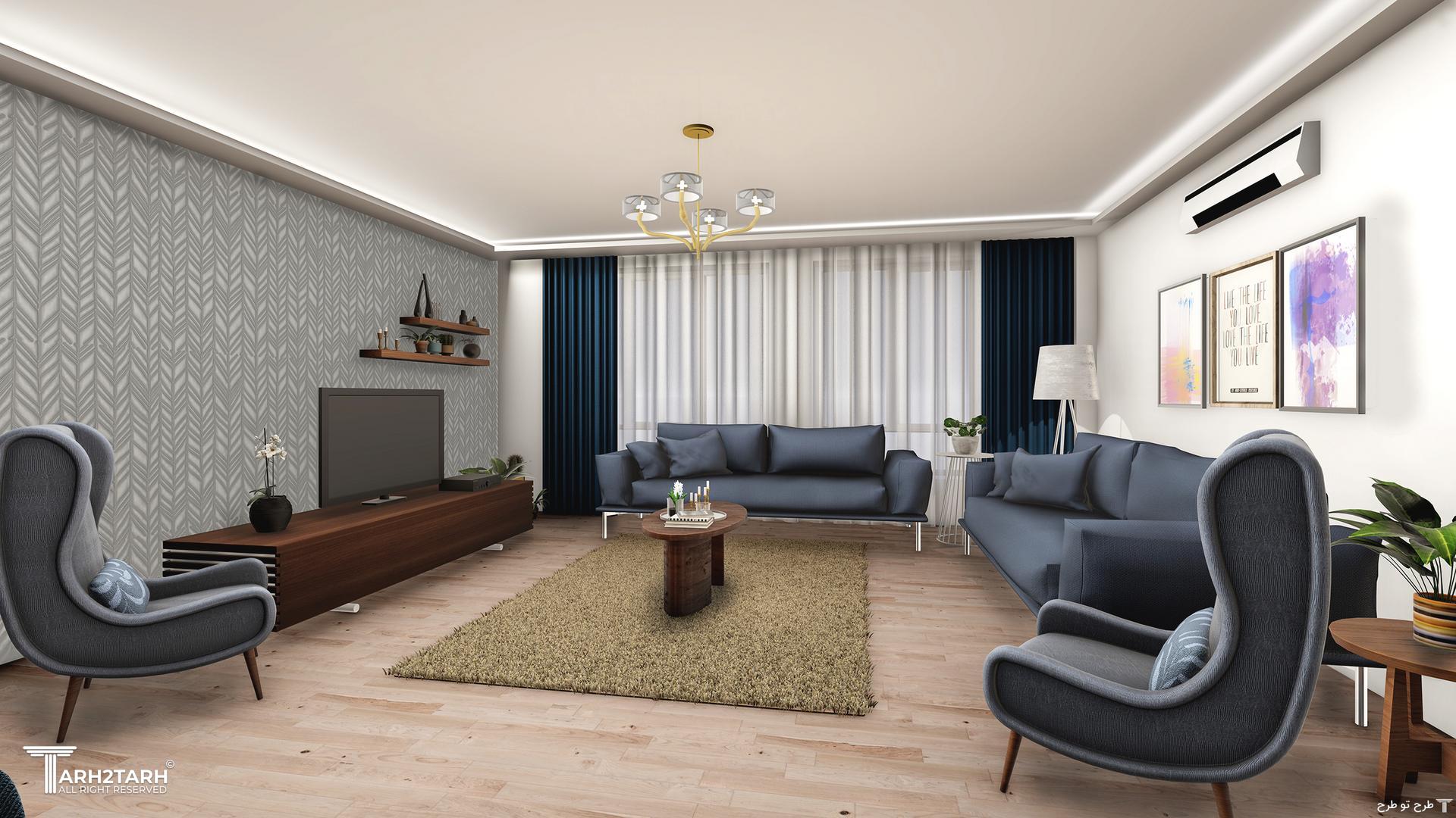 دیوار پشت تلویزیون کاغذ دیواری،کف لمینت،دیوارها و سقف رنگ اکرلیک یا روغنی در نظر گرفته شده است. و دکورهای دیواری هم ام دی اف در نظر گرفته شده،سقف کاذب هم کناف در نظر گرفته شده است.(رنگ تمامی فضاها به انتخاب کارفرما می تواند روغنی یا اکرلیک باشد تفاوت