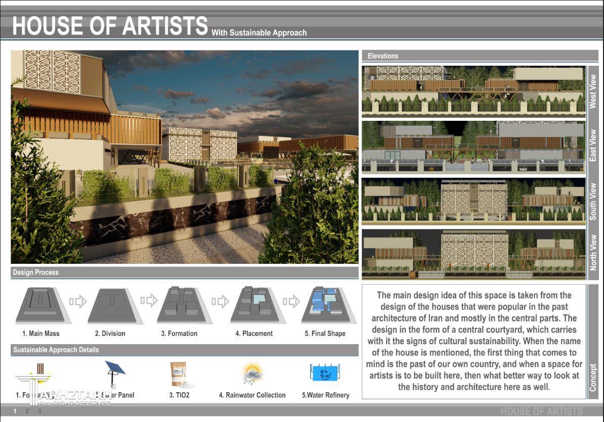 ایده اصلی طراحی این فضا از طرح خانههایی گرفته شده که در معماری گذشته ایران و بیشتر در قسمتهای مرکزی رواج داشتهاند. طرحی به شکل حیاط مرکزی که نشانههایی از پایداری فرهنگی را با خود به همراه دارد. وقتی اسم خانه به میان میآید، اولین چیزی که به ذهن میرسد گذشته کشورمان خودمان است و وقتی قرار است فضایی برای هنرمندان در اینجا ساخته شود، پس چه بهتر که به تاریخ و معماری اینجا نیز نگاهی بیندازیم. برای داشتن فضایی بدون ستون، سیستم سقف وافل روی سقف تمام طبقات نصب شده است که تا شانزده متر را پوشش میدهد. برای انتقال بار قطعات کنسول از سیستم خرپا استفاده شده است و سیستمی هماهنگ با جهت خورشید برای پوسته تغییر شکلپذیر نصب شده است.