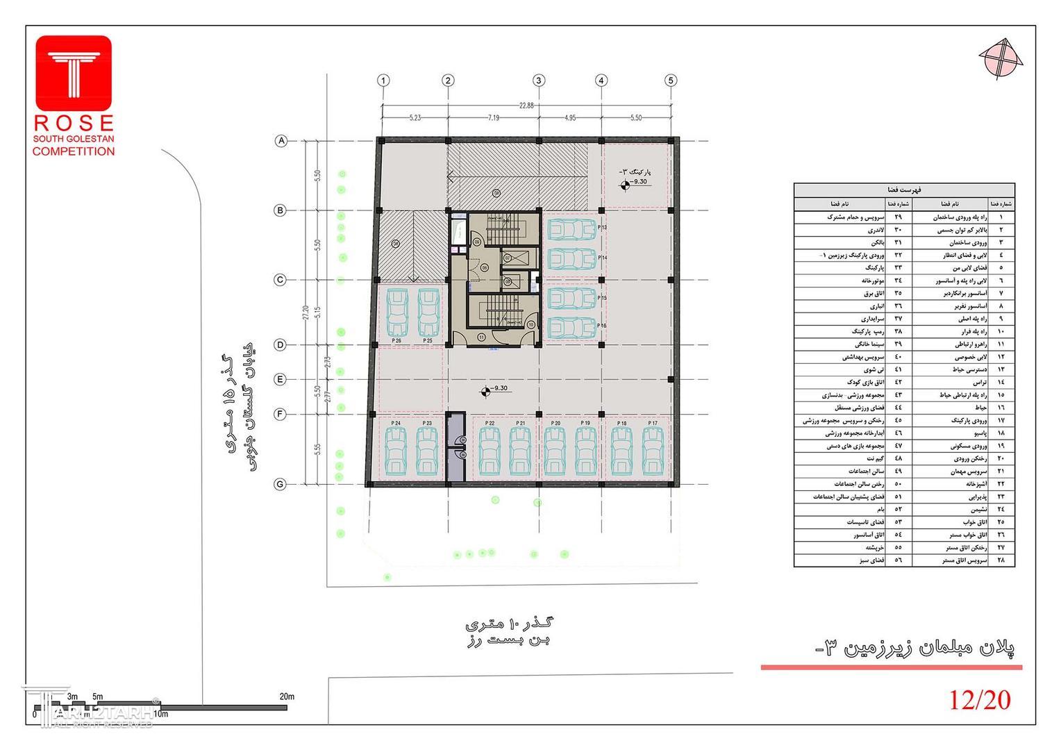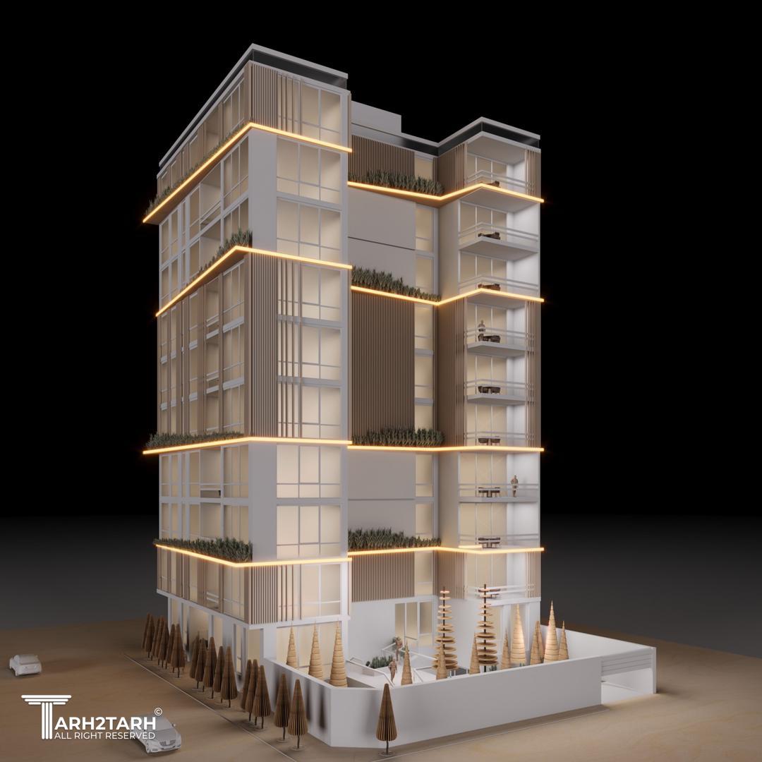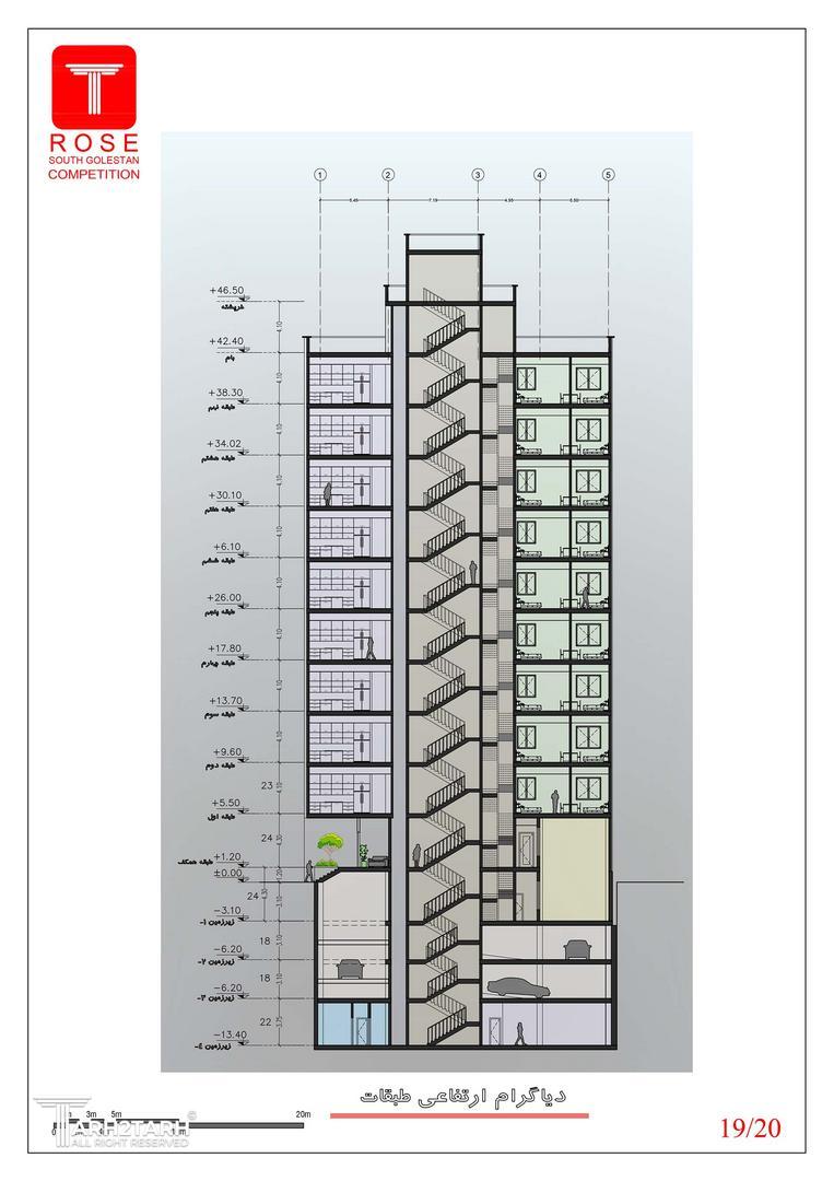 ساختمان مسکونی رُز با متراژ زمین ۸۴۳/۴۱ مترمربع شامل ۹ طبقه مسکونی روی همکف و ۴ طبقه زیرزمین میباشد.