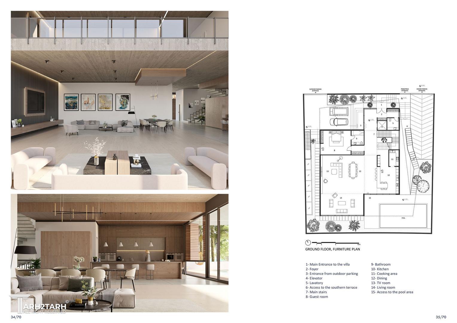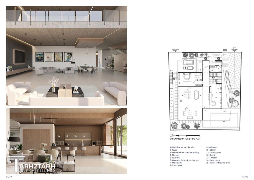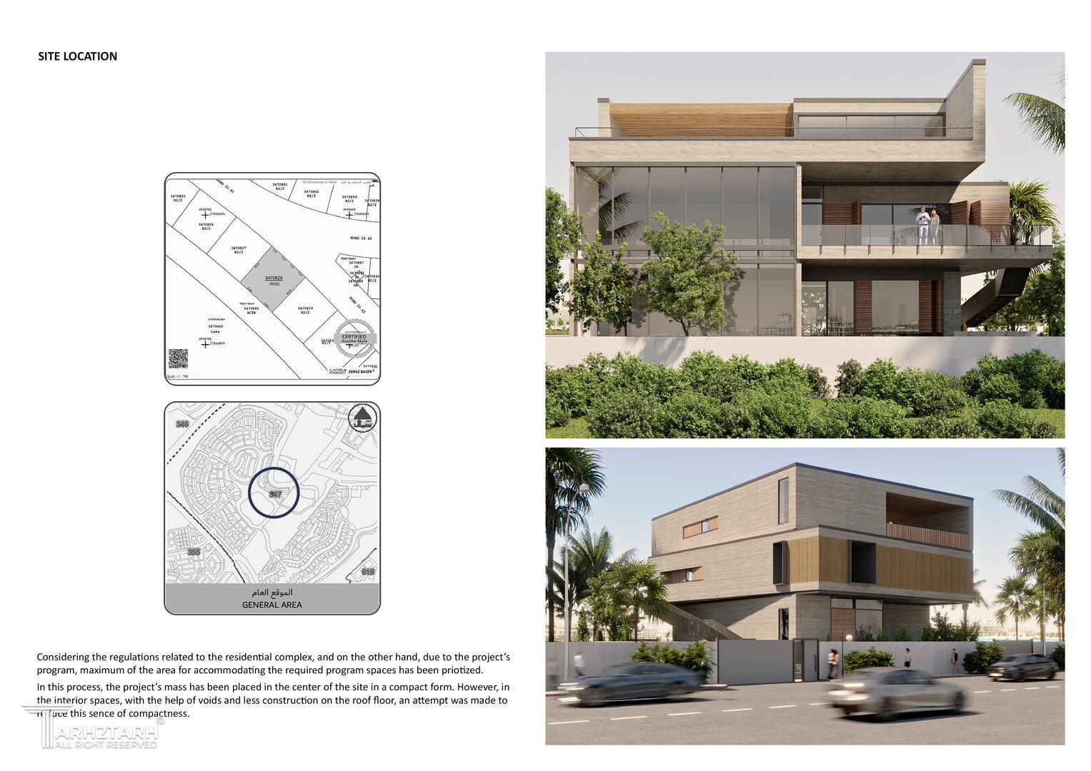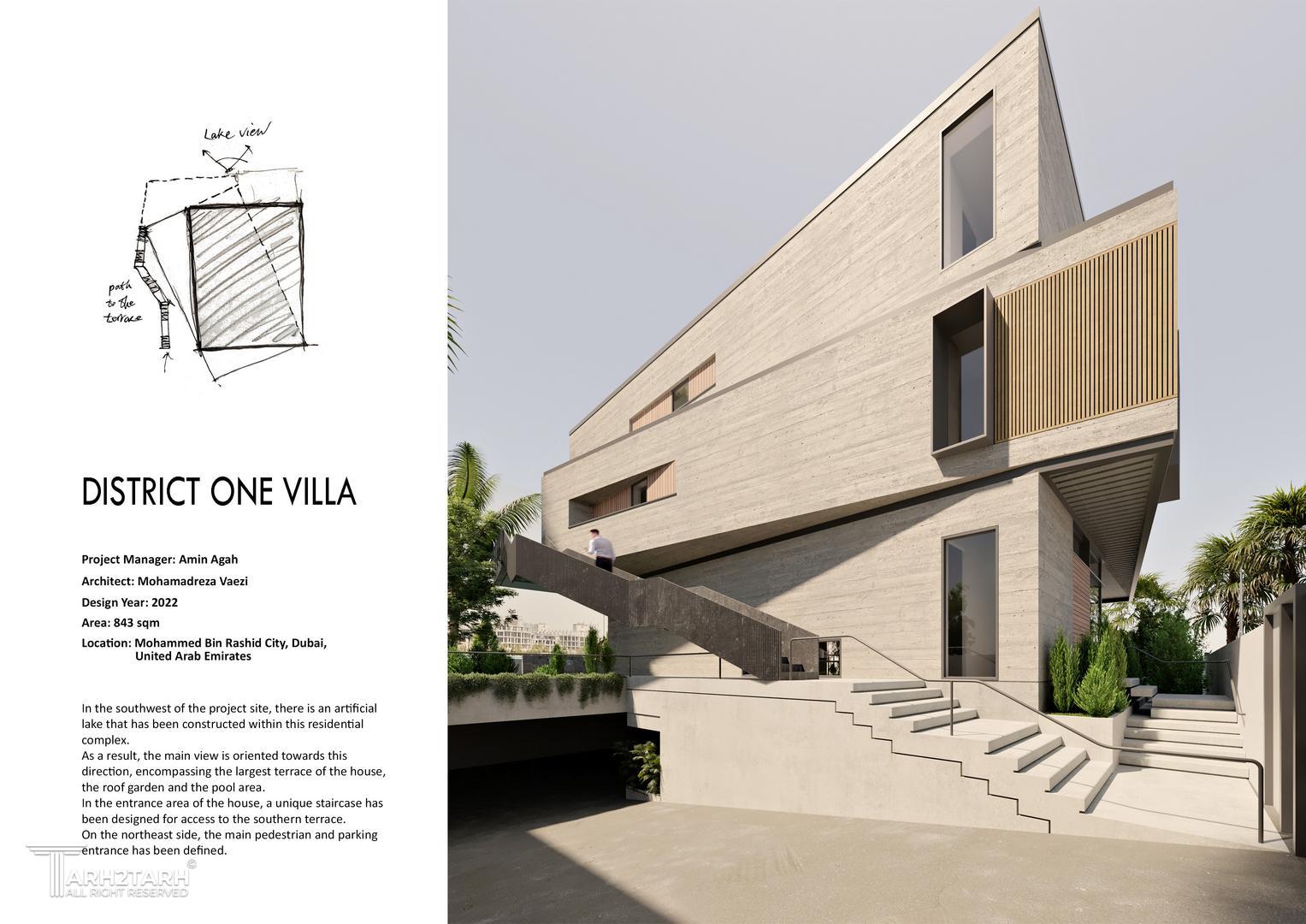 در جنوب غربی سایت پروژه، دریاچهاب مصنوعی وجود دارد که در داخل این شهرک مسکونی ساخته شده است. در نتیجه، منظره اصلی به سمت این جهت است و فضاهایی همچون بزرگترین تراس ویلا، روف گاردن و فضای استخر با دید کامل به این ویو جانمایی شدهاند. در قسمت ورودی خانه، پلکانی منحصر به فرد برای دسترسی مستقیم به تراس جنوبی در محوطهی بیرونی طراحی شده است.