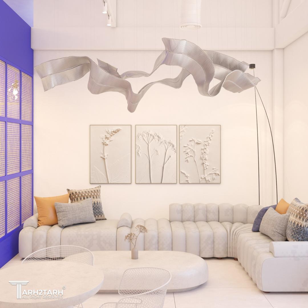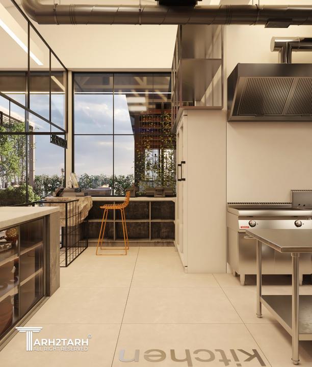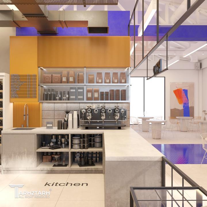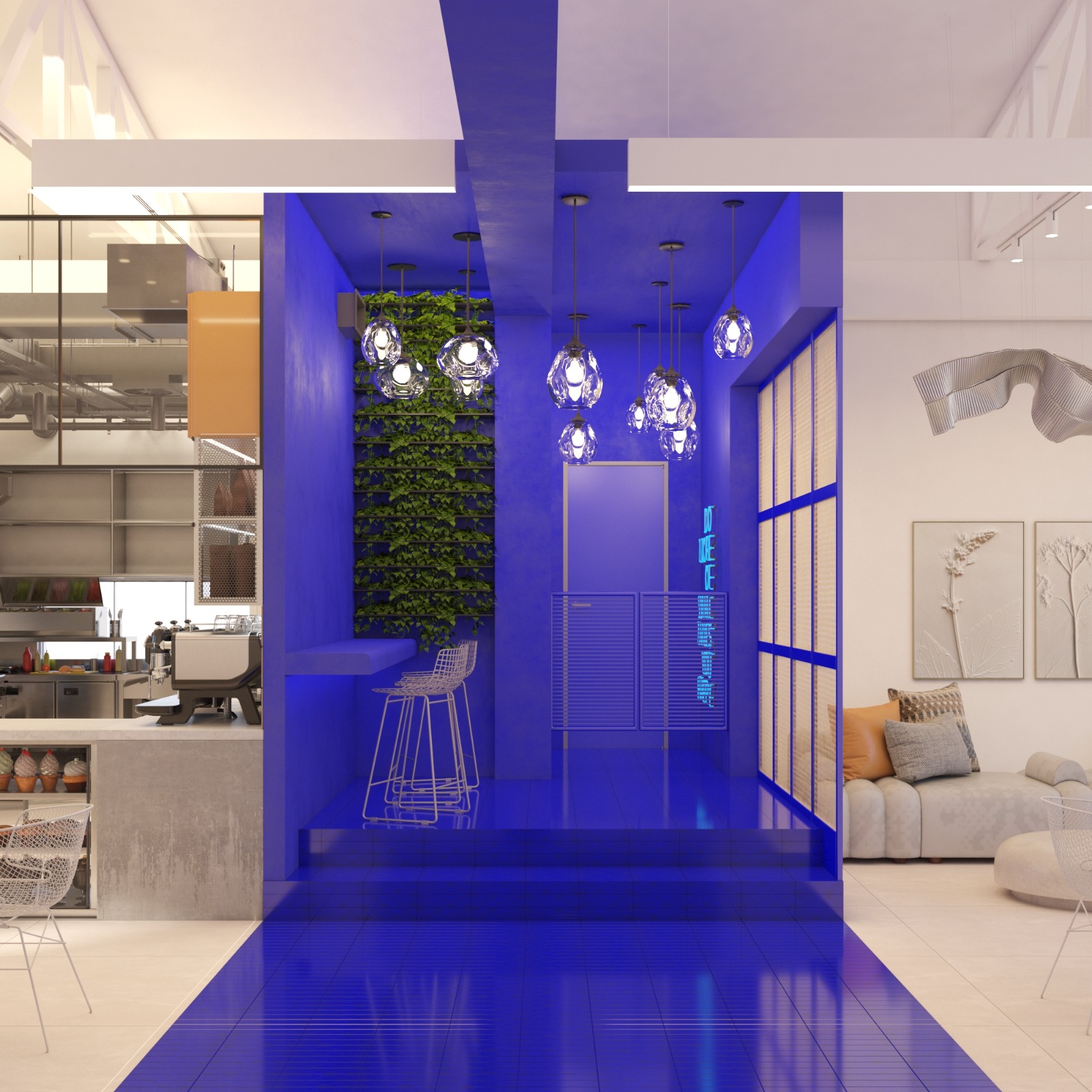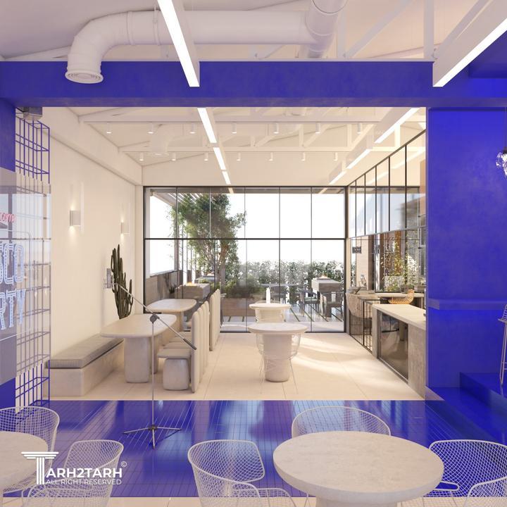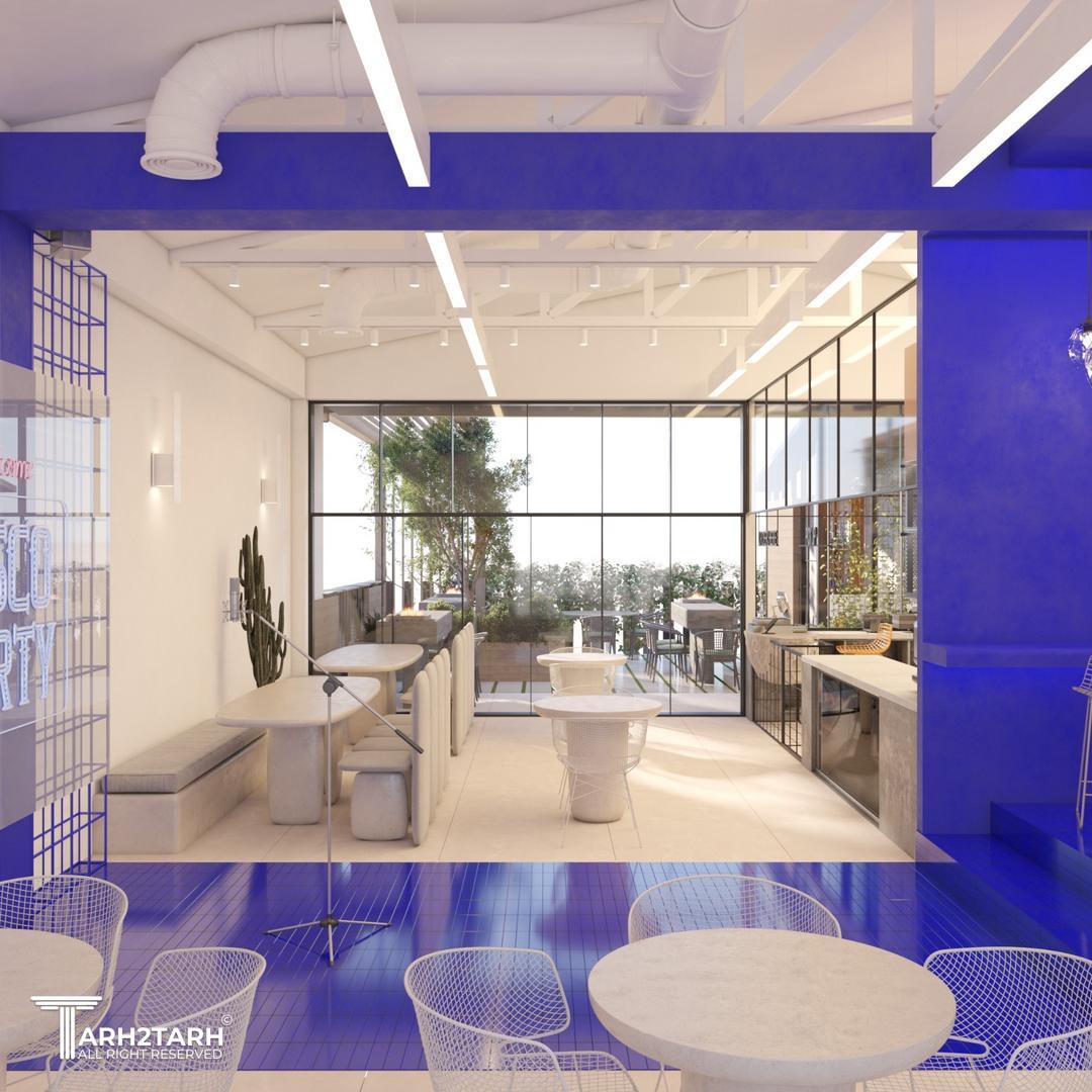بازسازی یک فضای صنعتی با رنگهای مینیمال سفید و آبی، حفظ ساختار سقف و جزئیات اصلی، و طراحی کافهای در ارتفاع با روف در طبقه پنجم