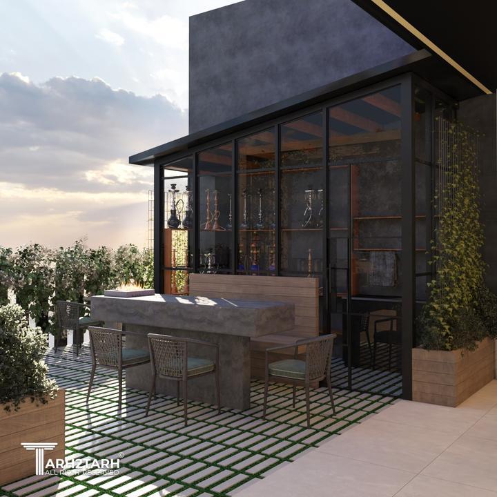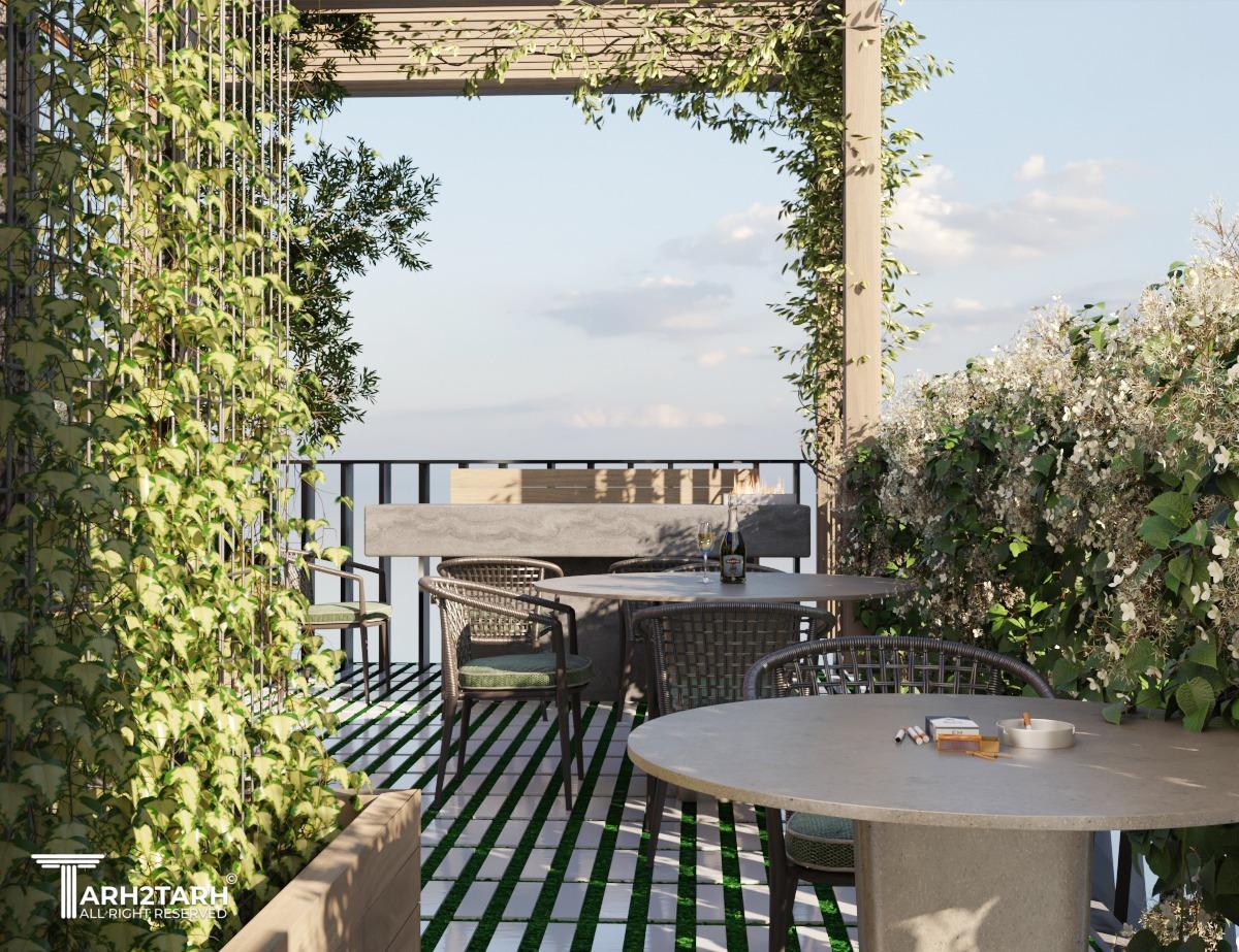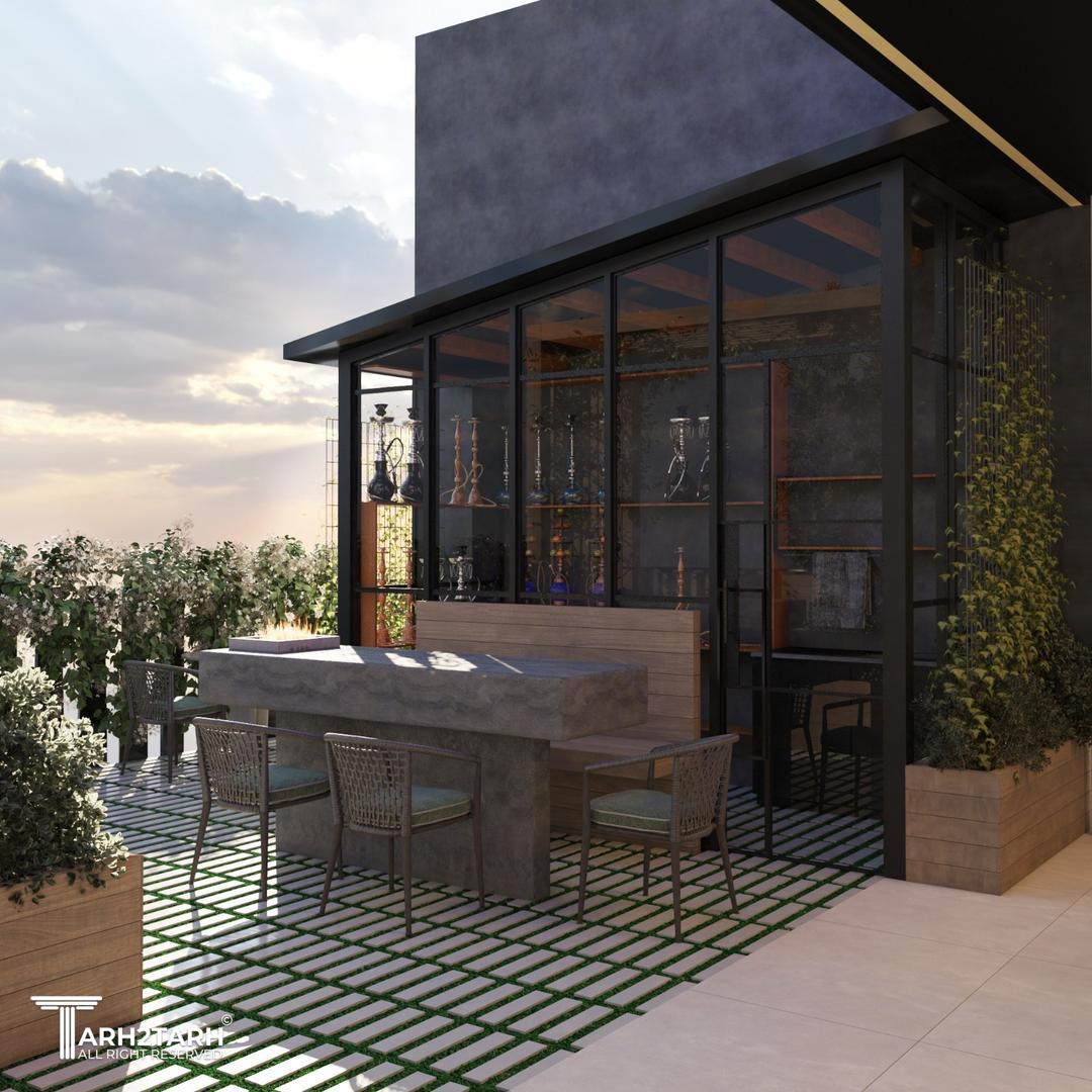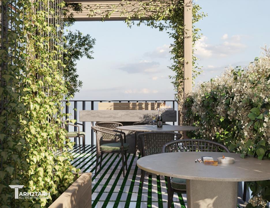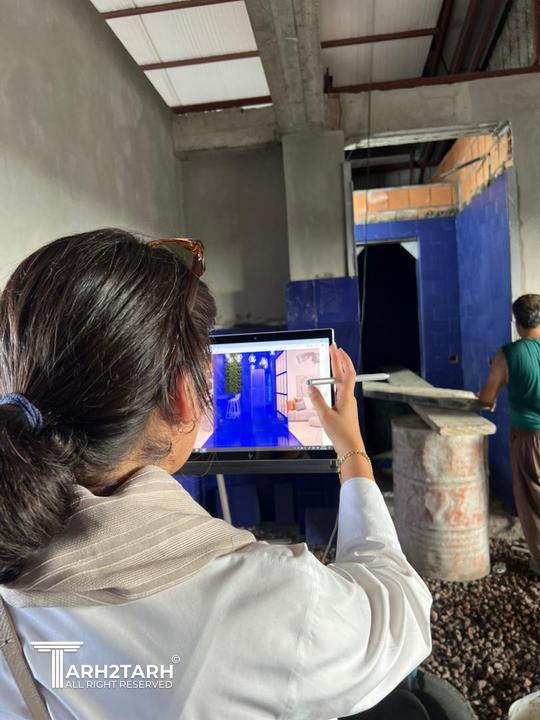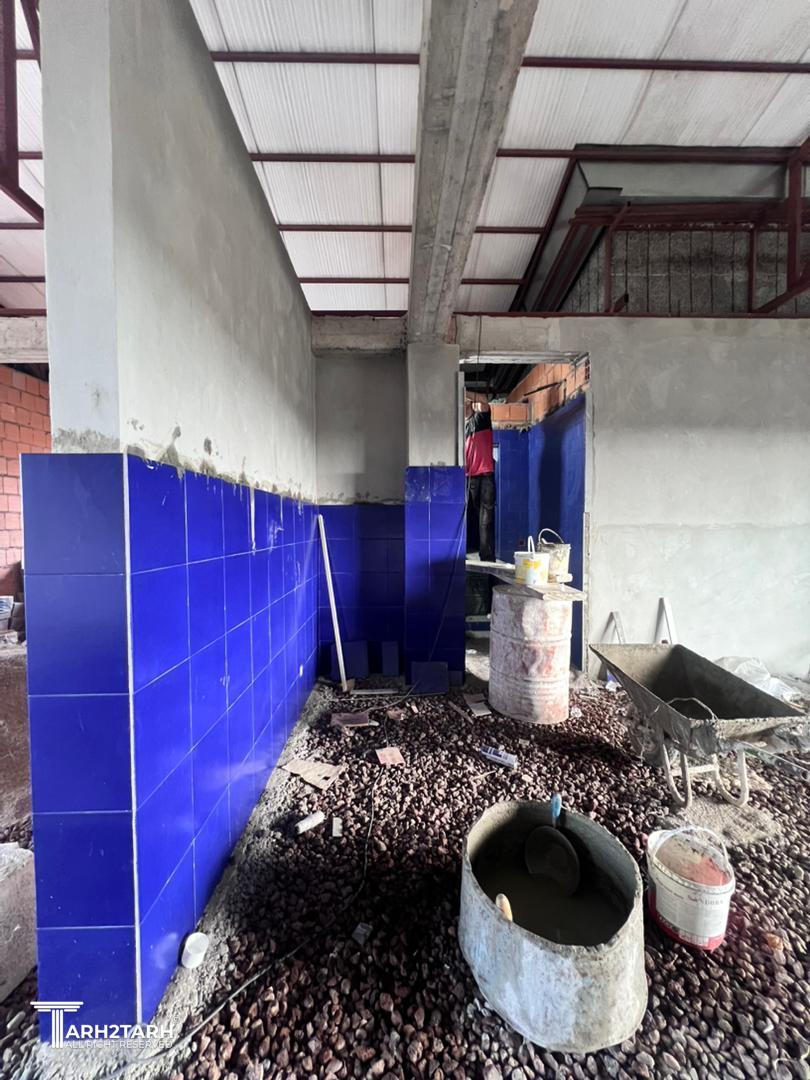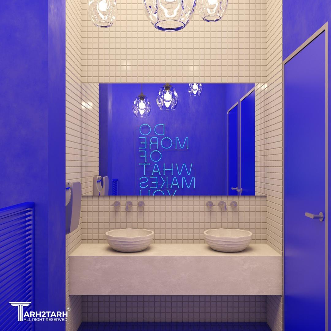بازسازی یک فضای صنعتی با رنگهای مینیمال سفید و آبی، حفظ ساختار سقف و جزئیات اصلی، و طراحی کافهای در ارتفاع با روف در طبقه پنجم