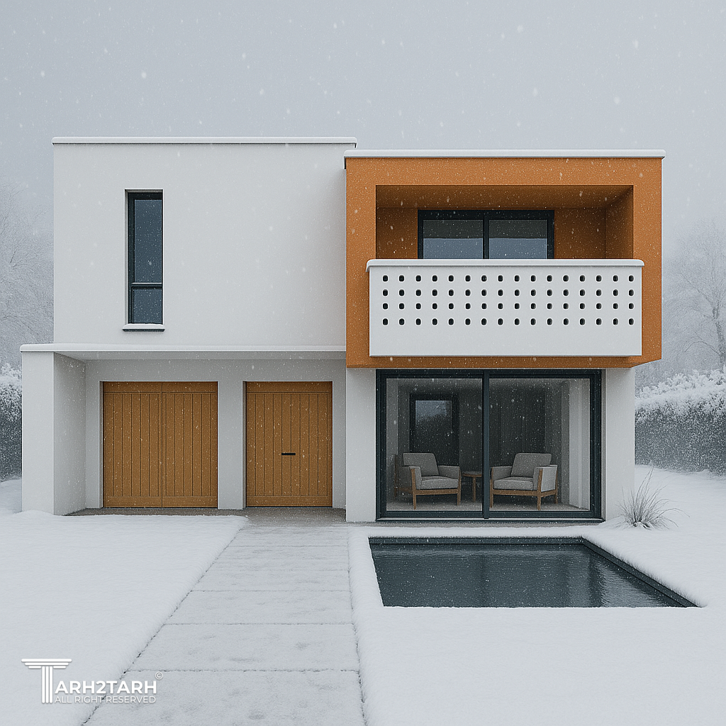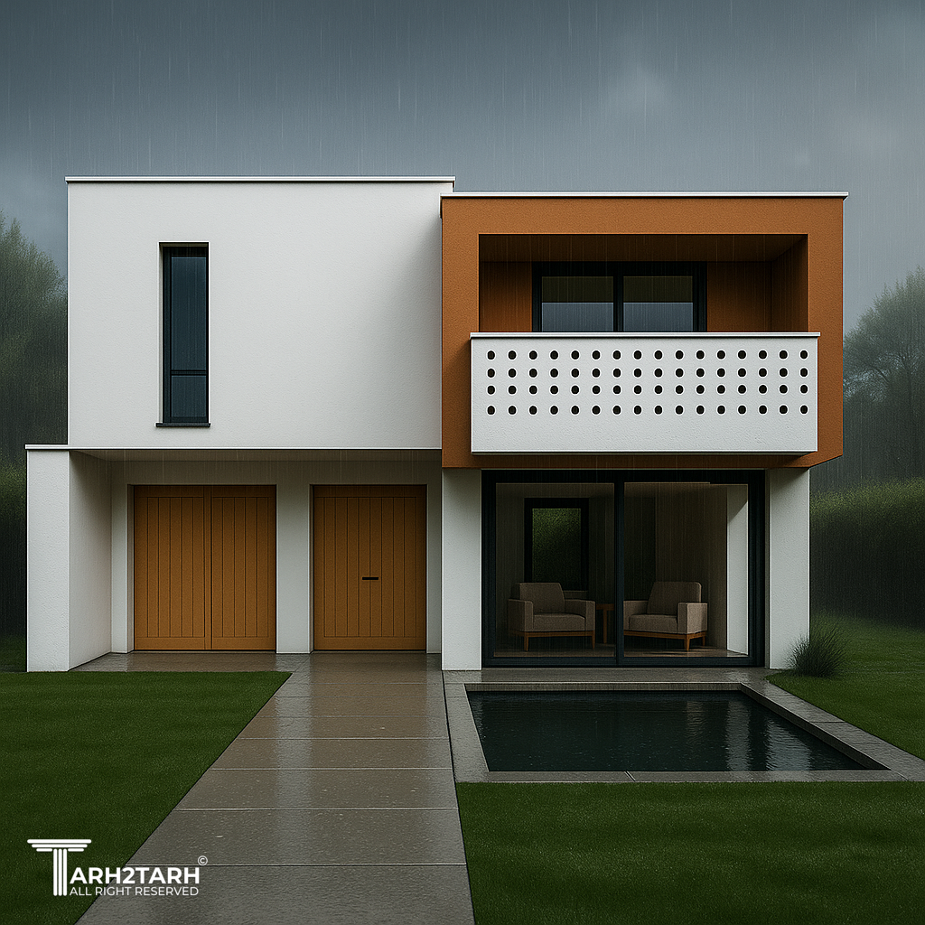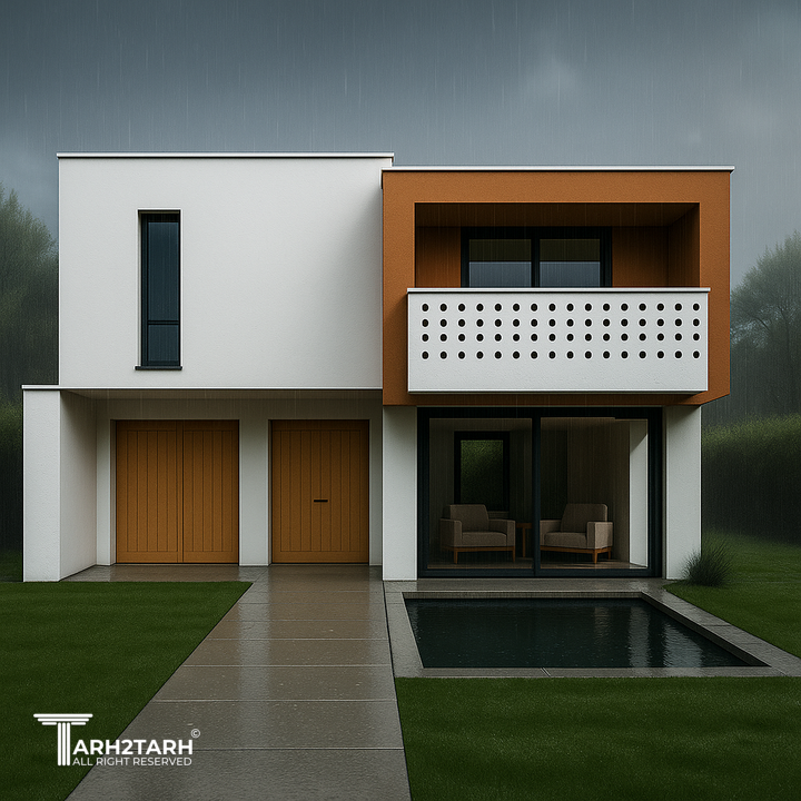 «طراحی ویلای مدرن و مینیمال با ترکیب رنگی جذاب، بازشوهای وسیع، تراس شاخص طبقه دوم و محوطهسازی آرامشبخش با استخر .»