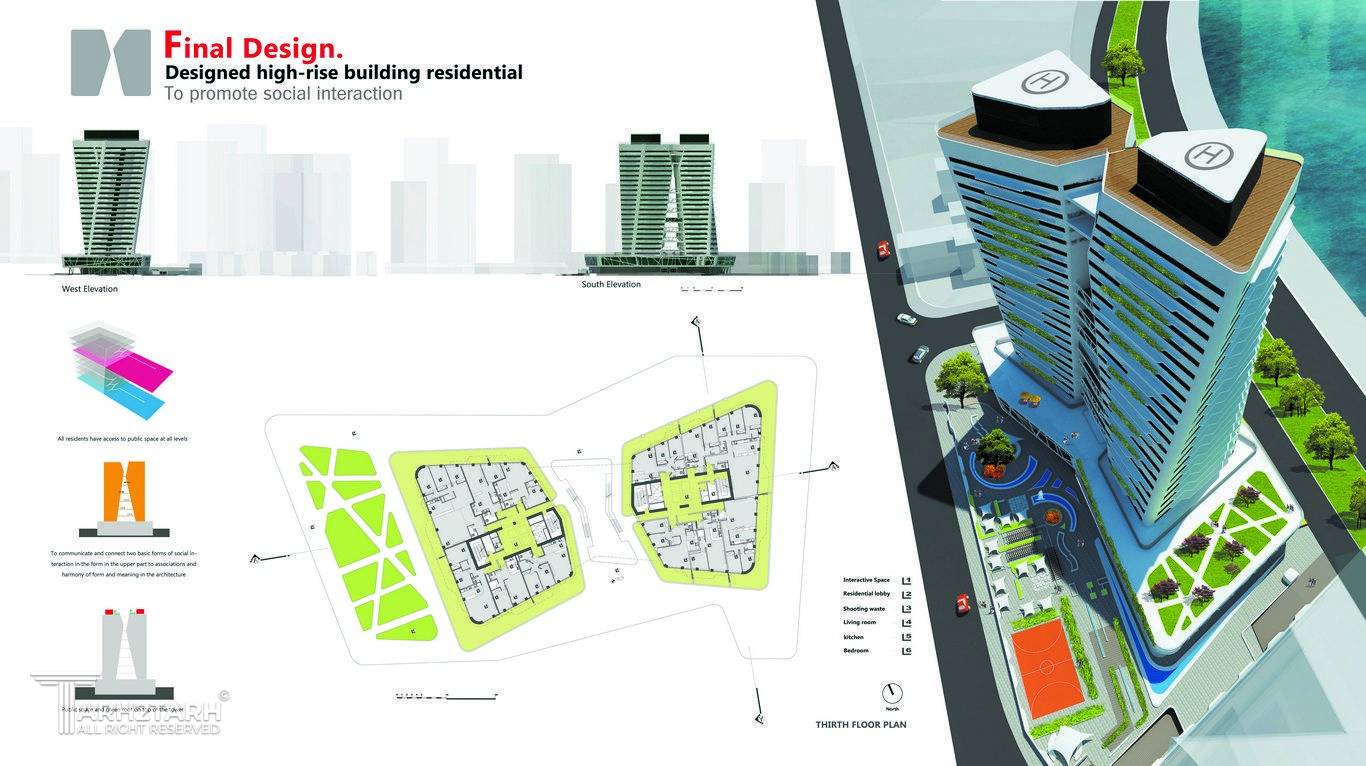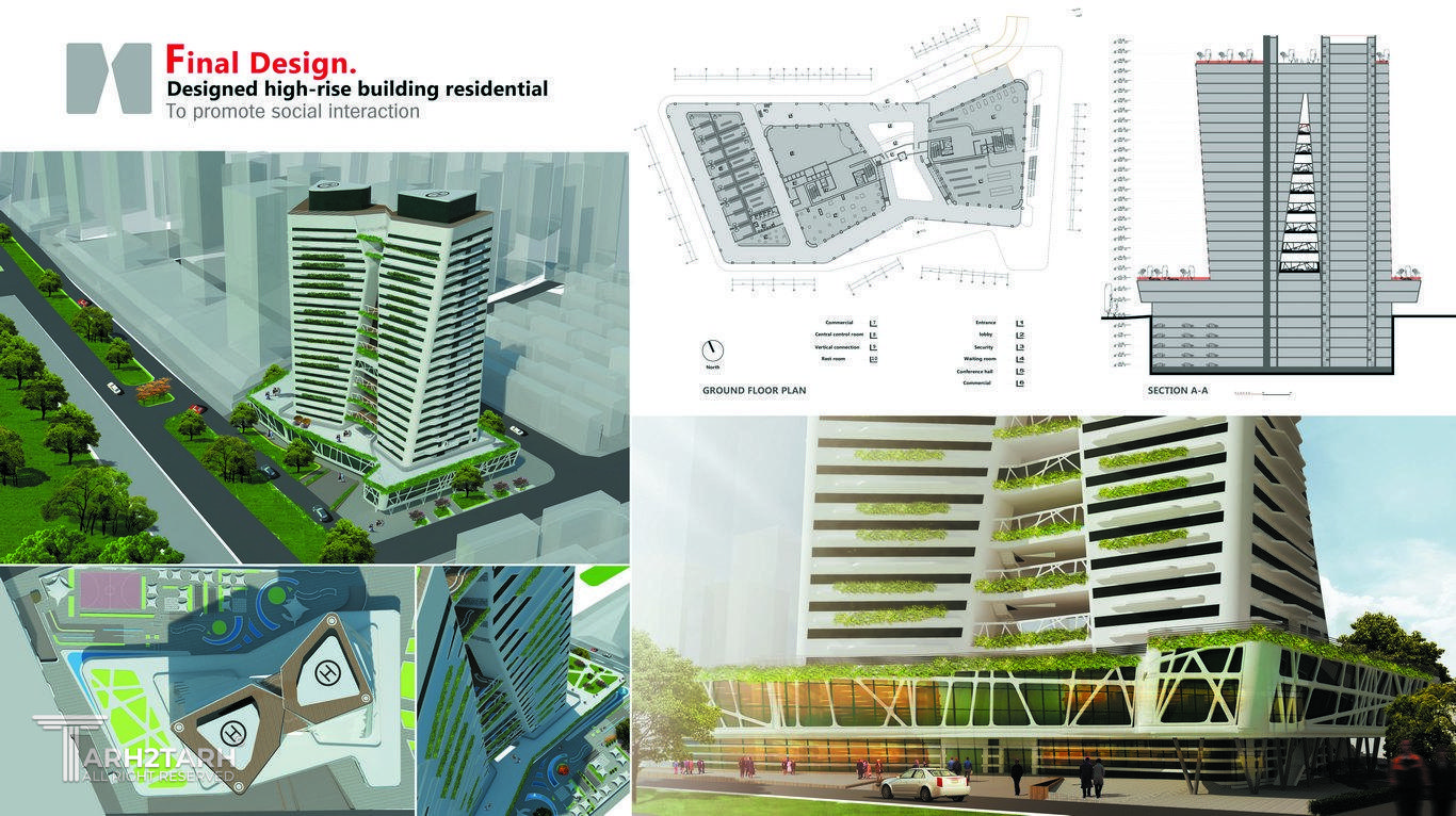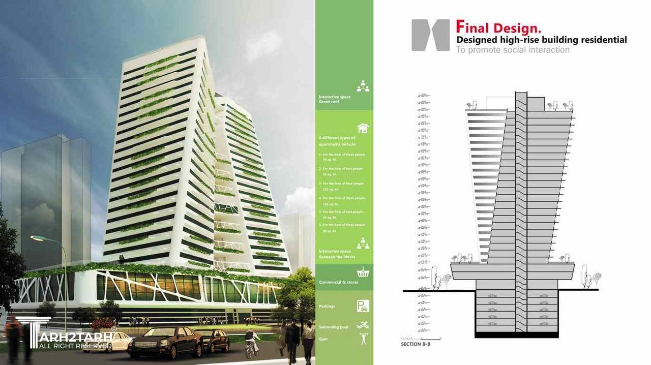 این پروژه در غالب پایان نامه مقطع کارشناسی ارشد طراحی شده است. مبنای فکری و ایده ای که در این پروژه به دنبال اجرایی کردن آن بودیم ایجا فضاهای است که بتواند تعاملات اجتماعی ساکنین خود رو افزایش دهد.با در نظر گرفتن عوامل کلی نظیر جانمایی صحیح و همجواری به مراکز عمومی و مسایل بیرونی دیگر و در نظر گرفتن سلسله مراتب دسترسی . چیدمان واحدها ،فضاهای مشاع و دیگر عوامل تلاش شد این موضوع بر آورده شود.