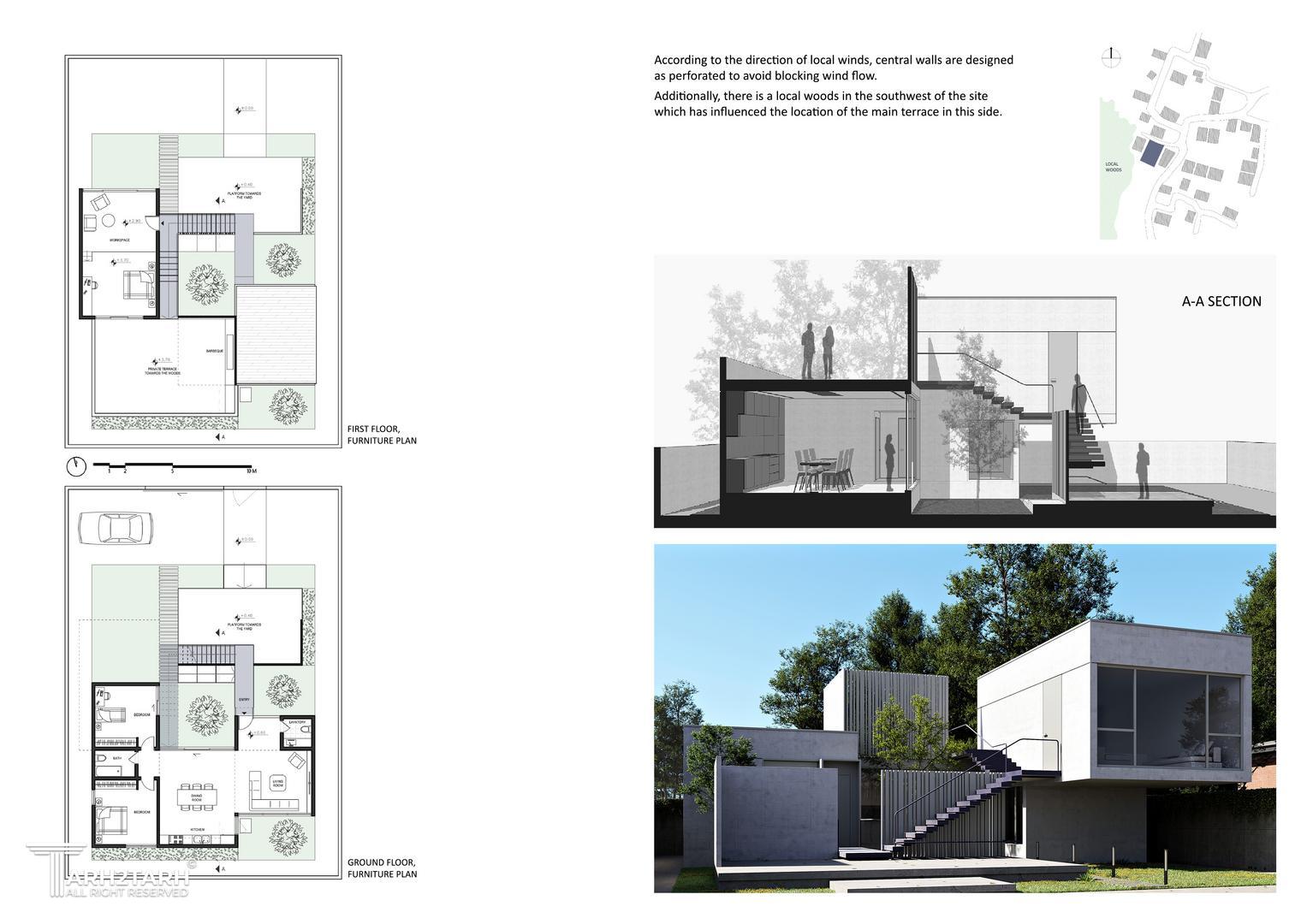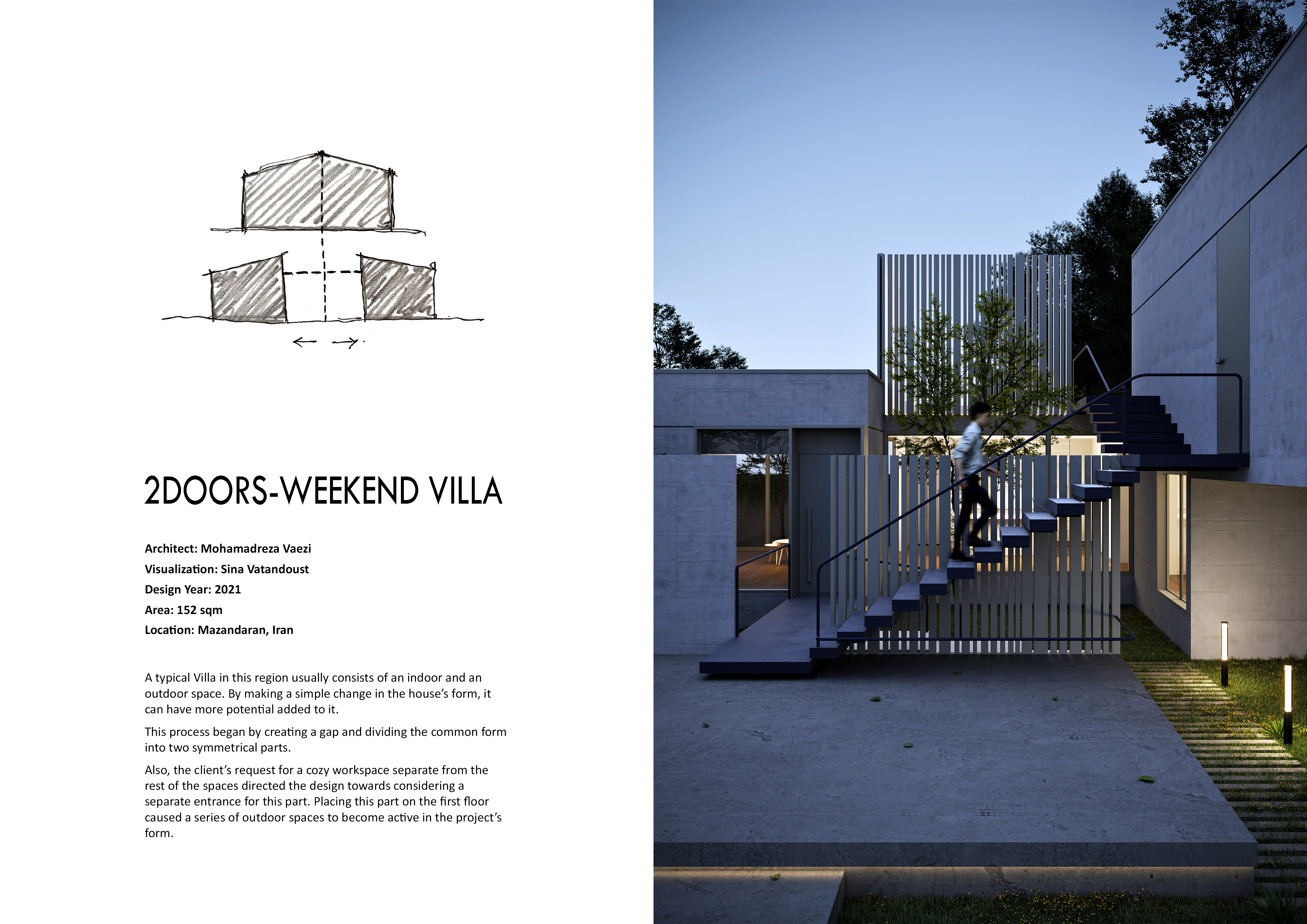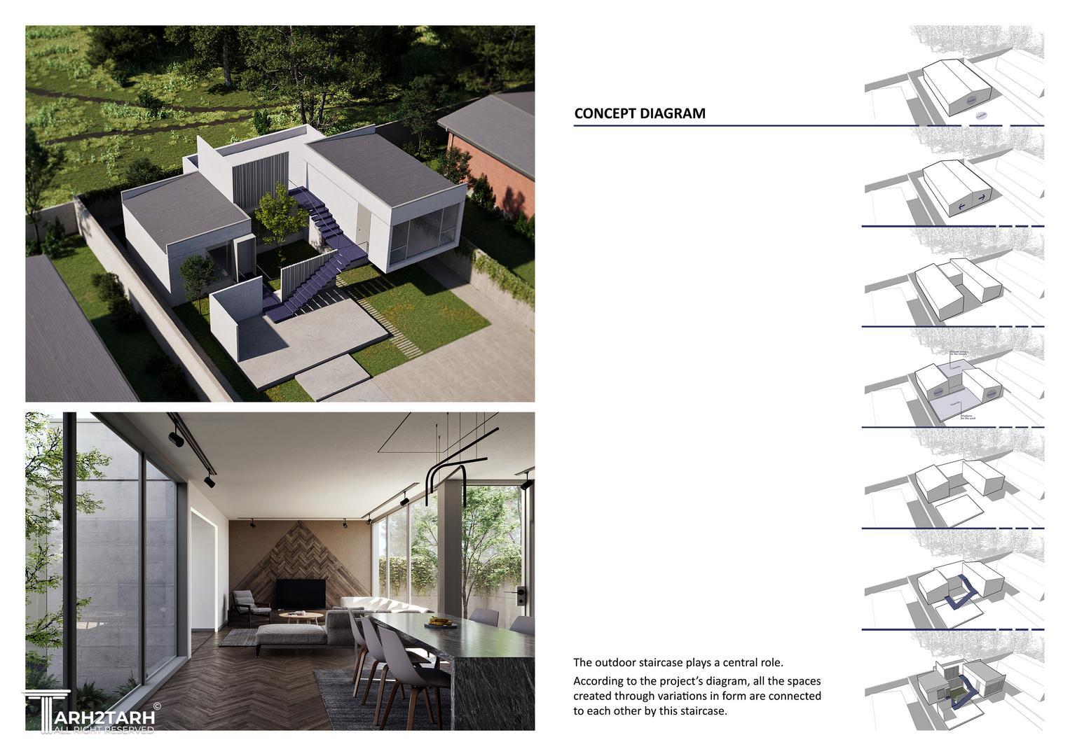 فرایند طراحی با ایجاد یک شکاف آغاز شد که حجم اولیه را به دو تودهی متقارن تقسیم میکرد. در پاسخ به درخواست کارفرما برای داشتن فضای کاری دنج و جدا از بخشهای اصلی زندگی، ورودی مستقلی برای آن در نظر گرفته شد. قرار گرفتن این فضا در طبقه اول، به شکلگیری توالیای از فضاهای باز با قابلیتهای متنوع در پروژه منجر شد.