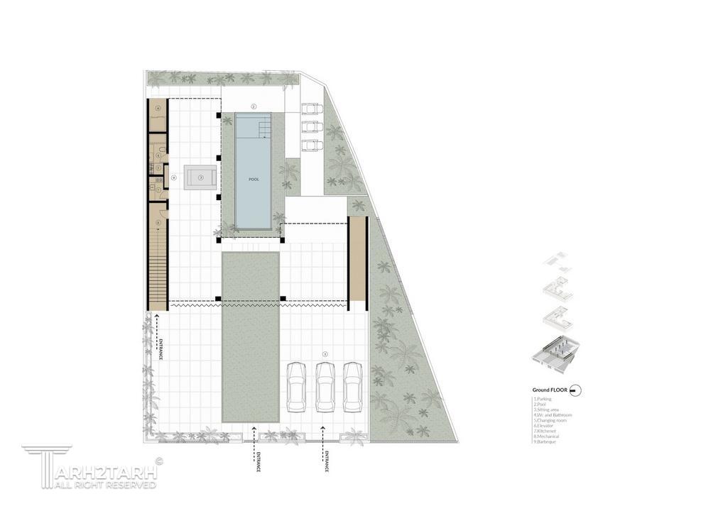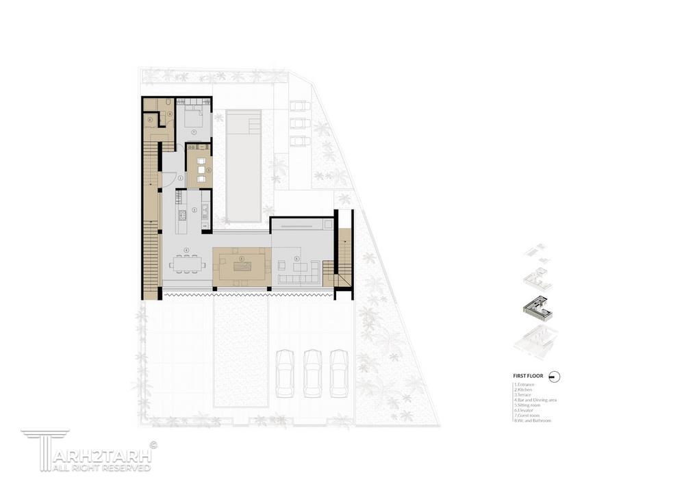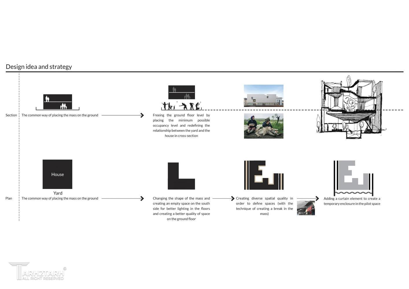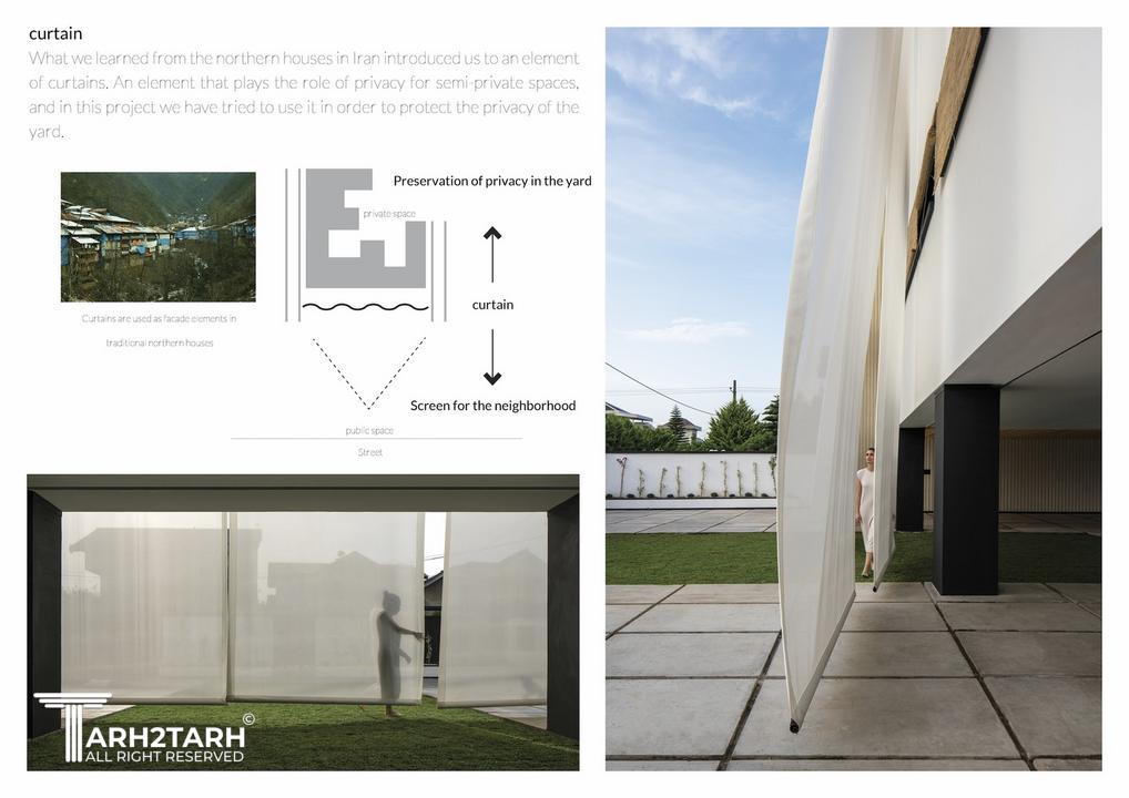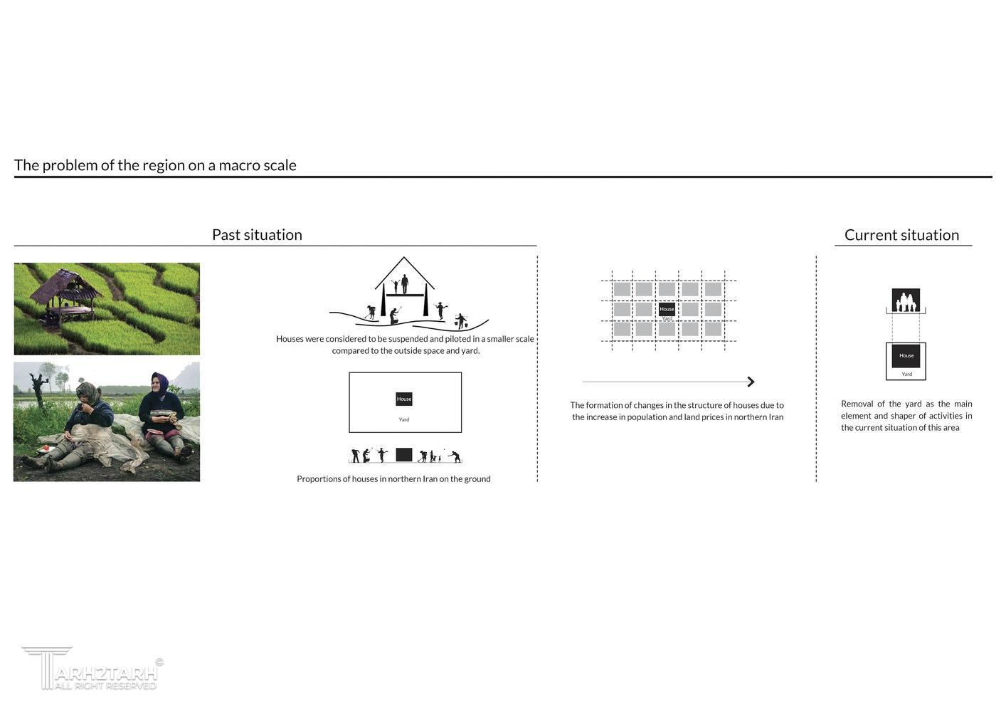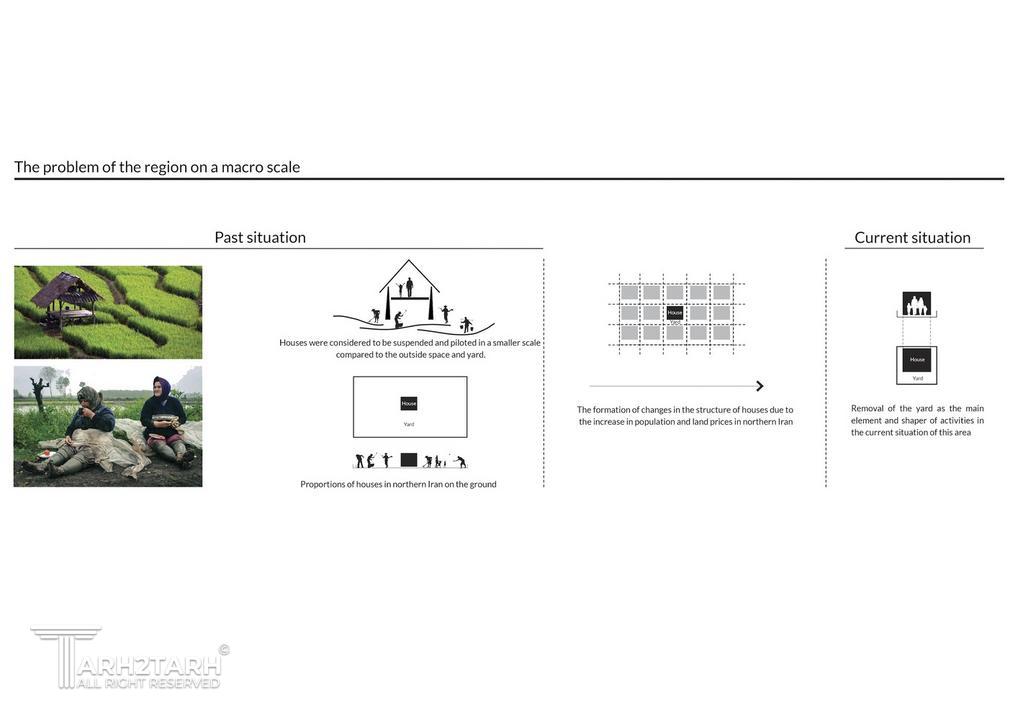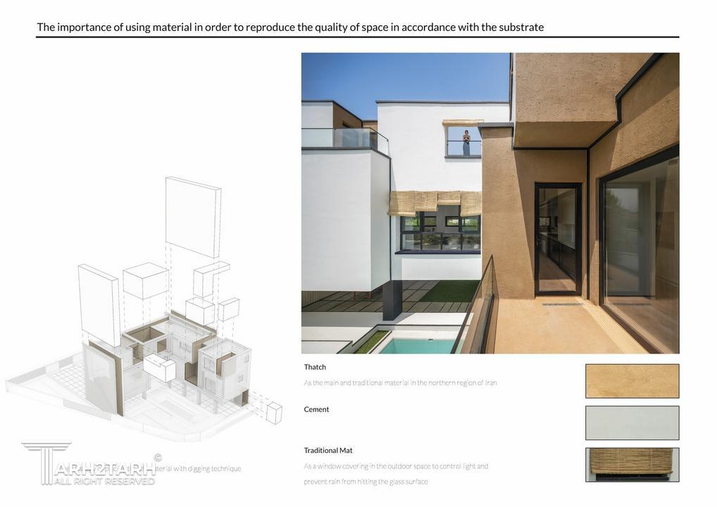 شمال ایران با زمینهای گسترده و حاصلخیز شناخته میشود که در گذشته خانهها در مرکز زمینها قرار داشتند و بخش عمده فعالیتهای ساکنان در فضای باز جریان داشت. اما در سالهای اخیر، تقسیمبندی زمینها کوچک شده و پس از ساخت ساختمان، فضای مفید بیرونی کاهش یافته است و به نوعی زندگی و فرهنگ ویژه این منطقه در فضای باز از بین رفته است. در طراحی ویلای «سامون»، با الهام از خانههای قدیمی، طبقه همکف بهعنوان سکویی برای فعالیتهای متنوع حفظ شده و حجم ساختمان با حداقل اشغال زمین معلق شده است تا مفهوم حیاط آزاد بازتعریف شود. مصالح سنتی منطقه مانند ملات کاهگل همراه با سیمان مدرن به کار رفتهاند تا کیفیت فضایی گذشته بازگردد و همزمان نورگیری و تنوع فضایی فعال حفظ شود، بهنحوی که هم زندگی سنتی و هم نیازهای مدرن در تعادل باشند.