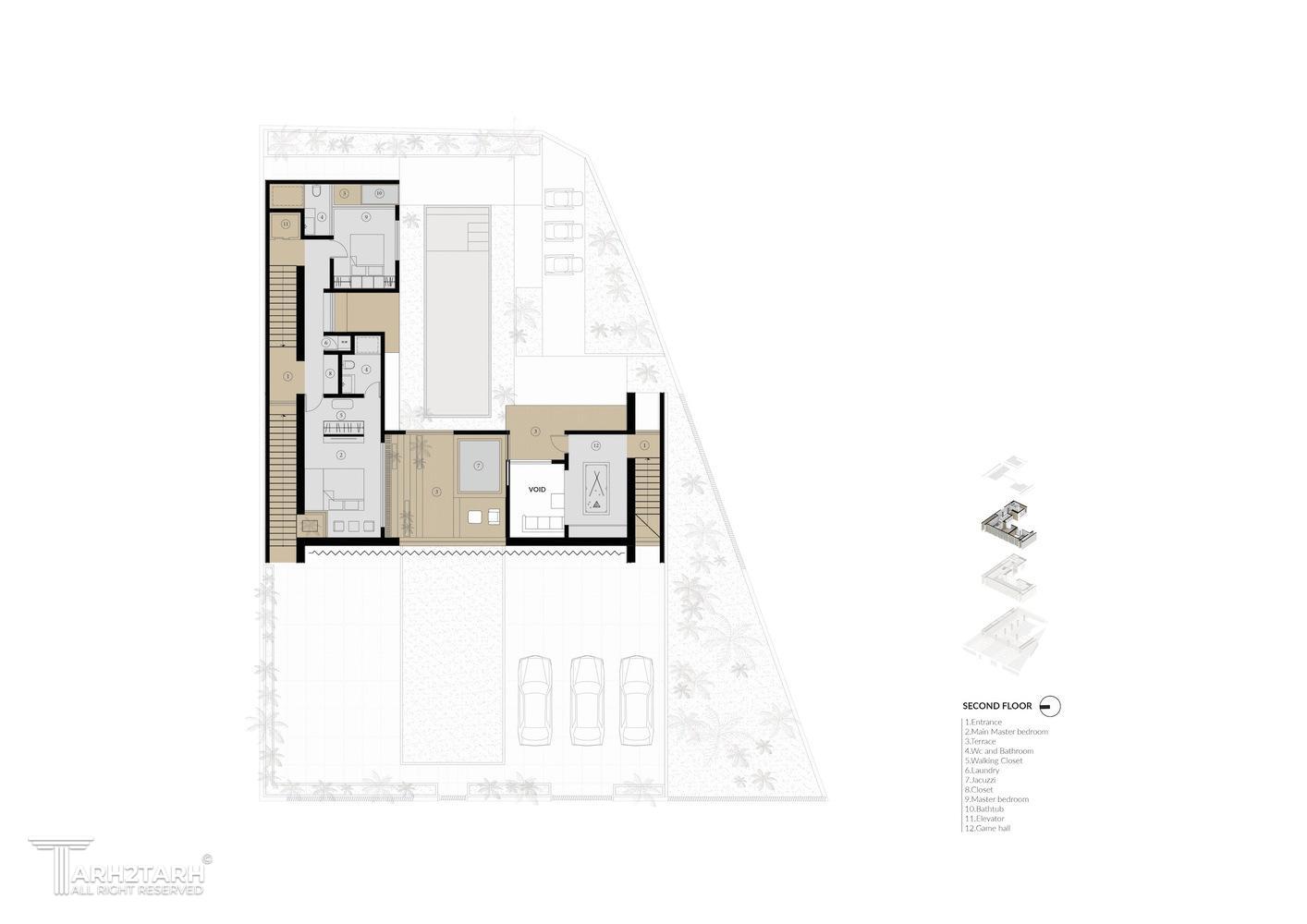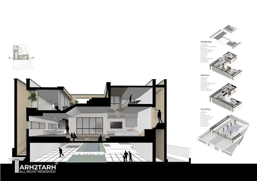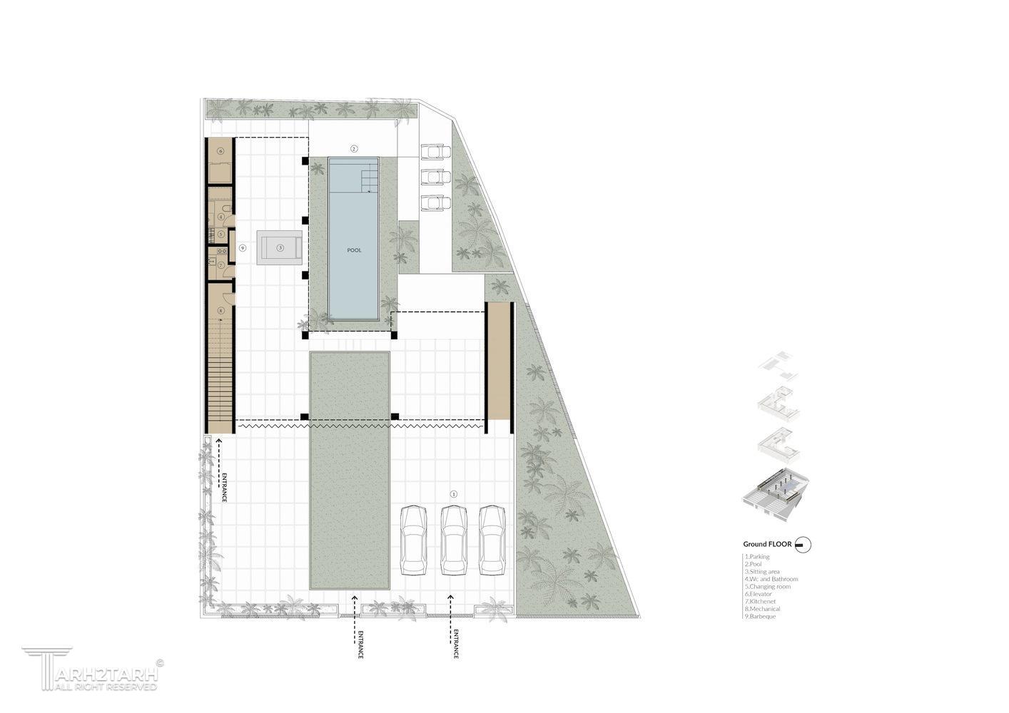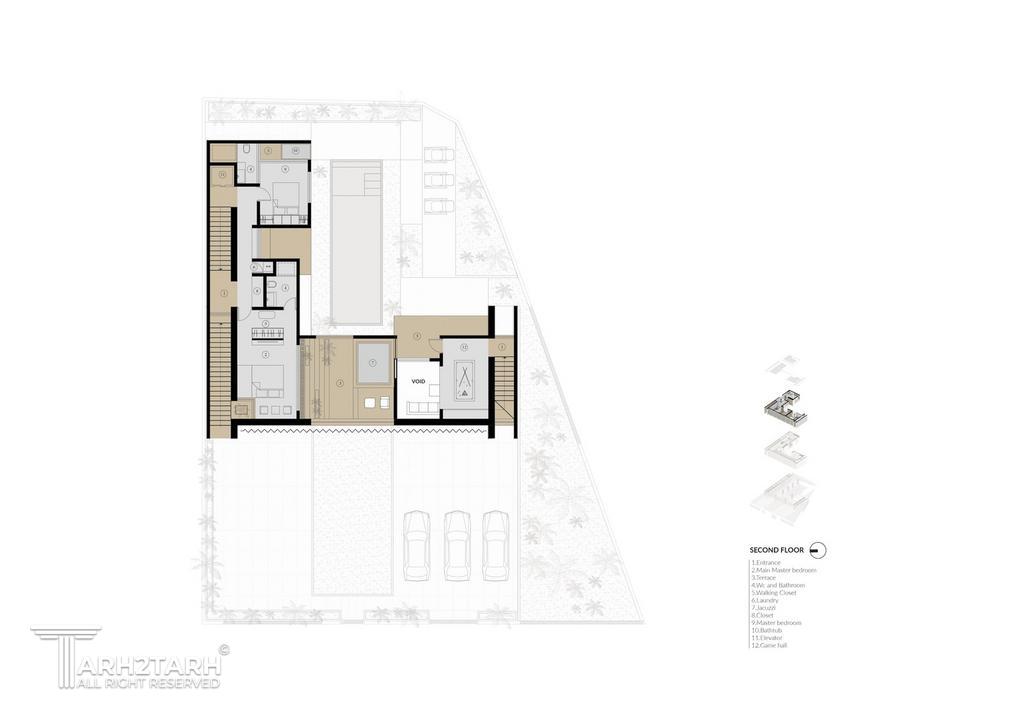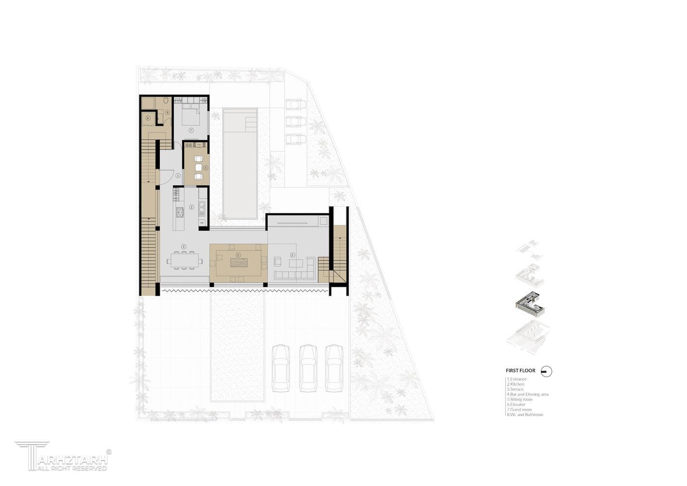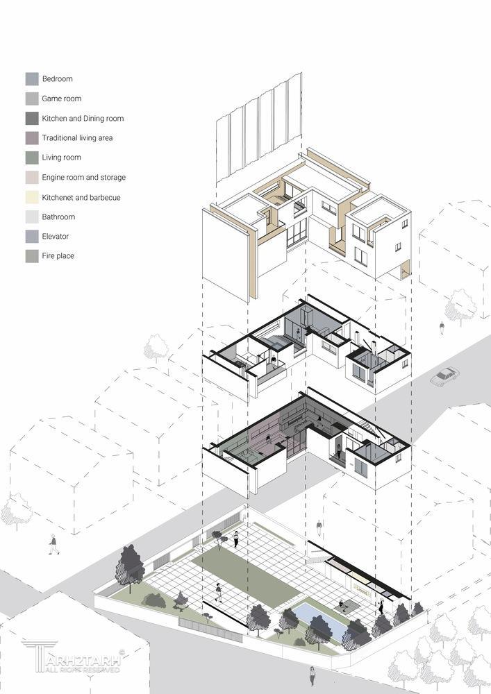 شمال ایران با زمینهای گسترده و حاصلخیز شناخته میشود که در گذشته خانهها در مرکز زمینها قرار داشتند و بخش عمده فعالیتهای ساکنان در فضای باز جریان داشت. اما در سالهای اخیر، تقسیمبندی زمینها کوچک شده و پس از ساخت ساختمان، فضای مفید بیرونی کاهش یافته است و به نوعی زندگی و فرهنگ ویژه این منطقه در فضای باز از بین رفته است. در طراحی ویلای «سامون»، با الهام از خانههای قدیمی، طبقه همکف بهعنوان سکویی برای فعالیتهای متنوع حفظ شده و حجم ساختمان با حداقل اشغال زمین معلق شده است تا مفهوم حیاط آزاد بازتعریف شود. مصالح سنتی منطقه مانند ملات کاهگل همراه با سیمان مدرن به کار رفتهاند تا کیفیت فضایی گذشته بازگردد و همزمان نورگیری و تنوع فضایی فعال حفظ شود، بهنحوی که هم زندگی سنتی و هم نیازهای مدرن در تعادل باشند.