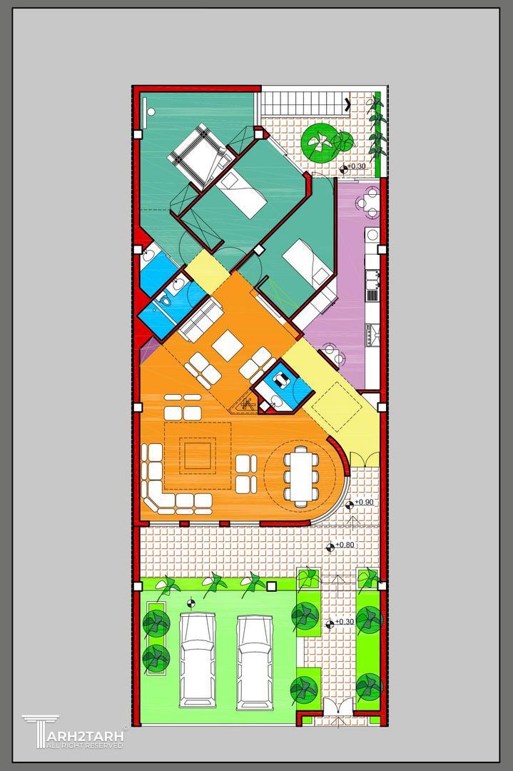 پلان ویلایی یک طبقه با محدودیت حریم همسایگان تفکیک نشیمن با پذیرایی درعین حال ارتباط نزدیک نورگیری همه فضاهای اصلی ازفضای آزاد