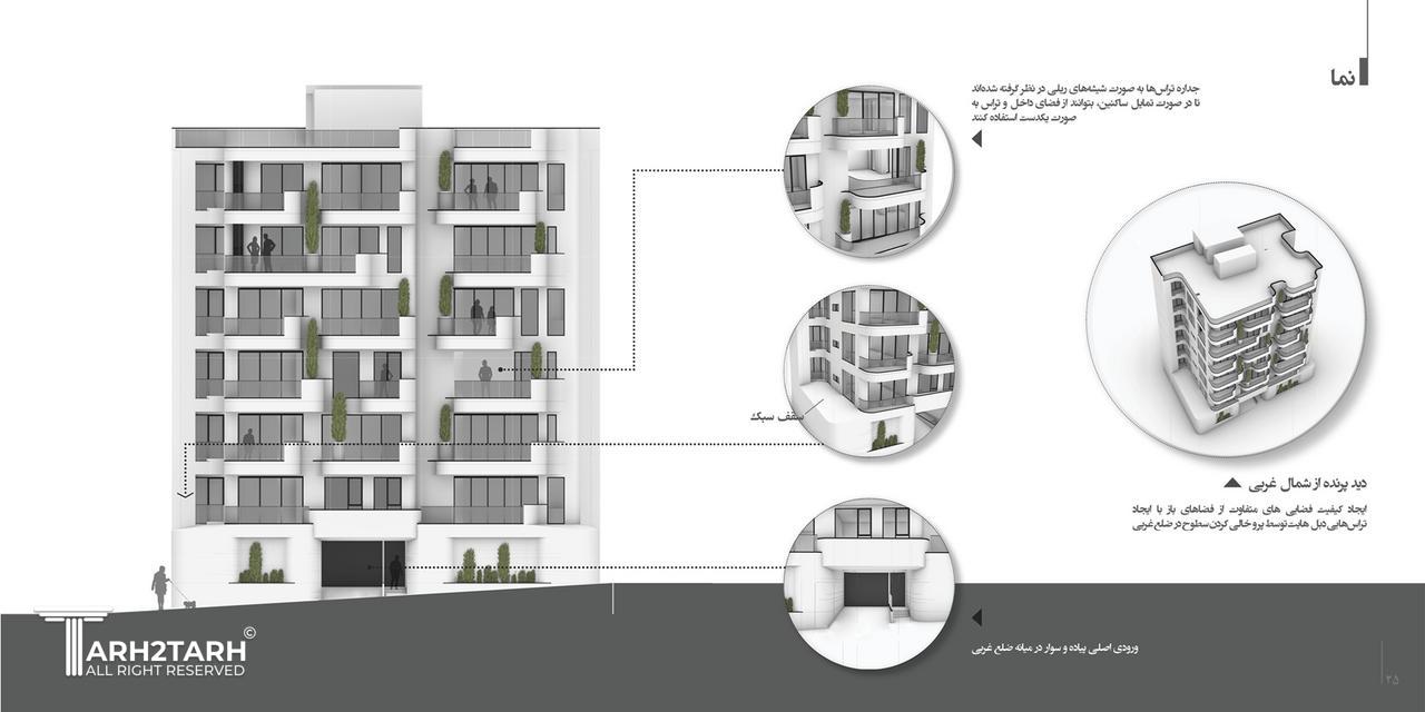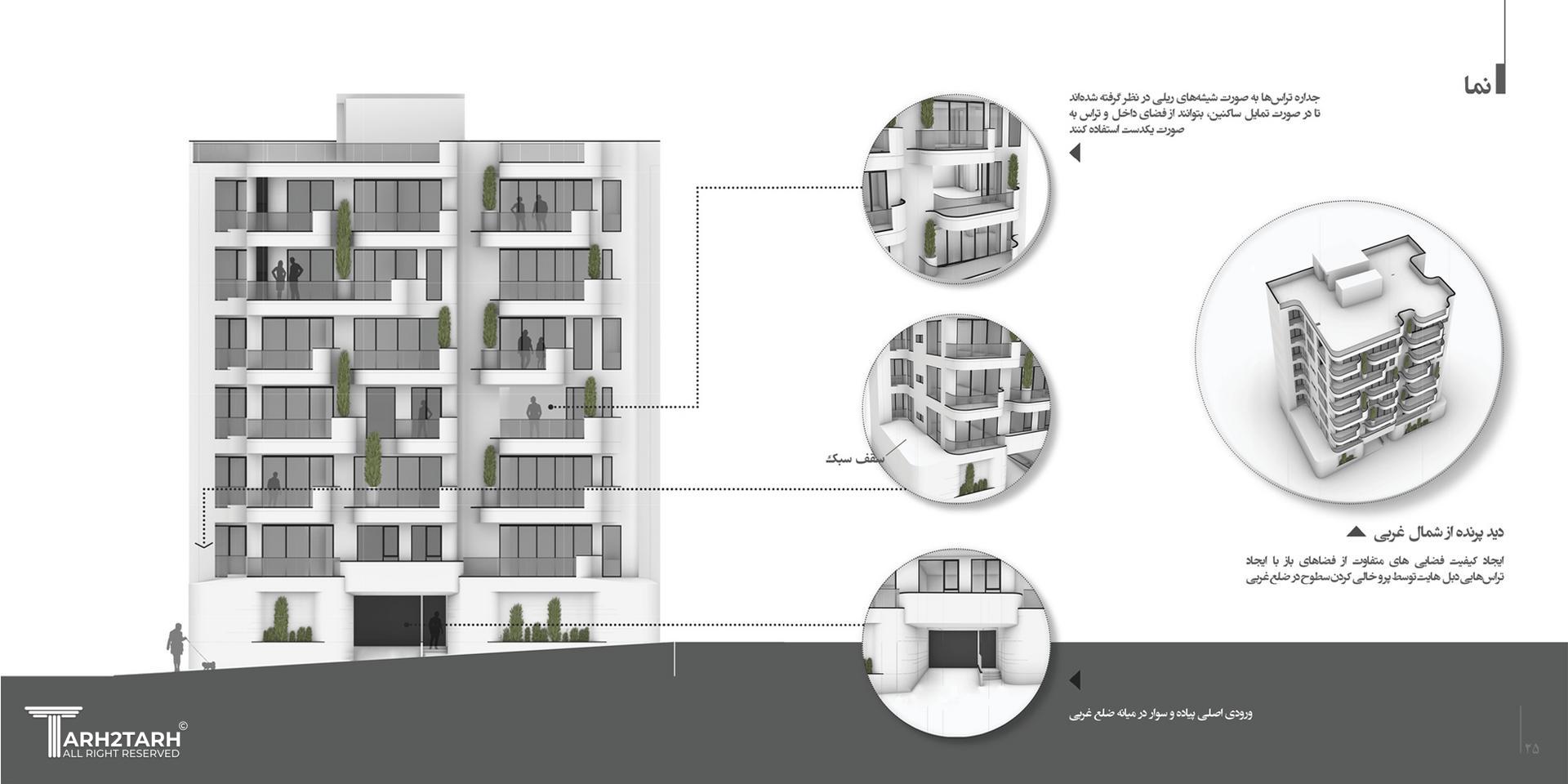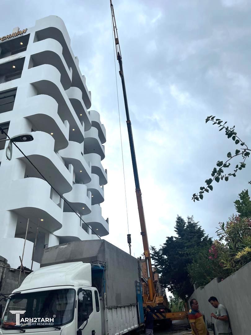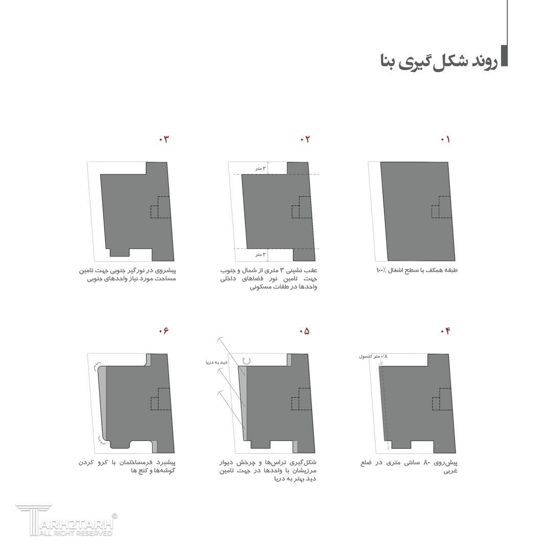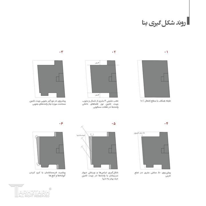 پروژه ویلا آپارتمان ارغوان، در زمینی به مساحت ۴۲۰ مترمربع و پلاک ۴ دریا تعریف شده است. زمین از شمال، جنوب و شرق دارای همسایگی است و از غرب مجاور گذر ۱۲ متری با دید به دریا می باشد و امکان ساخت ۱۰۰٪ در زمین فراهم بوده است. تلاش بر نورگیری مناسب از شمال و جنوب و تامین دید حداکثری به دریا برای کلیه واحد ها، در راس طراحی قرار گرفت. در این راستا به جای استفاده از نورگیرهای مرسوم، با عقب نشینی سه متری از شمال و جنوب در ۸۰ درصد این اضلاع، نورگیری مناسب از این دو ضلع، فراهم شد. در مرحله بعد کلیه کنسول های ضلع غربی، با عقب نشینی بیشتر در دیواره جداره، به فضای بالکن اختصاص داده شد تا در ضمن تعریف فضای نیمه باز در هر یک از واحدها، با چرخش دیوارها به سمت دریا، دید حداکثری به دریا از این تراس ها و فضاهای داخلی مرتبط با ان ها فراهم گردد. در این مرحله پیشنهاد خالی کردن کف در میانه تراس هر یک از واحدها، علاوه بر حفظ حریم بیشتر برای کاربر در فضاهای نیمه باز، تجربه فضایی متفاوت به لحاظ ارتفاعی را نیز به دنبال داشت. این پروژه در همکاری با "شرکت مشاور راستین سازه" انجام شده است.