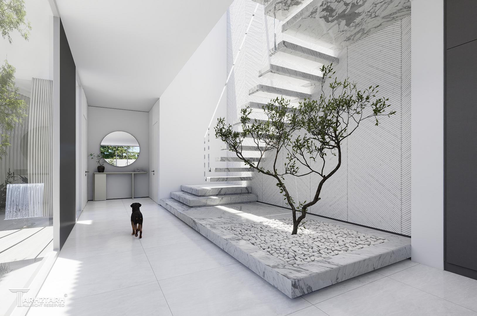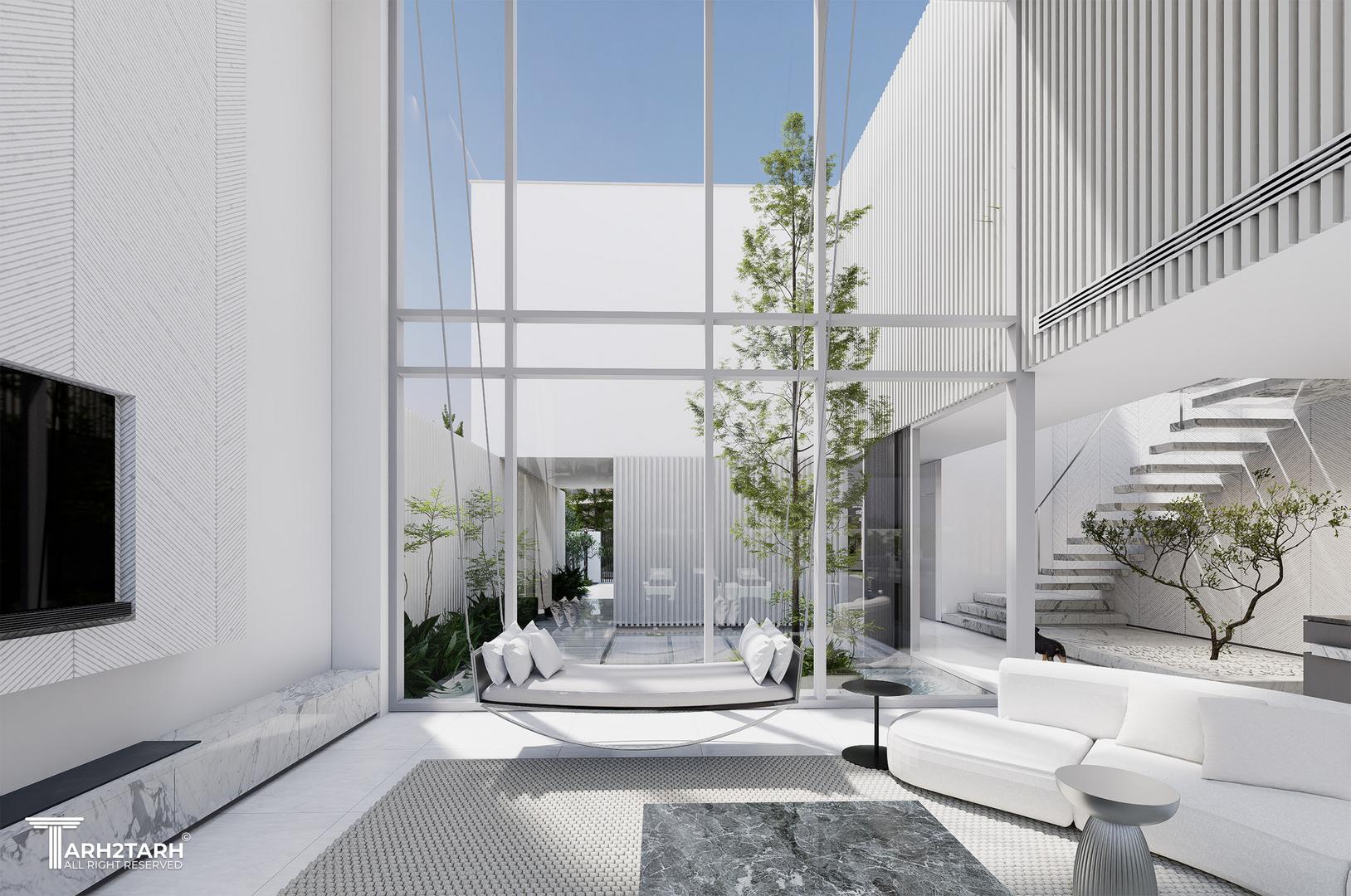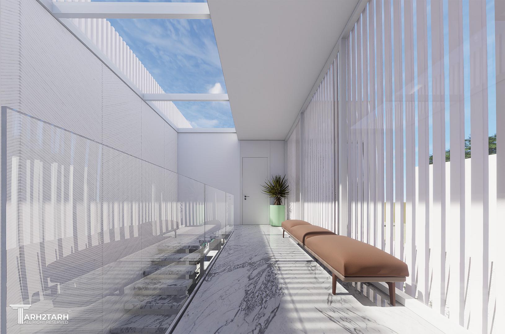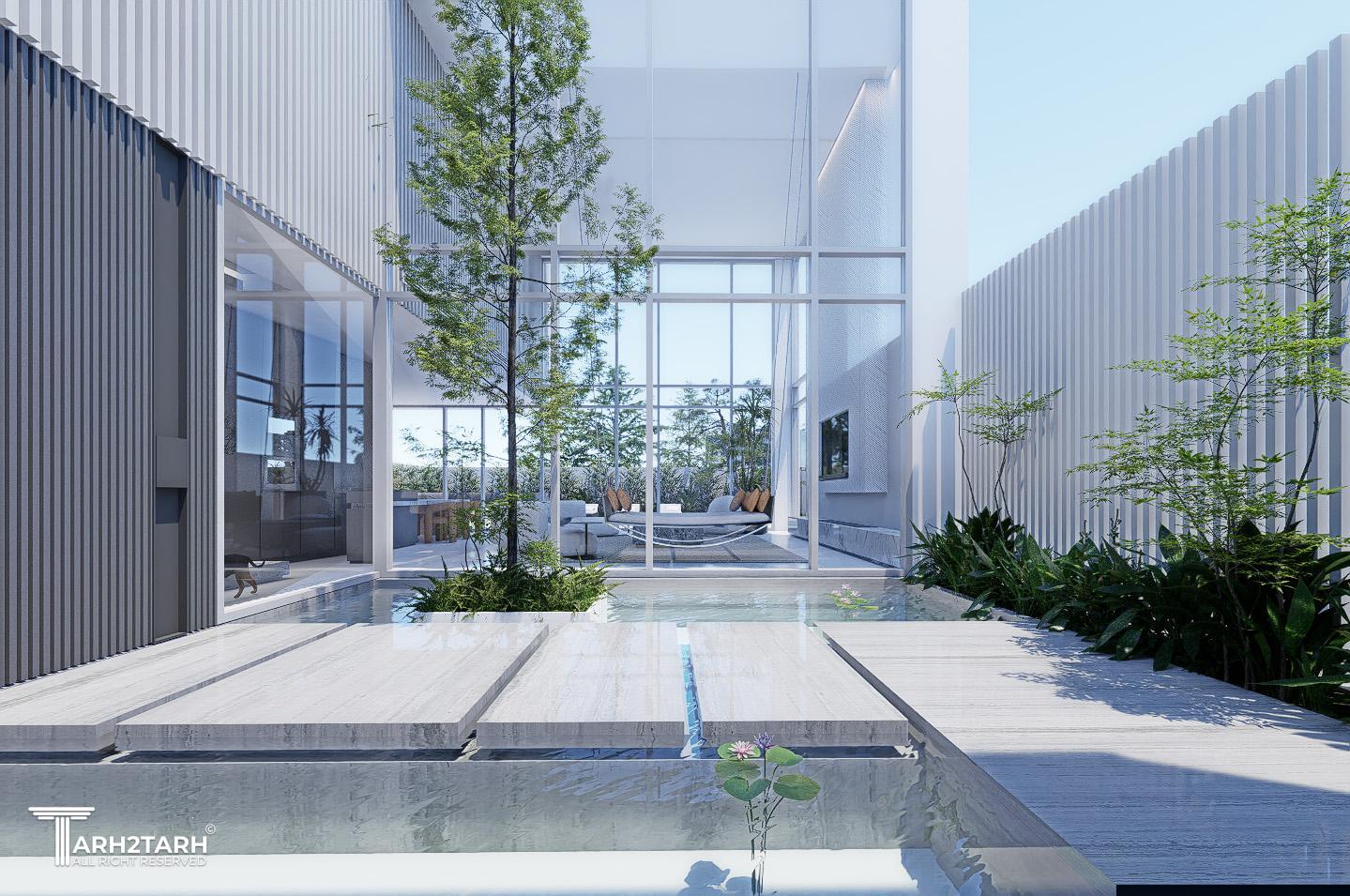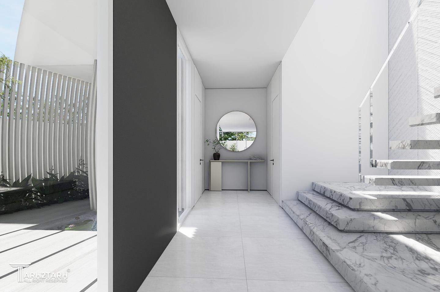 این پروژه در شهرکی کوچک خصوصی طراحی شده. در زمینی با کشیدگی طولی زیاد که روند طراحی جوری بوده که ویلا از معبر درون گرا باشد . ورودی ویلا به صورت یک حیاط مرکزی در دل خانه است تا قسمت اصلی خانه بدون دید از معبر باشد.