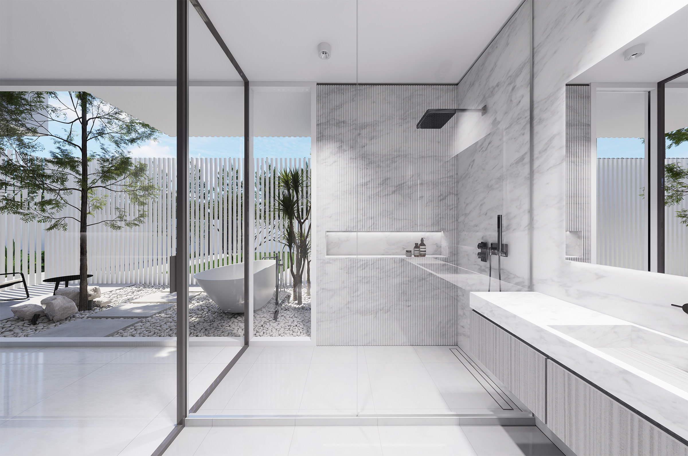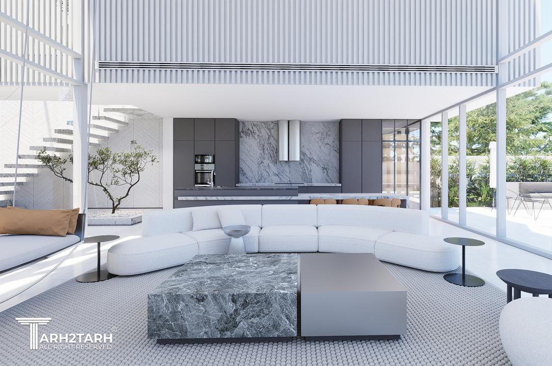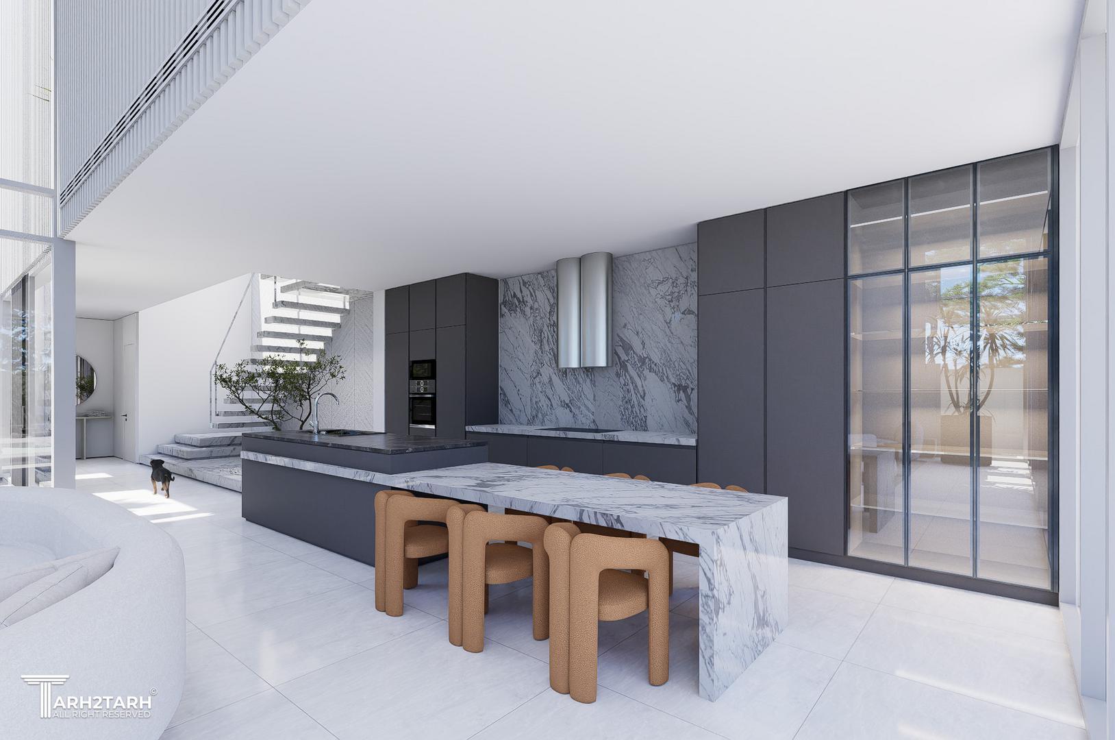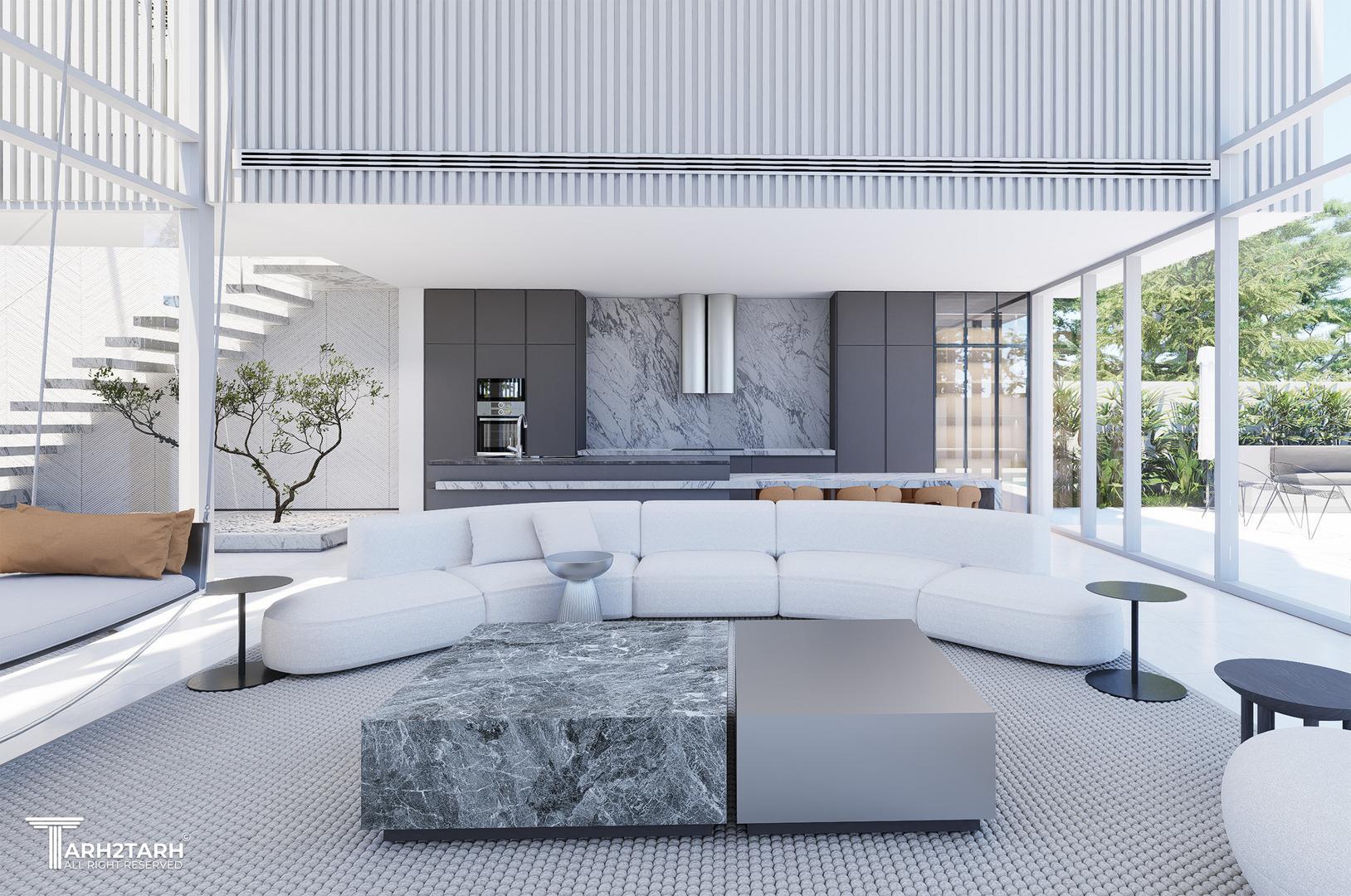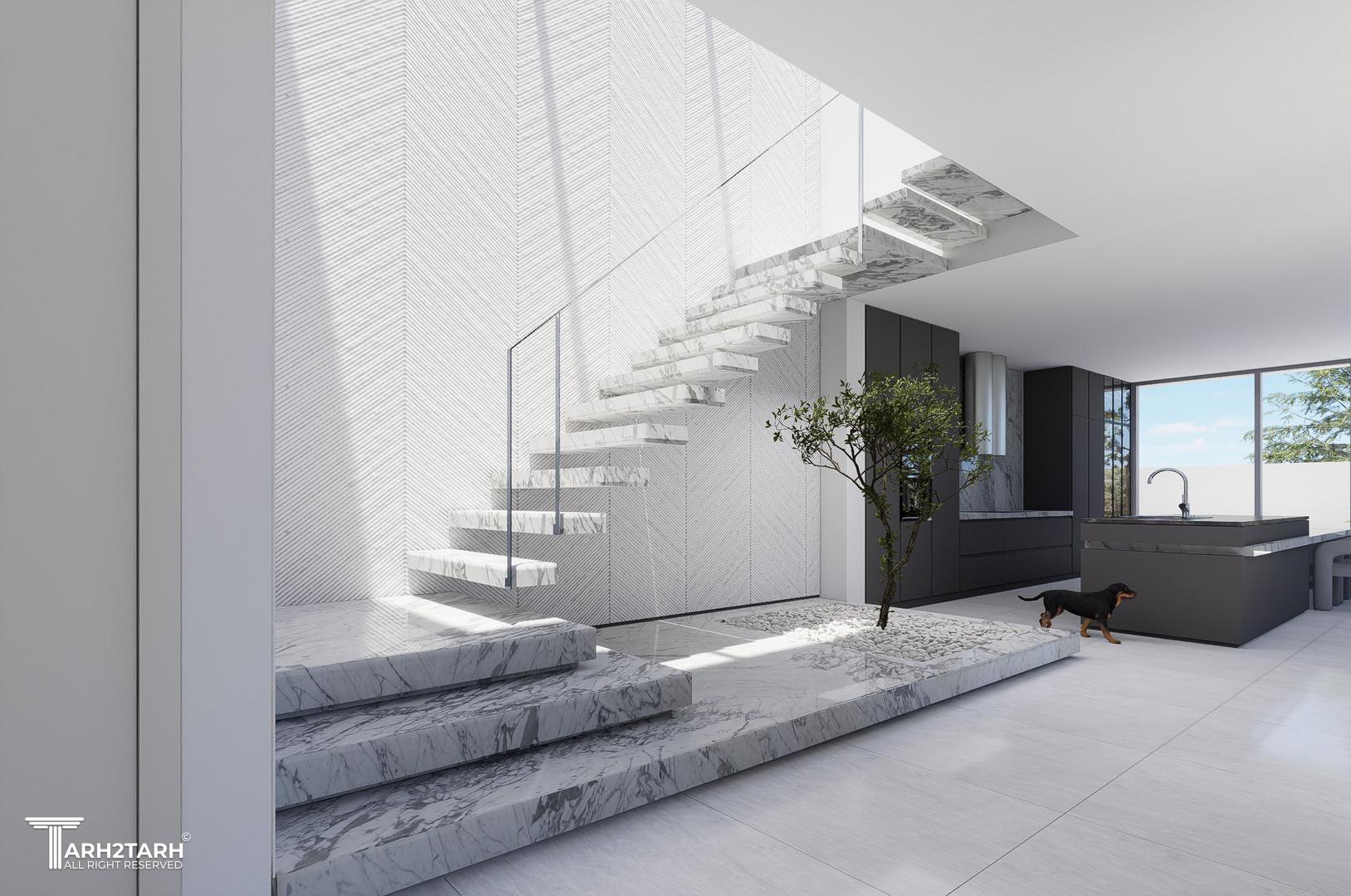 این پروژه در شهرکی کوچک خصوصی طراحی شده. در زمینی با کشیدگی طولی زیاد که روند طراحی جوری بوده که ویلا از معبر درون گرا باشد . ورودی ویلا به صورت یک حیاط مرکزی در دل خانه است تا قسمت اصلی خانه بدون دید از معبر باشد.