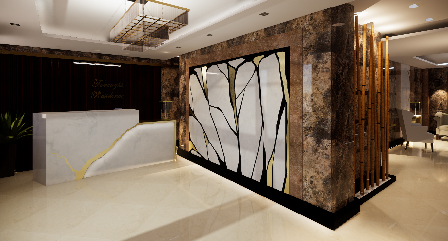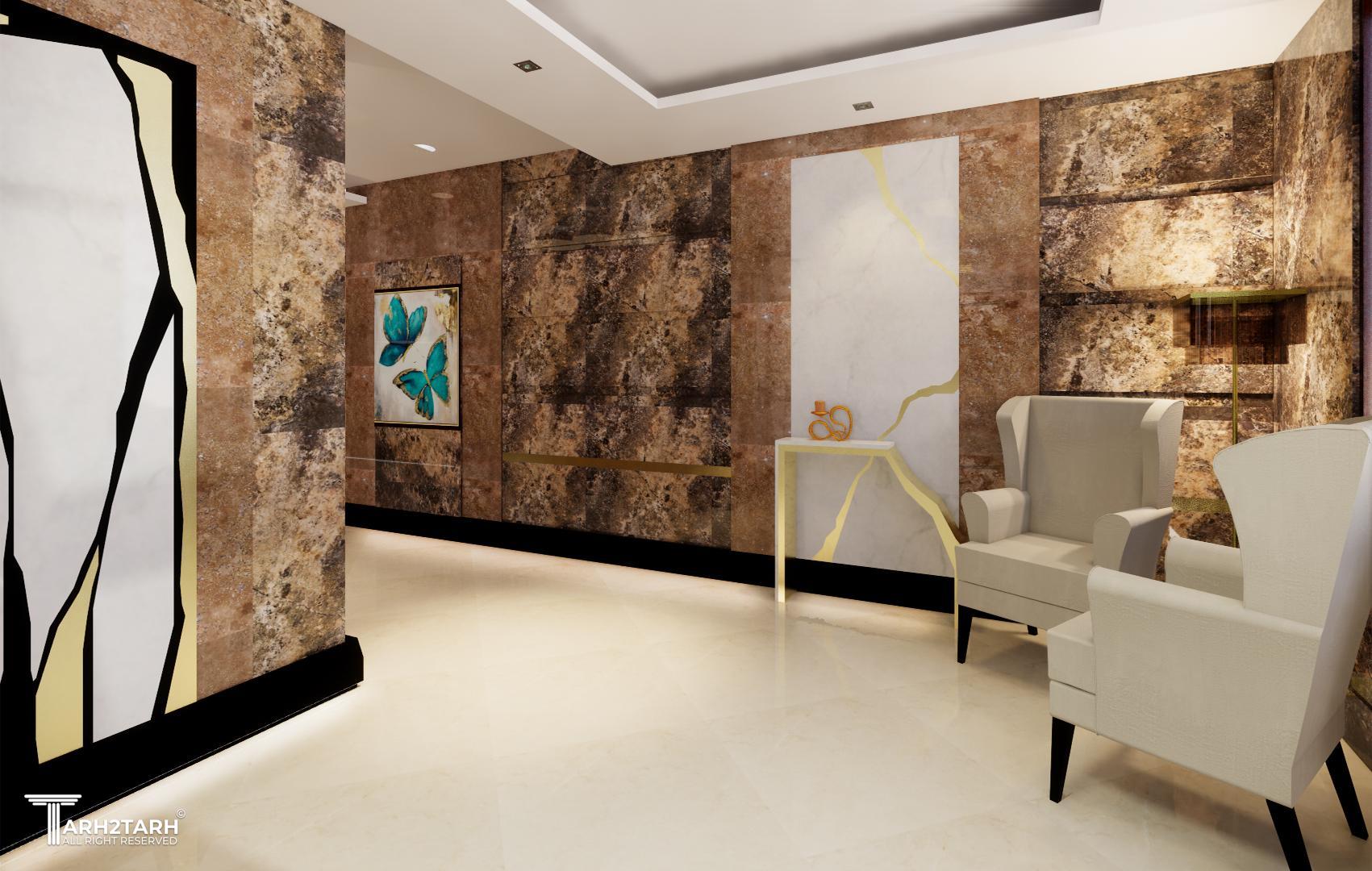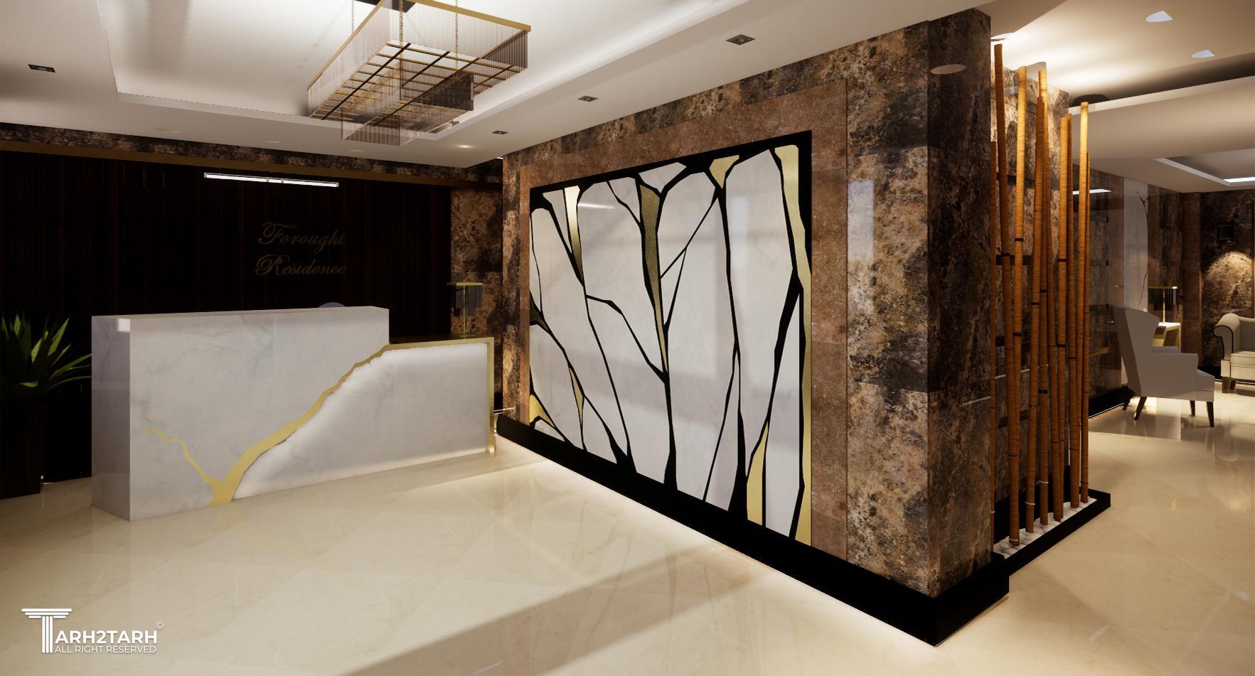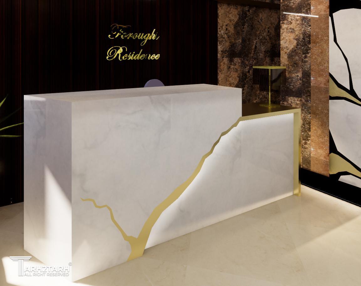 طراحی داخلی لابی ساختمان مسکونی- طراحی میز ریسپشن- کنسول- پنل سنگی معرق