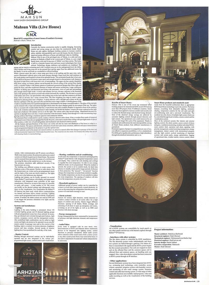 ویلای مهسان واقع در شهرک غرب نبش فلامک 4 واقع شده وطراحی ونظارت پروژه در اختیار تیم ما بوده که در سال 1389 ساخته شده ودر مسابقات تلفیق معماری مدرن با معماری سنتی BINAL KNX competition of smart homes-Frankfurt-Germanyمقام 7 را کسب نمود.