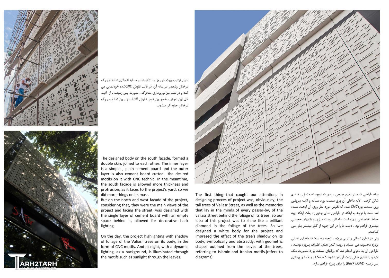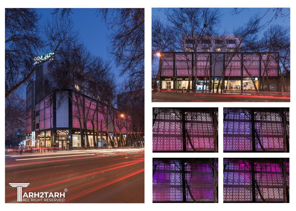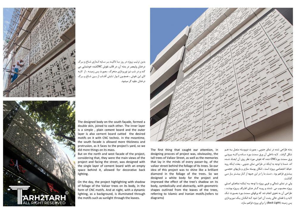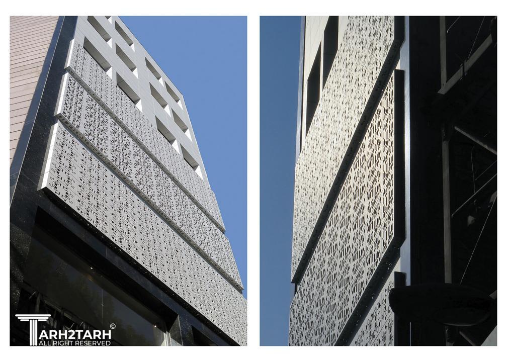 تمرکز ویژهای بر دو جنبه : سایهاندازی درختان خیابان بر روی نما، و ایجاد یک شکل یا فرم هندسی خاص در طراحی.