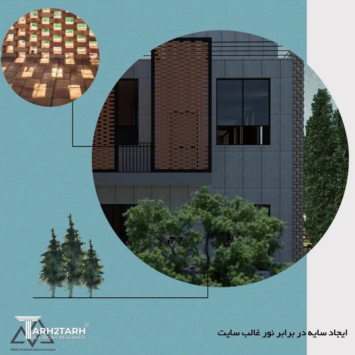 از جمله موارد حائز اهمیت در این پروژه، تقابل با نور مزاحم جبهه غرب و همچنین بادهای گرم منطقه است که راهکارهایی همچون شکست در پلان، سایه اندازی با المانهای الحاقی، استفاده از پوشش گیاهی در نمای اصلی و محوطه، طراحی قابهای مشبک و... برای حل این موارد ارائه گردید.