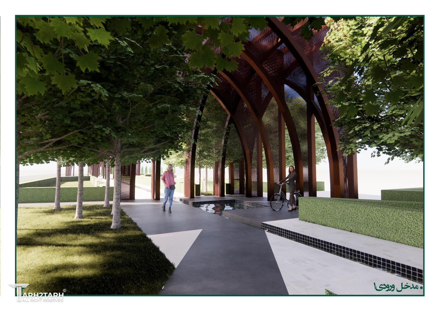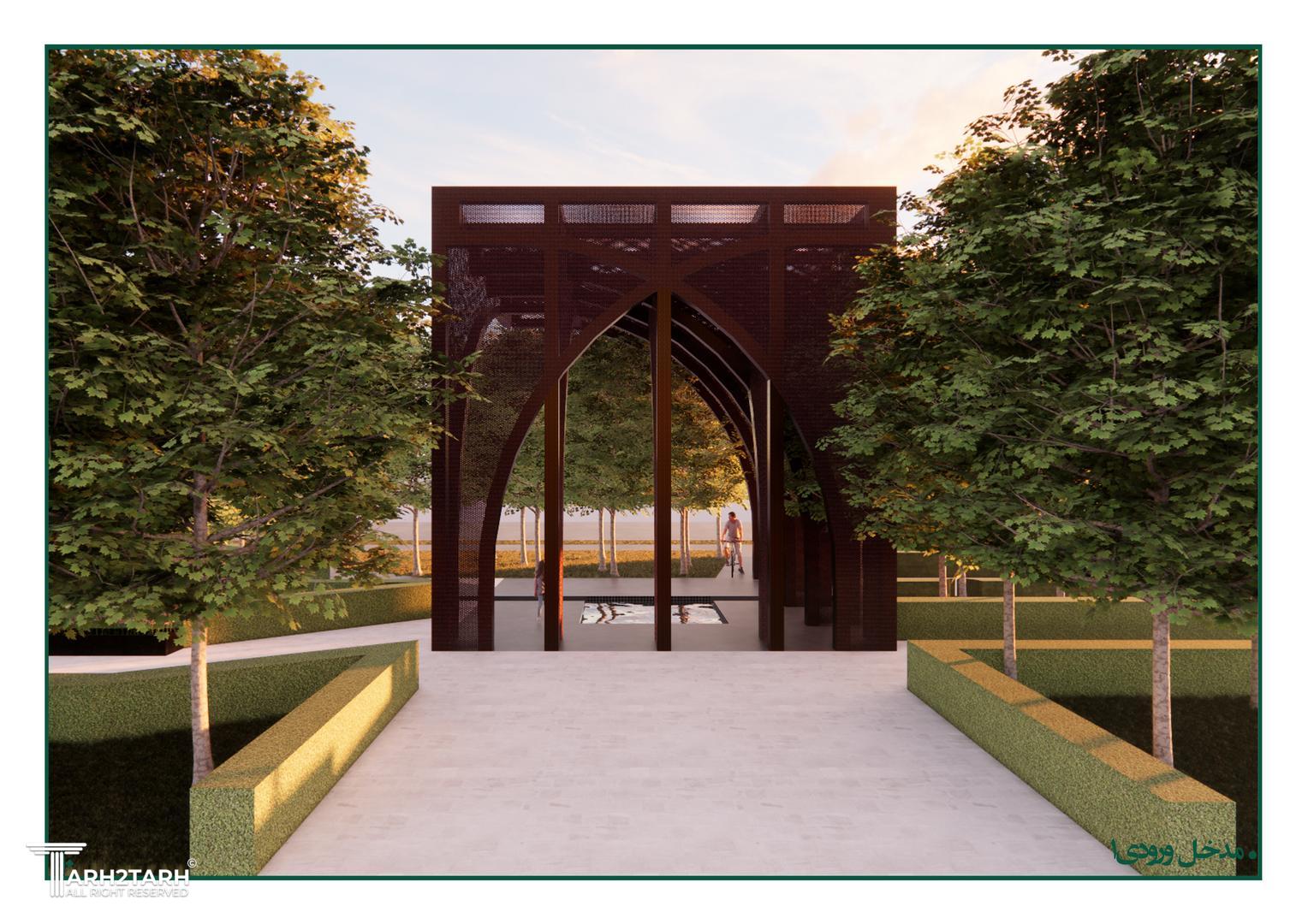 طراحی عرصه ورودی شرقی باغ غدیر در جنوب شرق اصفهان که بازخوانشی از مفهوم باغ ایرانی است به نوعی معاصر سازی فضایی شهری است که خود له ذات ارزشمند است. این عرصه شهری با توده نیمه متراکم درختان به موازات خیابان فردوسی و در ارتباط مستقیم با مناطق مسکونی پر تراکم منطقه قرار دارد. برای ورود به سایت بعد عبور از میان درختان به پیاده راهی هدایت میشویم که دارای شش فصل مشترک با مسیرهای موازی هم می باشد. این شش فصل مشترک که آنها را گرههای حرکتی می نامیم بهترین موقعیت برای طراحی مدخلهای ورودی عرصه شرقی را فراهم می نمایند. راههای مابین درختان به نوعی جنبه هدایت و جمع کنندگی به سوی مدخلهای ورودی خواهند بود که خوانایی و رویت پذیری طرح را افزایش خواهند داد. استفاده حداکثری از فضاهای ما بین درختان فرصت مناسبی برای طراحی فضاهای گردهمایی در محیطی سرسبز را فراهم می کند در منتهی الیه شرقی باغ سازمان بازنشستگی و در منتهی الیه غربی آن فضای بازی کودکان واقع شده که راهنمای ما برای در نظر گرفتن فضاهای مناسب این کاربریها خواهد بود. با مطالعه معماری باغ های ایرانی هر باغ علاوه بر کوشک میانی از عمارتی به نام عمارت سردر تشکیل شده که کارکرد اصلی آن تعریف فضای ورود به باغ و کاربرد اجتماعی آن دیدارهای عمومی و برگزاری مراسم بوده است.