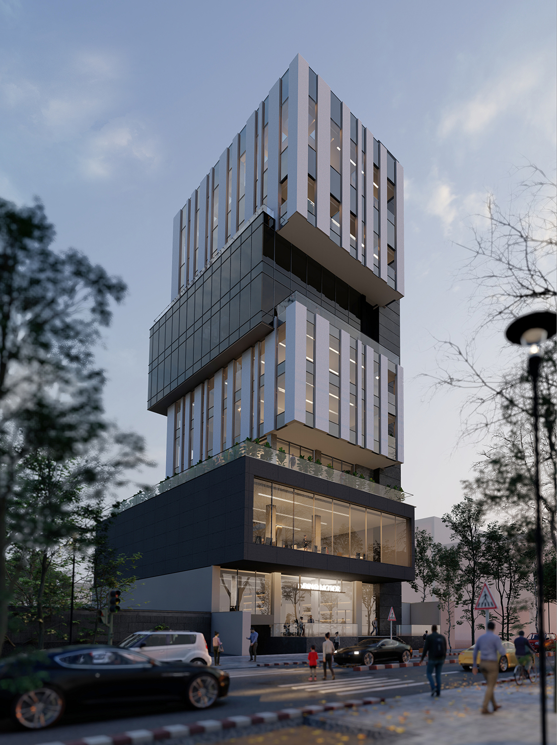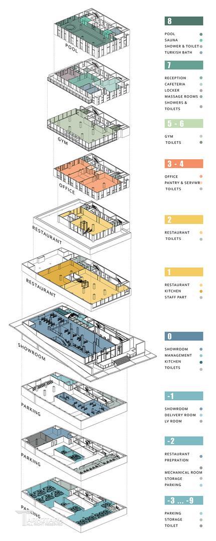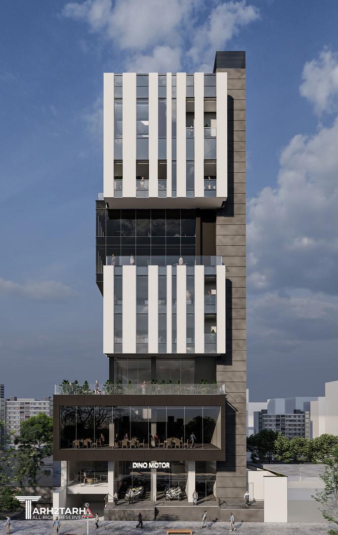 این پروژه برای شرکت Dino Motor در جنوب ایستگاه متروی قیطریه طراحی شده است. کارفرما خواستار یک ساختمان با سه کاربری اداری،ورزشی و تجاری در کنار هم بود. در نتیجه، ما کاربریهای مورد نظر کارفرما را در قالب مکعبهای جداگانه که روی یکدیگر میلغزند طراحی کردیم. پروژه شامل ۹ طبقه پارکینگ، یک طبقه شوروم موتور، دو طبقه رستوران، دو طبقه دفتر اداری، دو طبقه باشگاه ورزشی، یک طبقه لاکر و پیش ورودی باشگاه و یک طبقه استخر است. طراحی داخلی پروژه از سبک مینیمال الهام گرفته و بیشتر از رنگهای خنثی استفاده میکند.