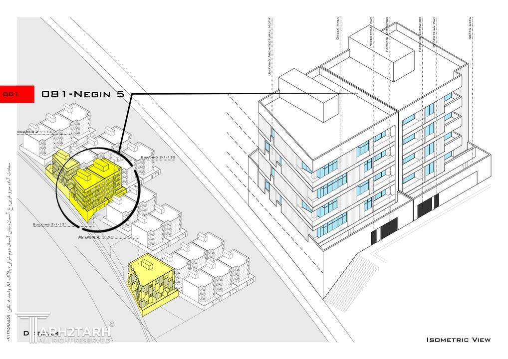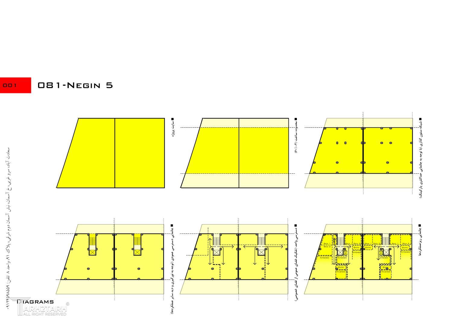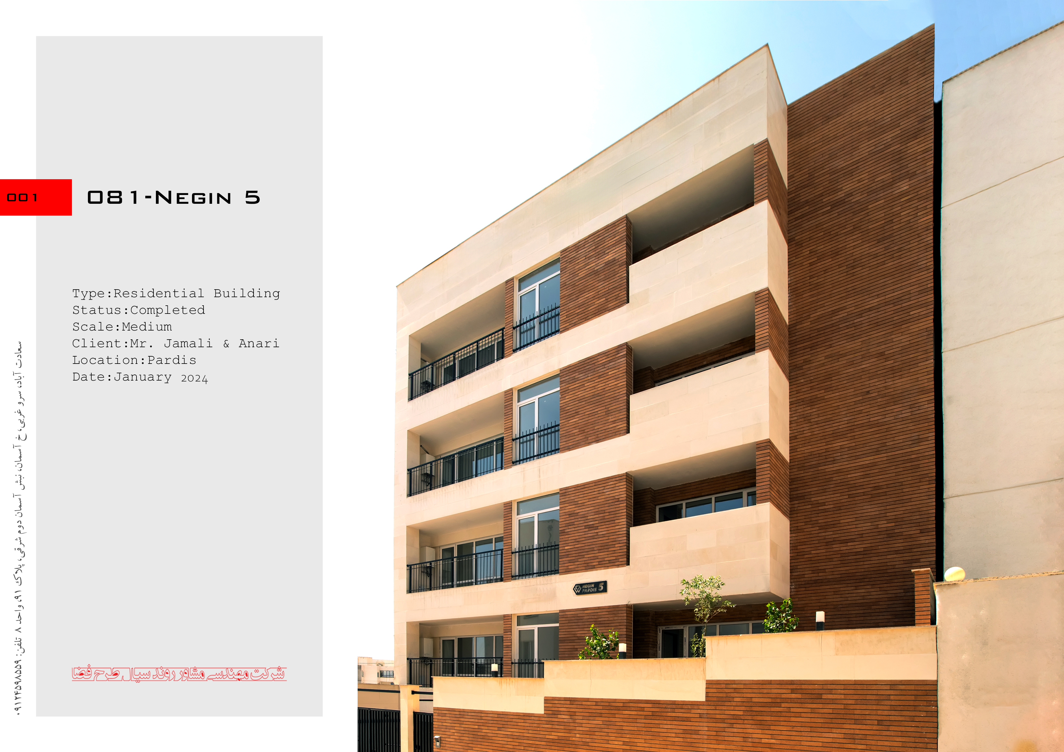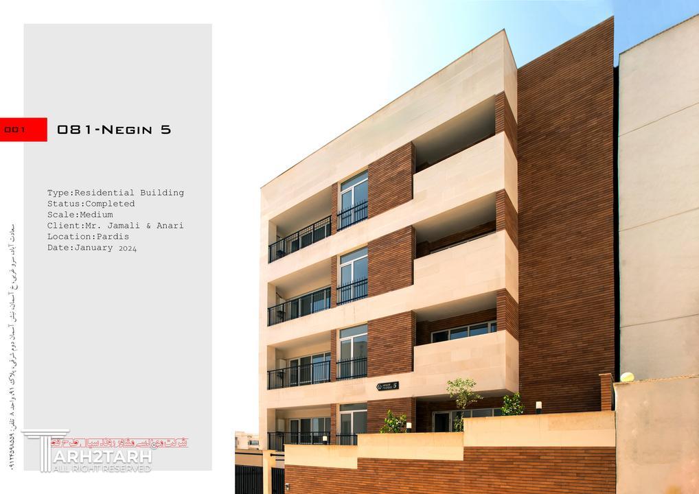 ساختمان نگین 5 یکی از 3 ساختمان کنار هم در فاز 8 پردیس است. در این پروژه سعی شده که هماهنگی از نظر خطوط نما و متریال و ماهیت طرح بین این 3 تا ساختمان ایجاد شود. چون سایت پروژه در کنار مسکن مهر پردیس واقع شده است، در حین طراحی سعی شده است که با حداقل هزینه ساخت بهترین کیفیت و بیشترین فضای مفید را برای سازنده فراهم کنیم