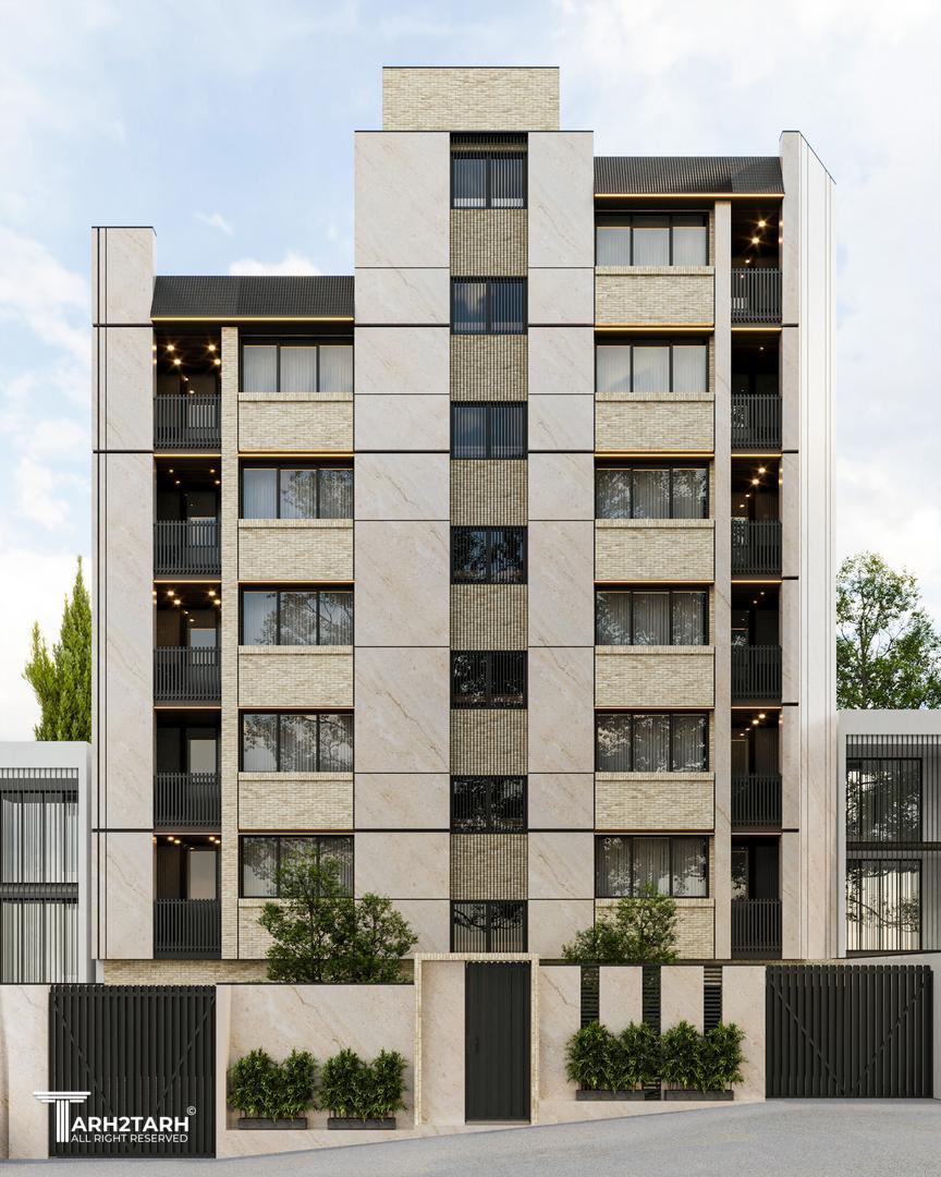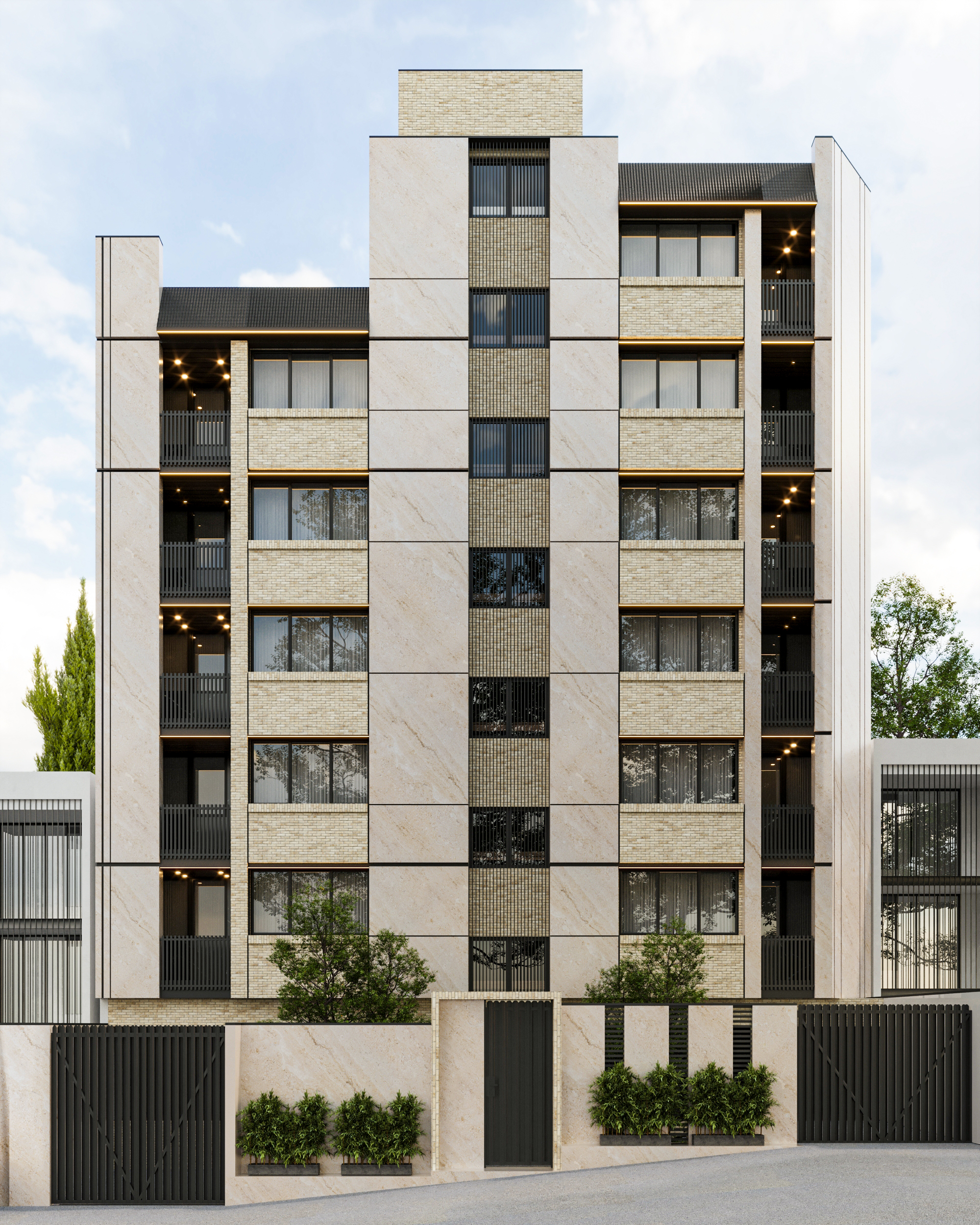 این پروژه بر اساس خواست کارفرما و با هدف خلق ساختمانی شکل گرفت که در عین پاسخگویی به ضوابط شهرسازی ، دارای هویتی منسجم و معمارانه باشد. در طراحی پلان، دو واحد در هر طبقه با رویکرد تعادل عملکردی و کیفیت فضایی برابر سازماندهی شدند. درون هر واحد، نشیمن و پذیرایی در جبههی جنوبی بهعنوان فضای عمومی و اتاقهای خواب در سمت شمال بهعنوان فضای خصوصی قرار گرفتهاند که این چیدمان، خوانایی و آرامش فضایی را تقویت میکند. در بخش پارکینگ، ساختار سازهای و جانمایی پله و آسانسور بهگونهای طراحی شد که امکان توسعه و تغییر در حین اجرا فراهم باشد. در طراحی نما، هدف ایجاد ترکیبی از نظم و پویایی در قالب حجمی خوانا و منسجم بود. با استفاده از خطوط افقی و تقسیمبندی نما به نسبت ۱–۳–۱، انسجام بصری حجم تقویت و تناسبات آن کنترل شد. ترکیب سنگ کرم روشن، آجر زنده و فریمهای فلزی تیره با ایجاد تضادی کنترلشده به خوانایی و تعادل بصری نما منجر شده است. در نهایت، این پروژه تلفیقی است از تعادل عملکردی، انسجام فرمی و هویتی معمارانه در بستر شهری.