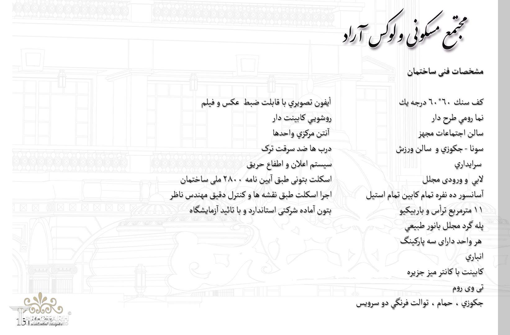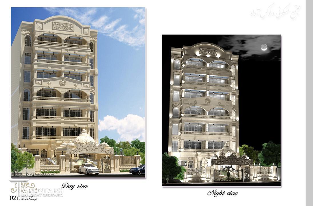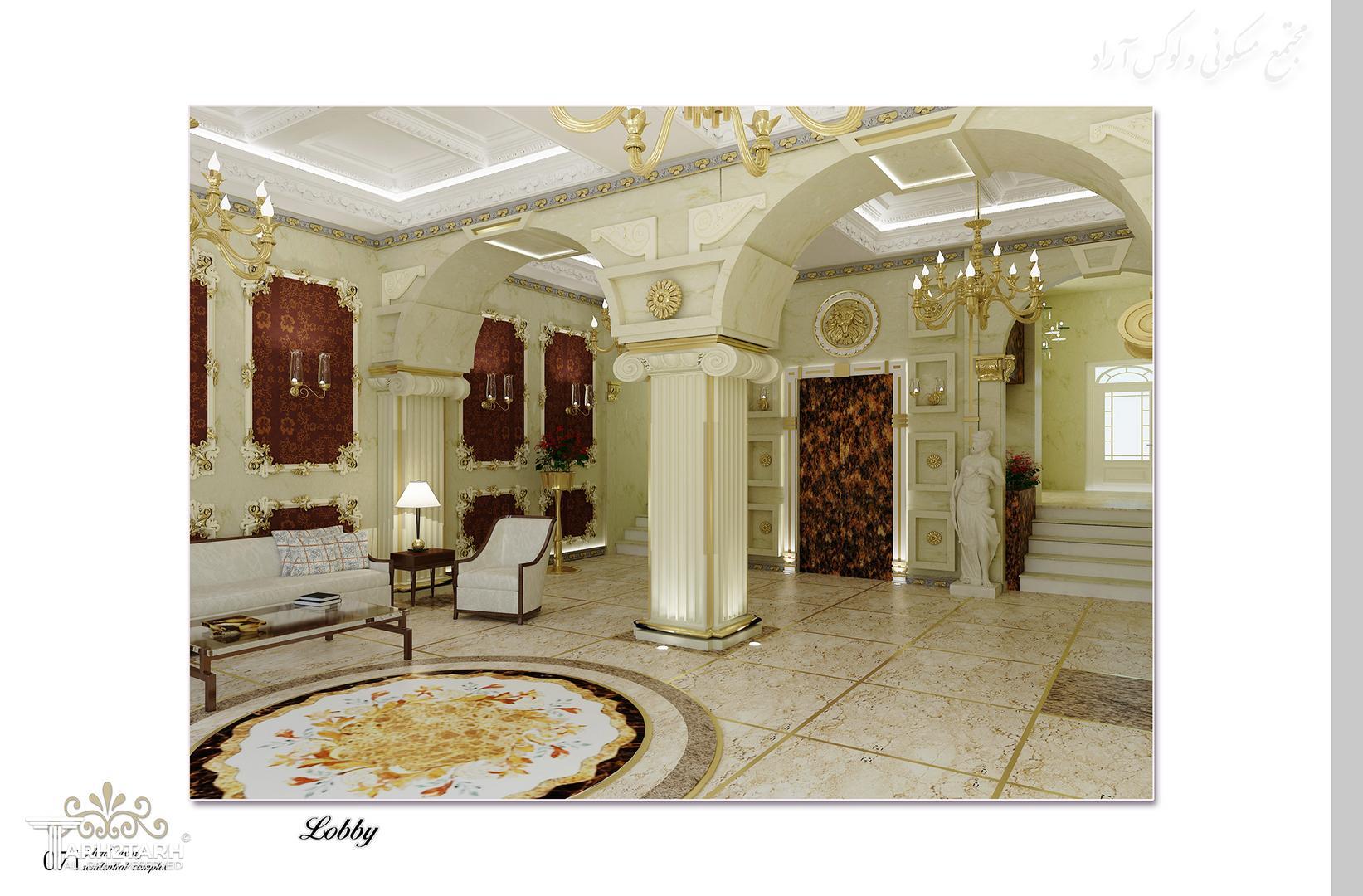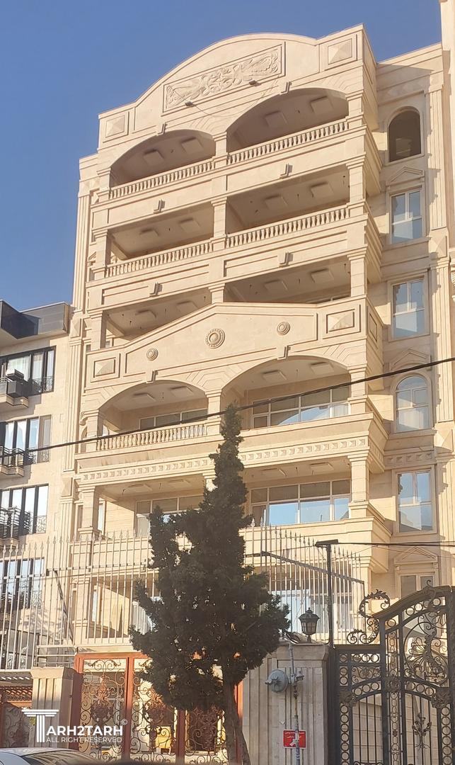 ساختمان کلاسیک در عظیمیه کرج، با نمای سنگی روشن، ستونهای بلند کورینتی، و لابی ۶ متری مجلل با چلچراغ کریستالی. پلانها نورگیر، با تراسهای عریض، آشپزخانه جزیرهای، و اتاق مستر با کلوزت و وان ایستاده. امکانات شامل سالن اجتماعات، باشگاه، و پارکینگ طبقاتی با آسانسور شیشهای.