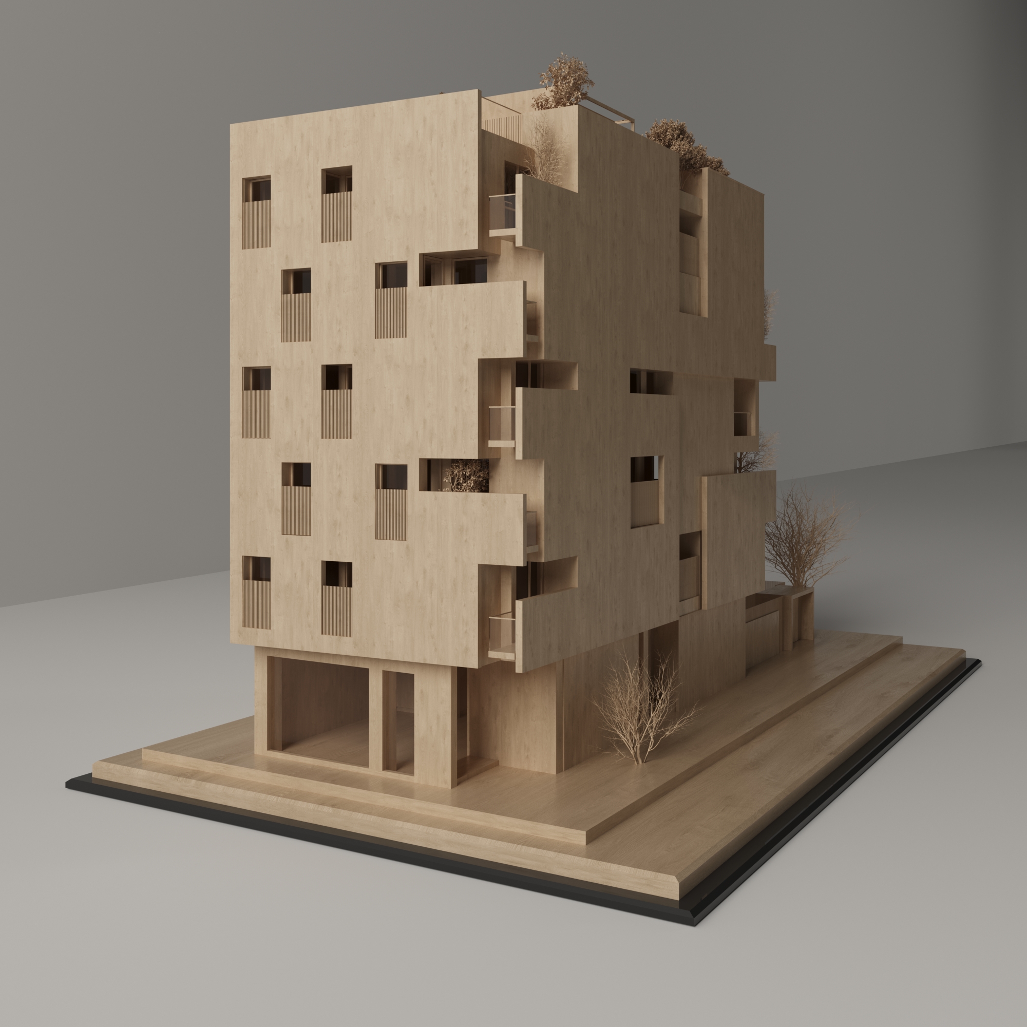 طراحی پروژه مسکونی آپادانا روی اسکلت موجود انجام شد. با توجه با وضعیت موجود دستگاه پله و ستونها تلاش شد تا طرحی بهینه برای پلان های طبقات و نما ایجاد شود به نحوی که بتوان پویایی و ریتم بصری را در نما تجربه کرد و همچنین پلان طبقات به نحوی یکی در میان روی هم قرار گرفتند تا فرمی تار و پودی در پخ اصلی نما دیده شود.