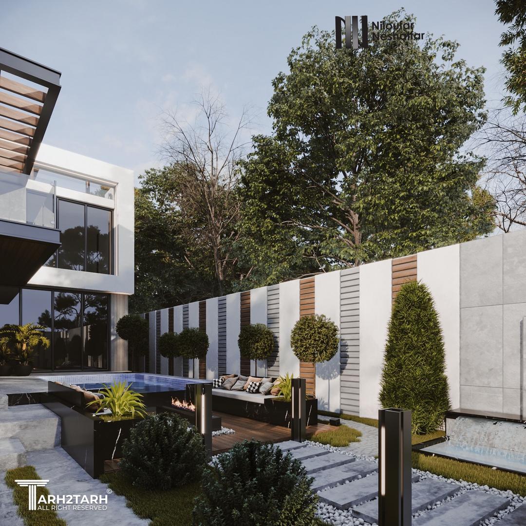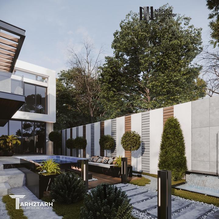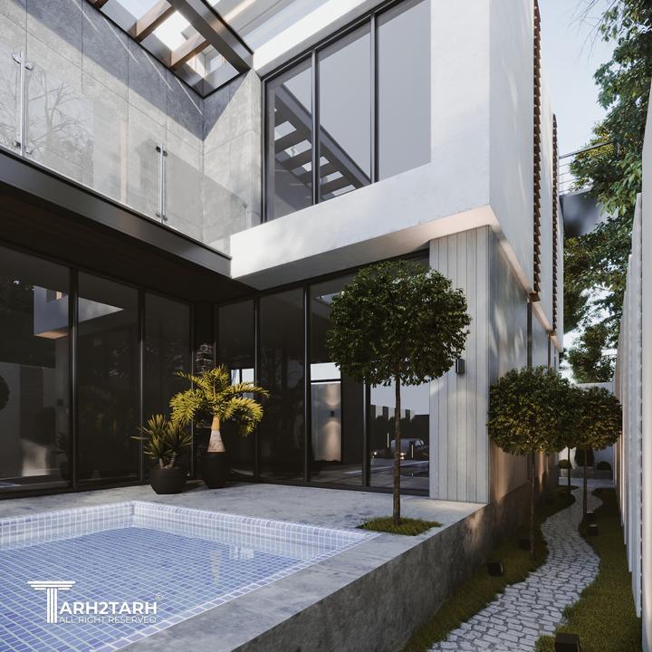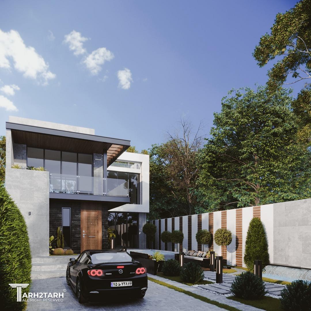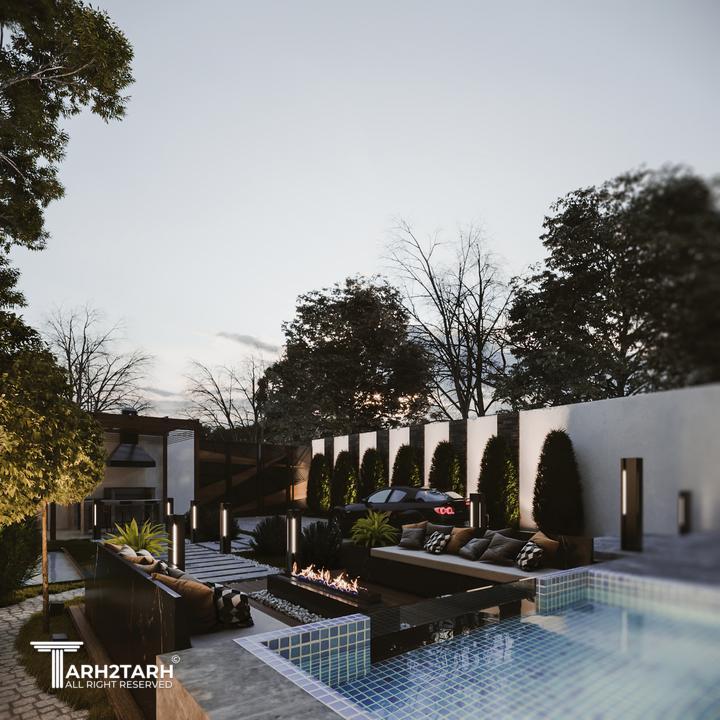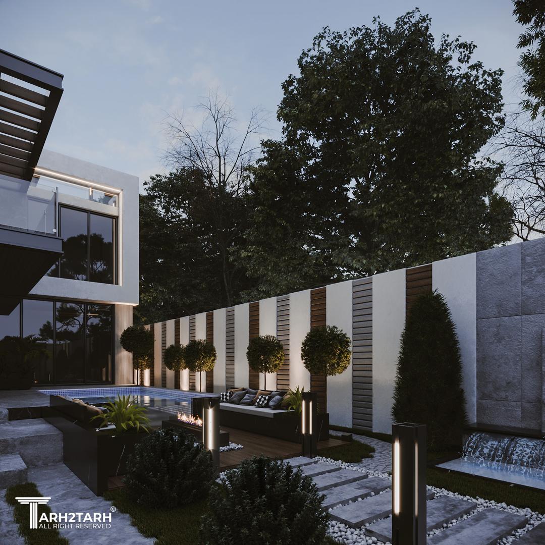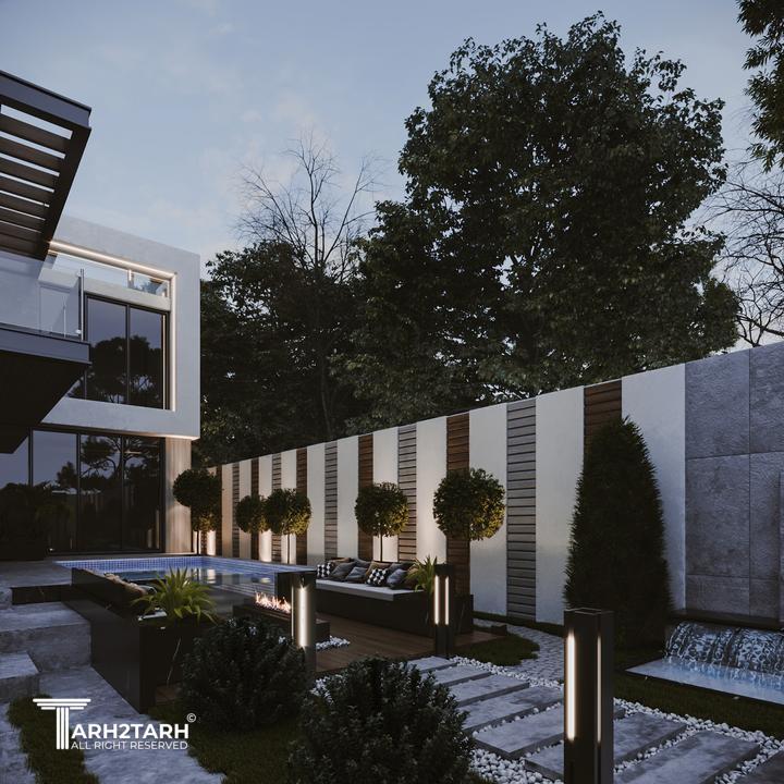 یک زمین با بر کم و شیب منفی در انتهای زمین به تیم سپرده شد باتوجه به سلیقه کارفرما به وجود متریال های متفاوت استخر در فضای باز و حداکثر لند اسکیپ پلان و نما طراحی شد
