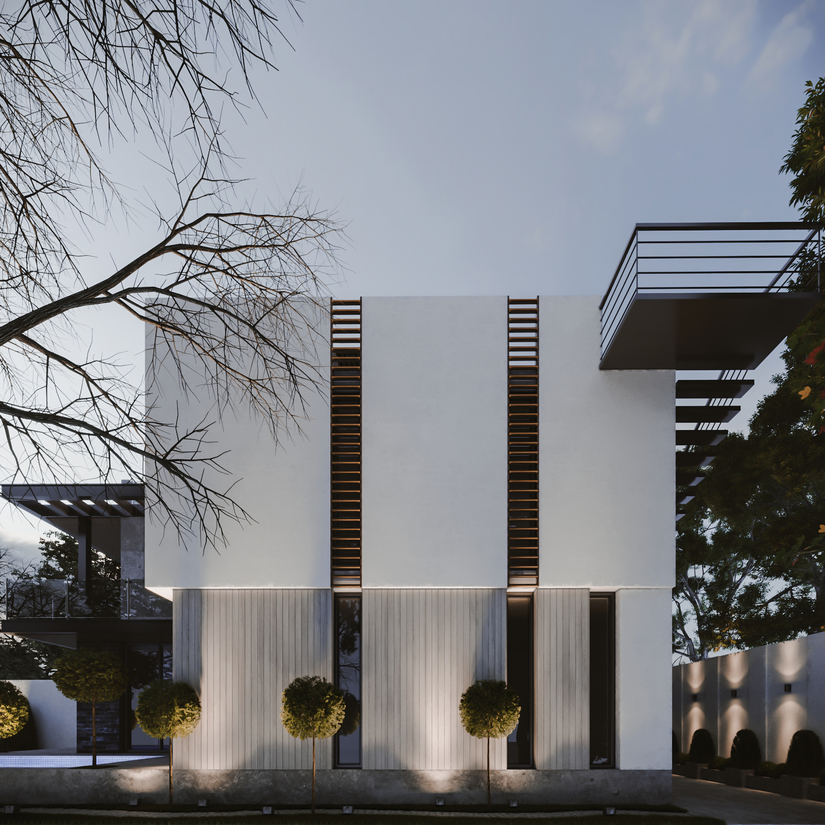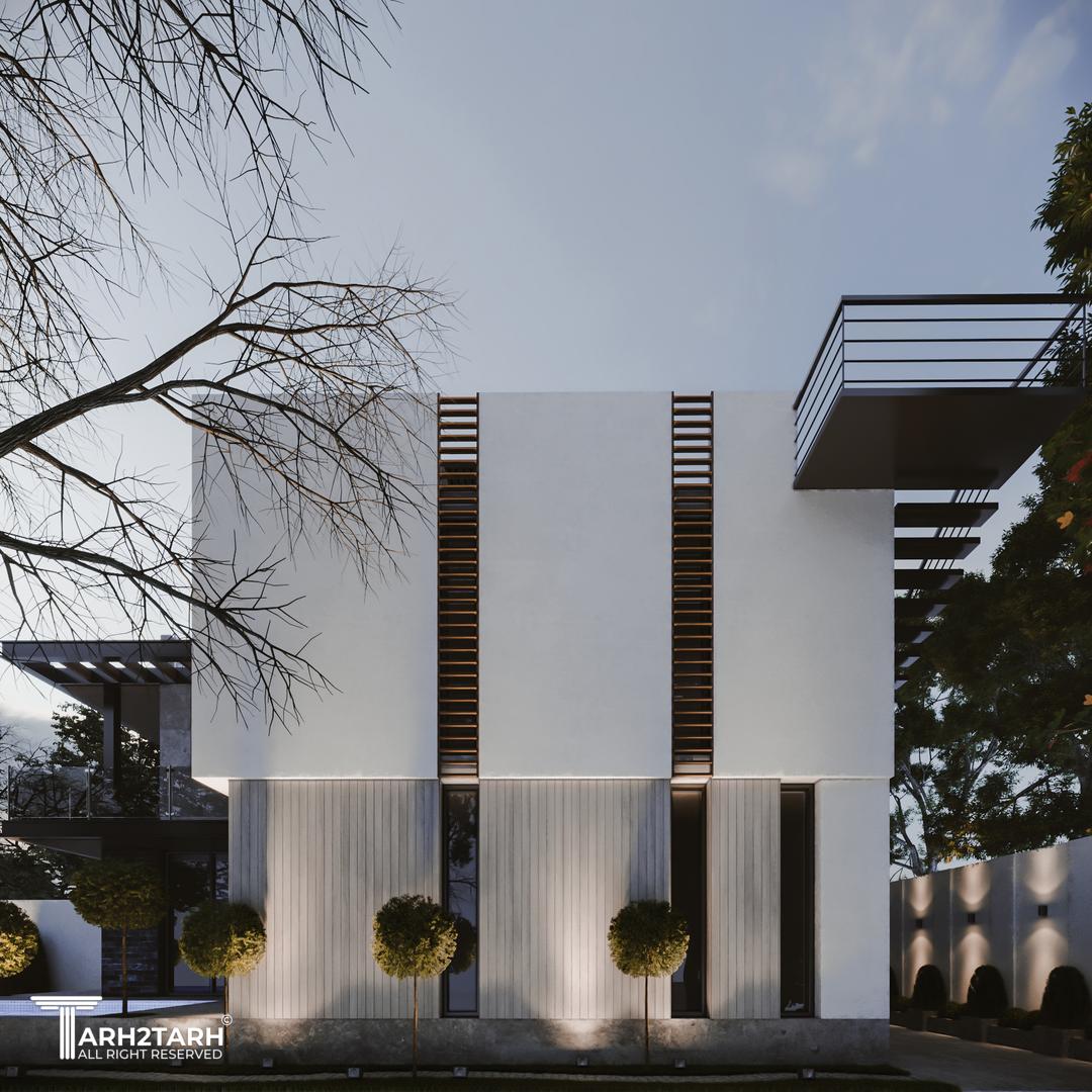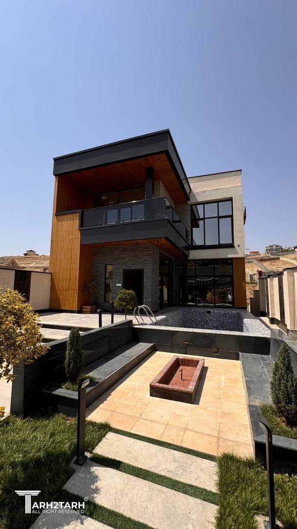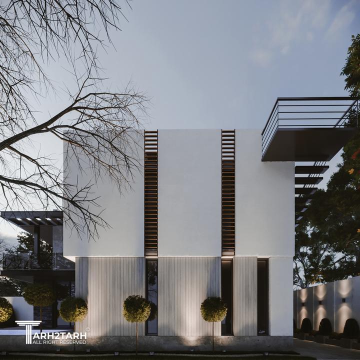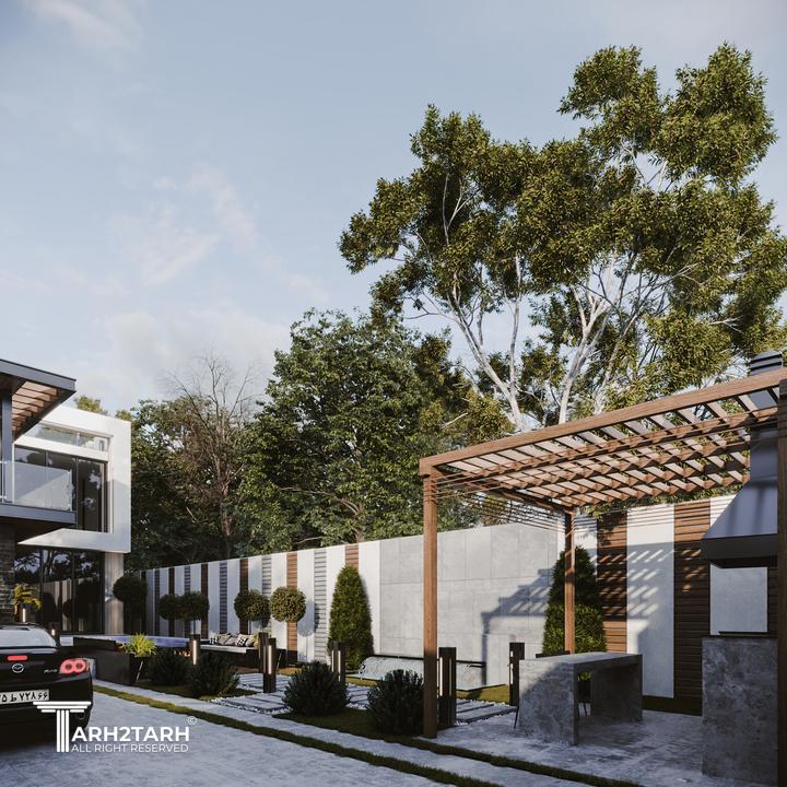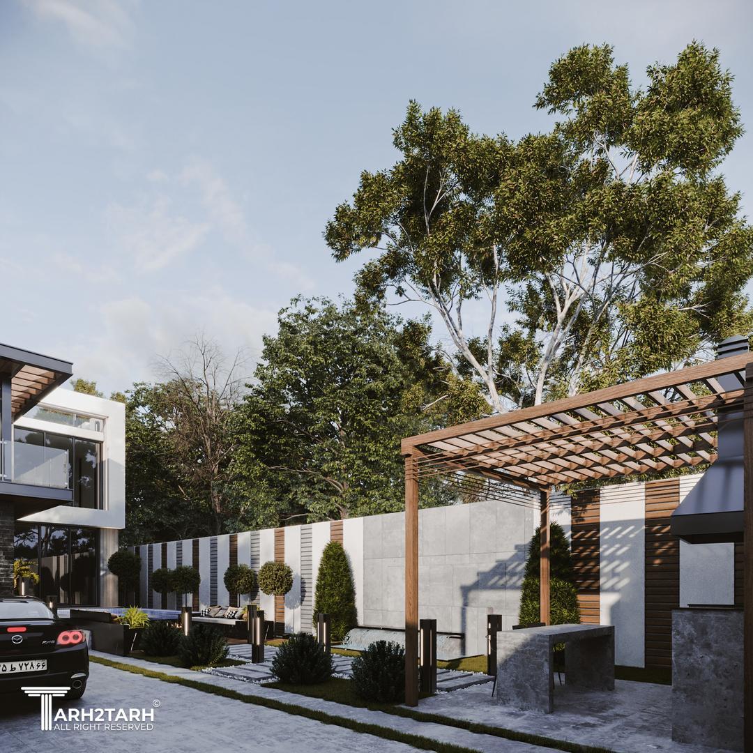 یک زمین با بر کم و شیب منفی در انتهای زمین به تیم سپرده شد باتوجه به سلیقه کارفرما به وجود متریال های متفاوت استخر در فضای باز و حداکثر لند اسکیپ پلان و نما طراحی شد