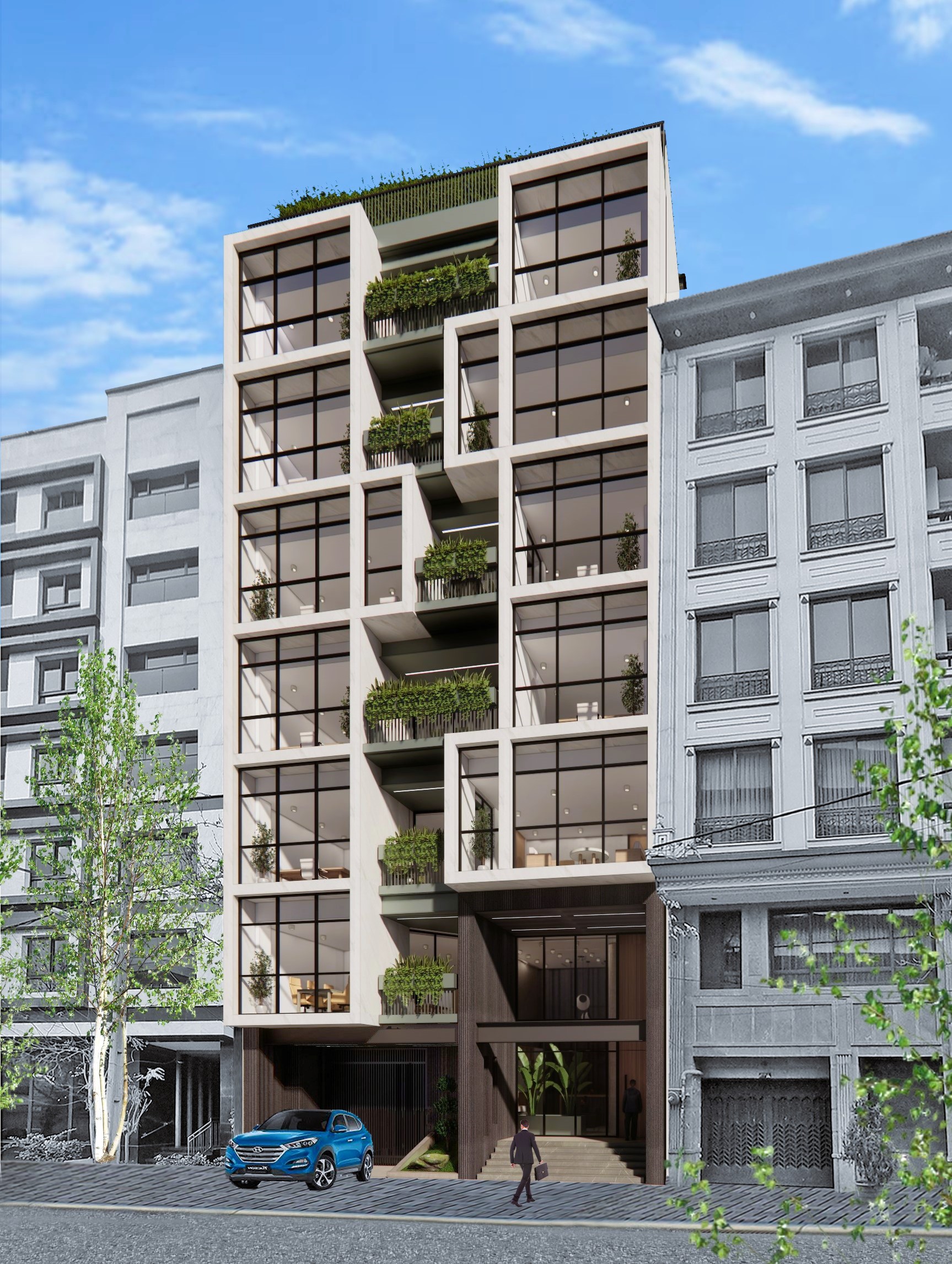 پروژه اداری خرسند، یک پروژه تغییر نقشه بر اساس ساختمان ساخته شده بود. چون اسکلت آن اجرا شده بود، محدودیت های زیادی برای طراحی وجود داشت. پلان ها از دو واحدی مسکونی-اداری به تک واحدی اداری تغییر کرد و تغییرات زیادی در ساختار نما و مشاعات انجام شد.
