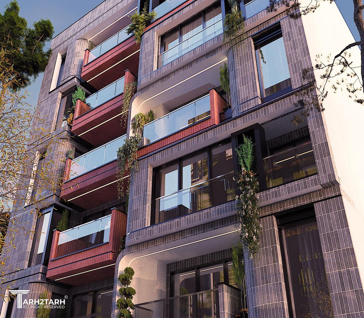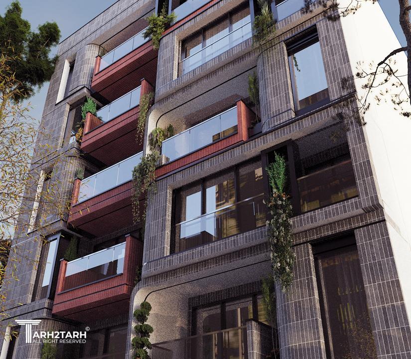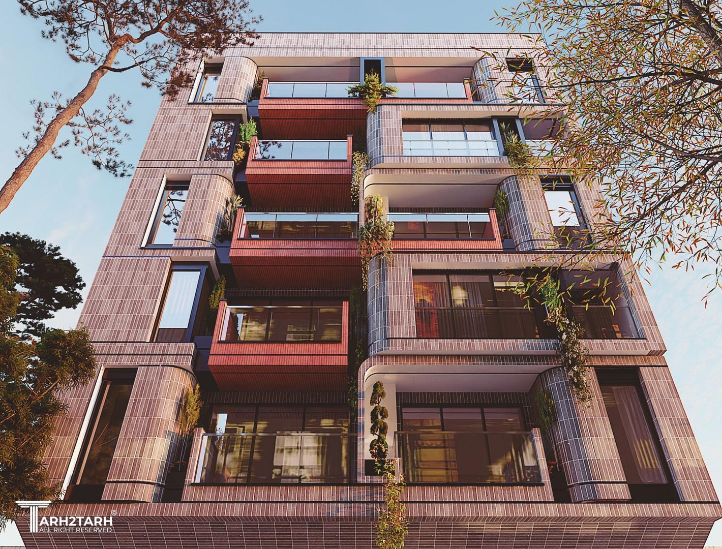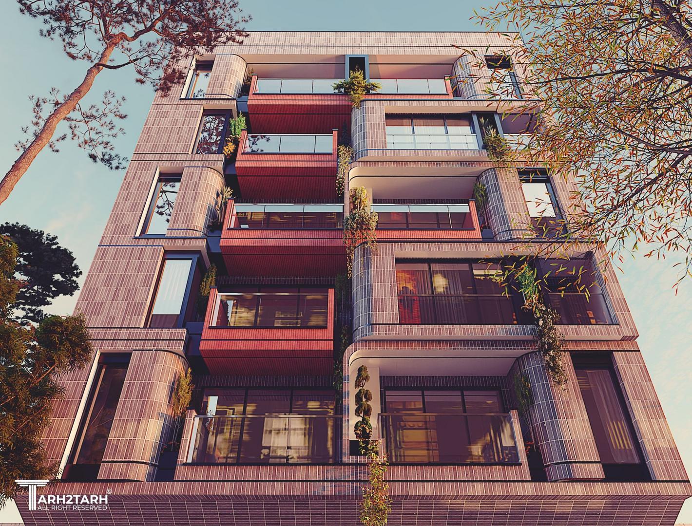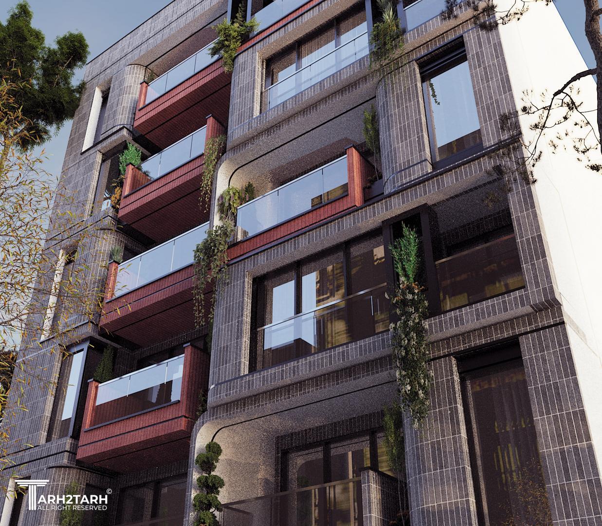 بدون ایجاد کنسول های بالای 1.5 متر تلاش داشتیم القا کنیم که عمق تراس ها با ابعاد بیشتری به نظر برسن و بهره مندی از اجر به عنوان متریال شایسته در معماری ایرانی و چالش نما به دلیل دو واحده بودن کمی سخت بود که با ایجاد فلاور باکس هایی که هم نقش جدا کردن واحد هارو بازی کردن و هم تاسیسات رو در خودشون جا بدن