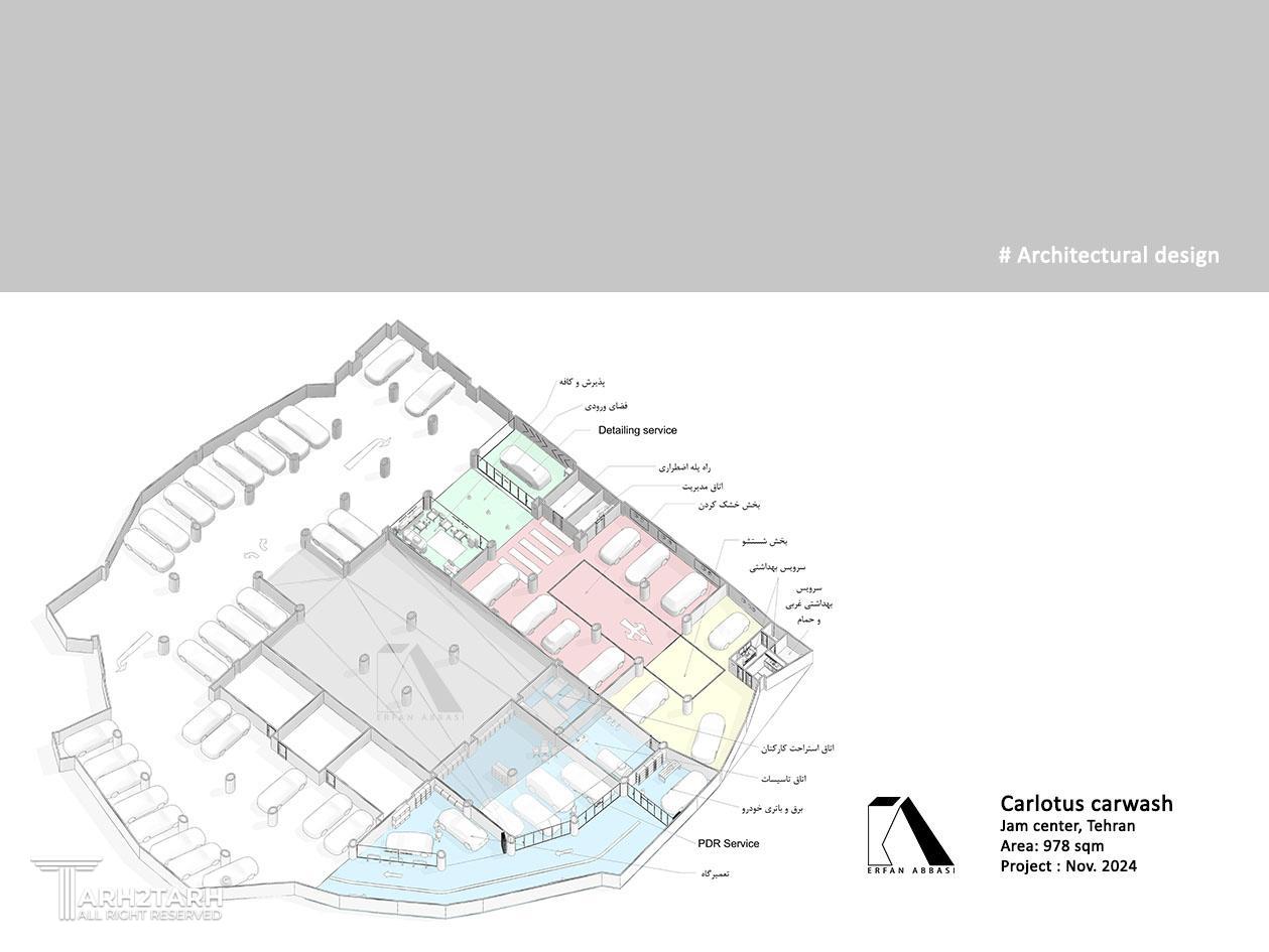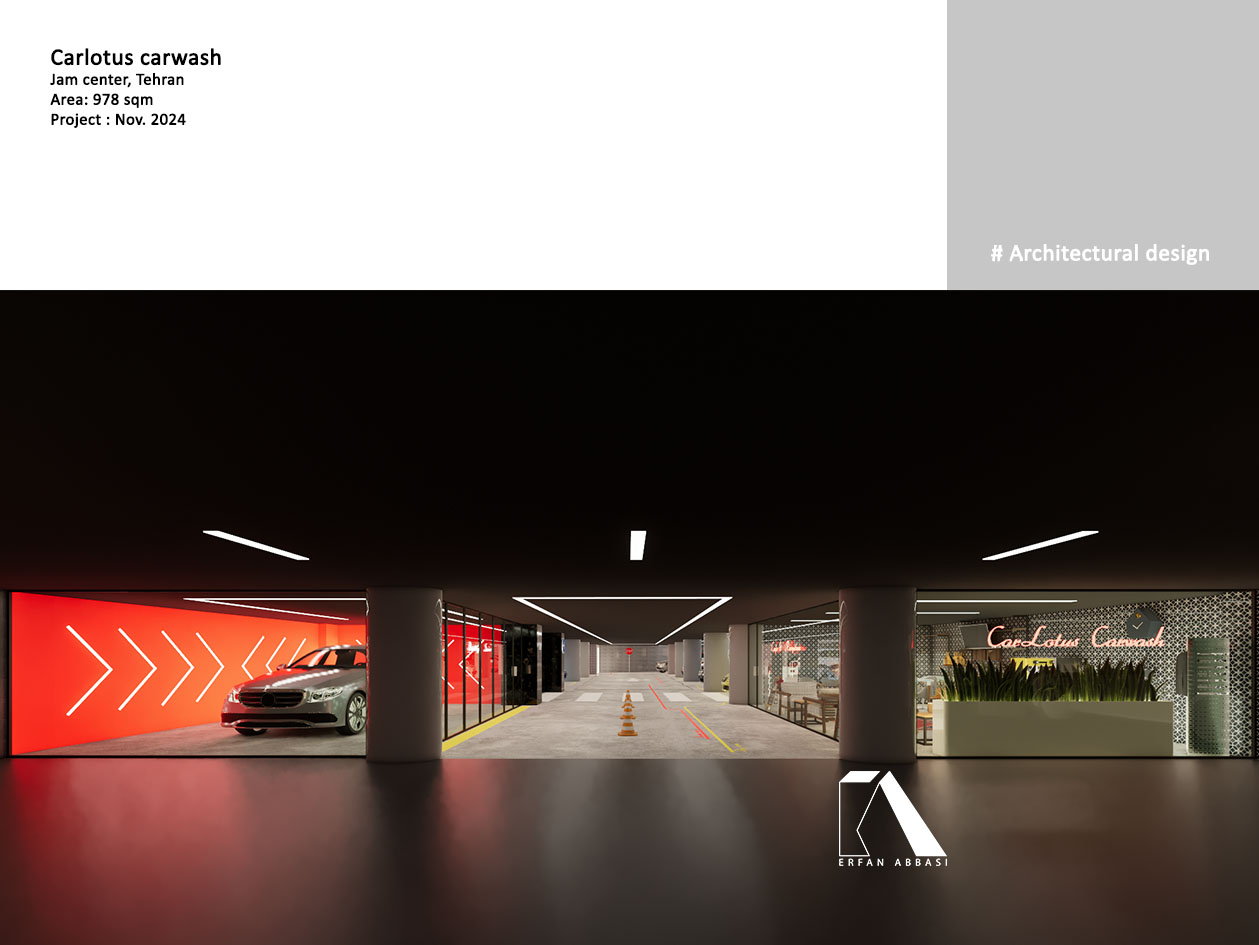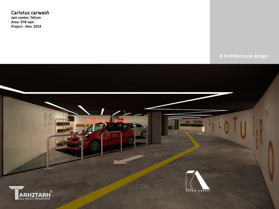 طراحی این مجموعه در پارکینگ مجتمع تجاری جم سنتر به متراژ 978 مترمربع و در طبقه 5- طبق چالشهای موجود و خواسته کارفرما که شامل عملکردهایی همچون کارواش، تعمیرگاه ، خدمات باتری و خدمات PDR میباشد، صورت گرفت.