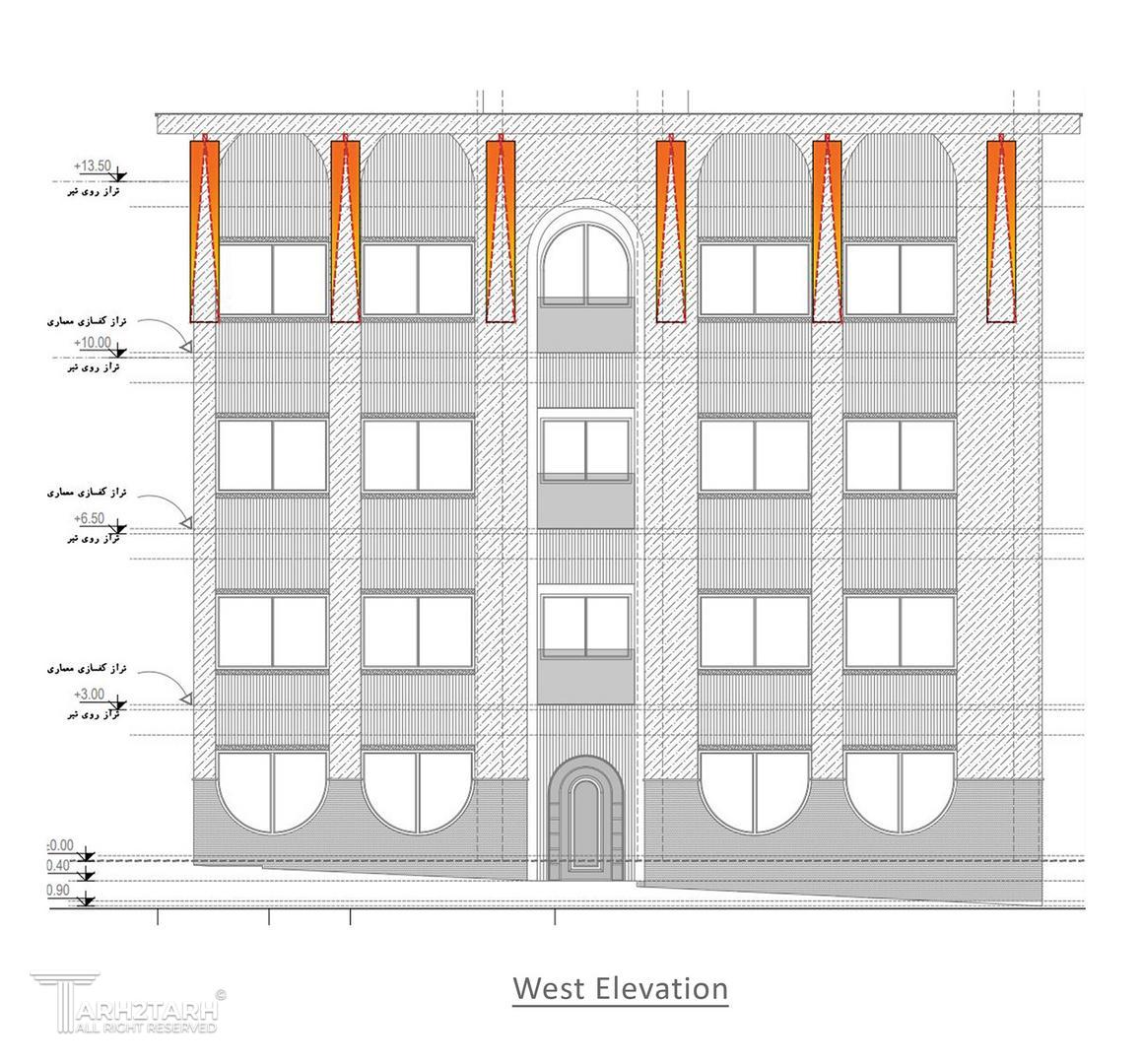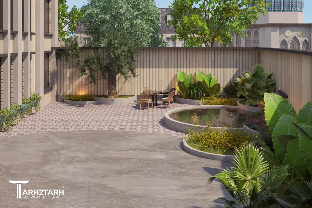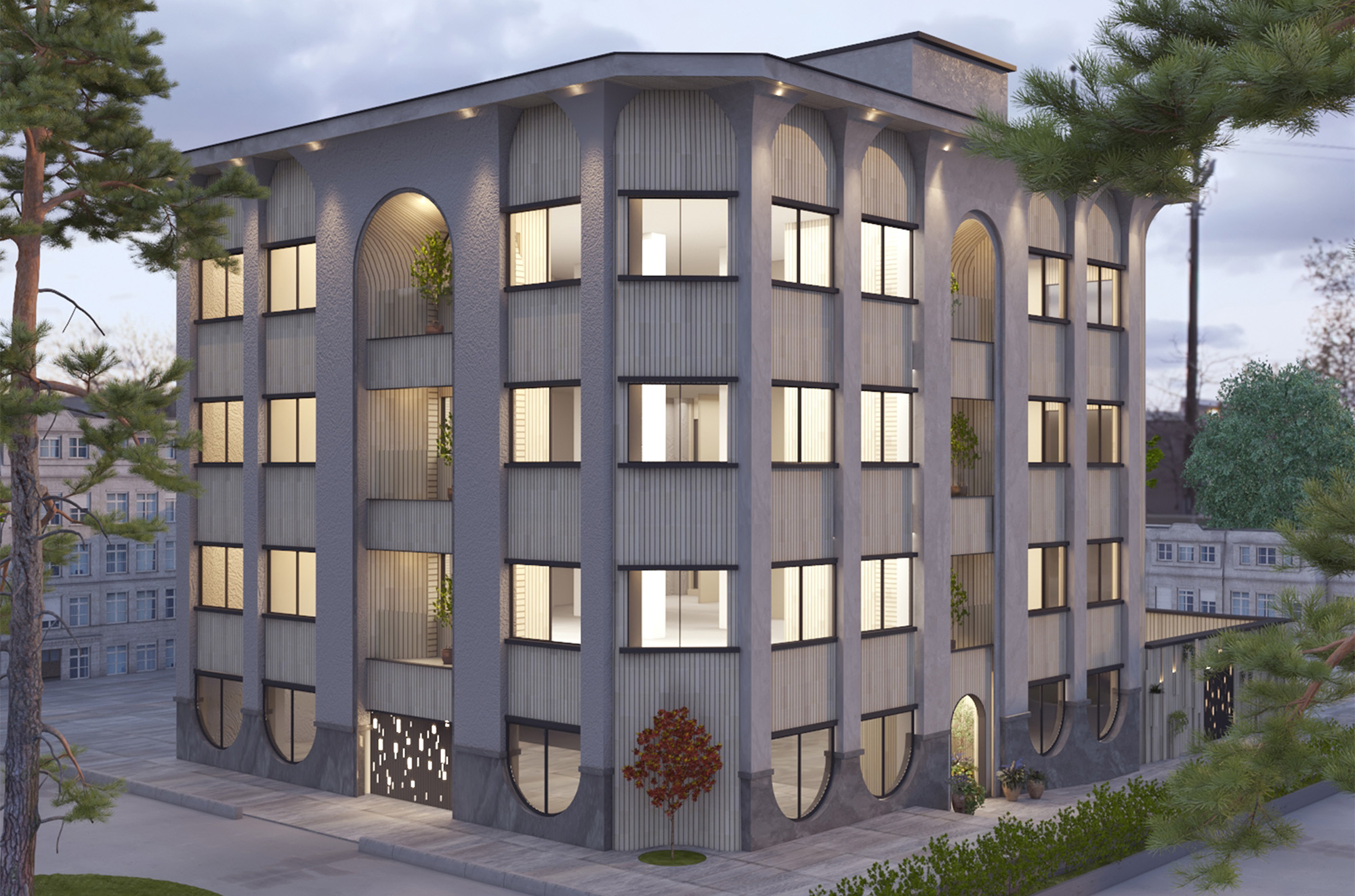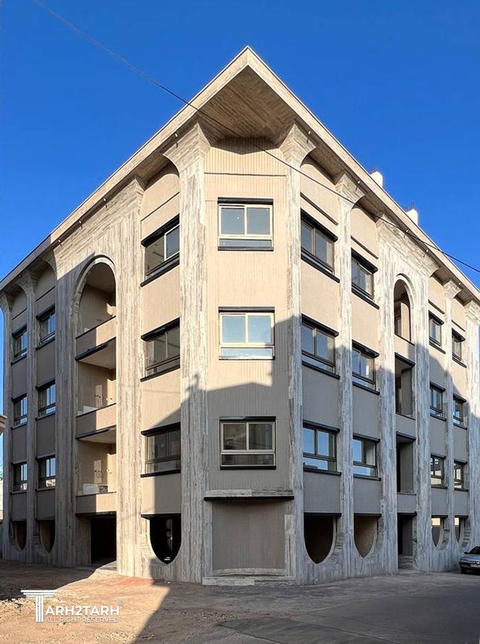 در این طرح، ایدهی اصلی نما از تعدد درختان چنار منطقه و رشد پاجوشهای آنها گرفته شده است. حضور چنارها الهامبخش ایجاد ریتمی منظم، فرمی نرم و پویا در کل نما شده است. صفحهی بیرونزده در بالای بنا و ستونهایی که آن را نگه داشتهاند ــ با الهام از سایه، شاخهها و پرسپکتیو ایجادشده توسط درخت ــ علاوه بر افزایش ارتفاع دیداری، حس امنیت را تقویت میکنند. در بخش پایین بنا، اتصال و پیوستگی ستونها یادآور پاجوشهای چنار است و فضایی کاربردی برای نشستن (پیرنشین) ایجاد میکند که از عناصر معماری اصیل ایرانی به شمار میرود. تنوع عمقی در سطوح مختلف نما نیز به پویایی و خوانایی بنا میافزاید و ورودی بنا بهصورت شاخص طراحی شده است. در انتخاب متریال، استفاده از آجر بهعنوان مصالح سنتی معماری ایران، سنگ بهعنوان عنصر بومآورد منطقه، و کاشی بهعنوان نمادی از هنر ایرانی، هویت بنا را تقویت میکند. ترکیب سنگ و کاشی در کنار گرهها و الگوهای هندسی نیز رویکردی معاصر با پشتوانهای تاریخی ایجاد کرده است