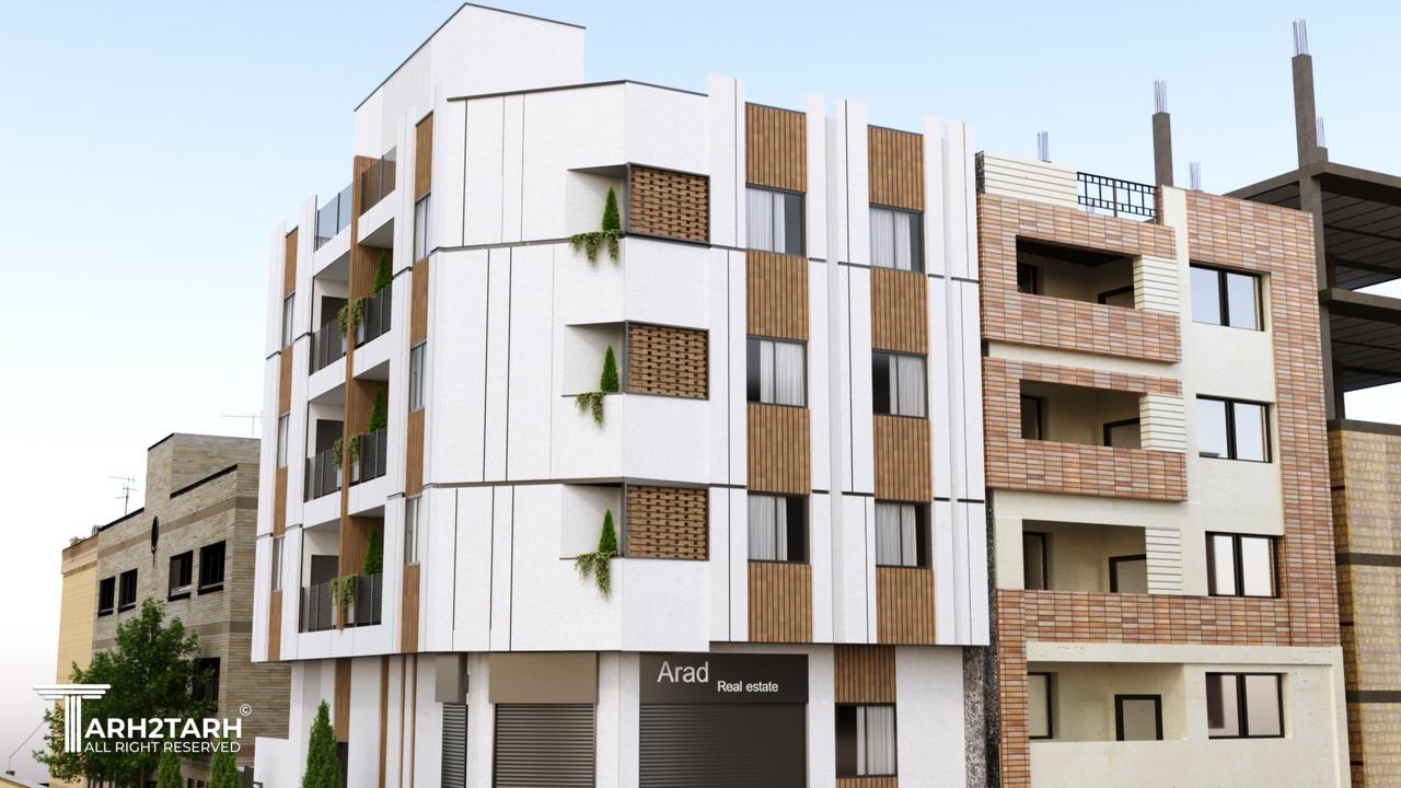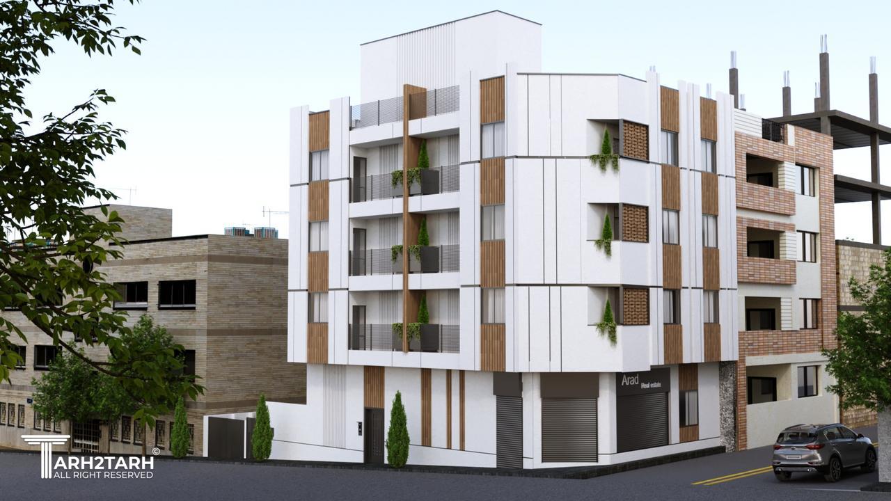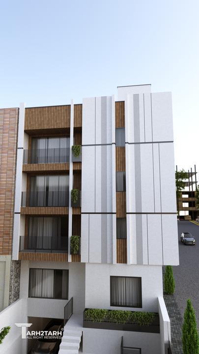 در این پروژه با ترکیب سنگ سفید و آجر قهوه ایی و فلز تیره و همچنین بهره گیری از الگوی فخر و مدین در جلوی تراس های مشرف به همسایه، سعی بر ایجاد نمایی یکپارچه سعی بر حفظ حریم خصوصی همسایه شده است