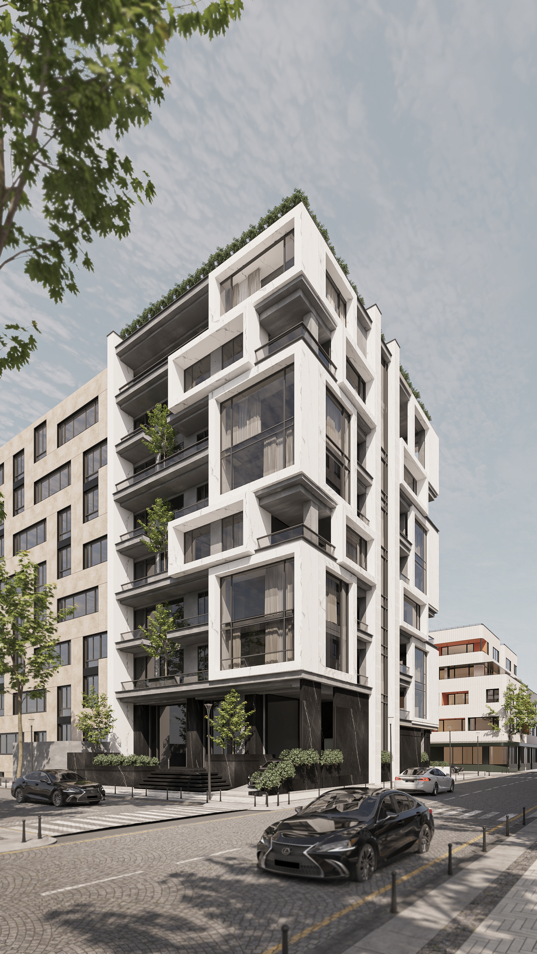 این پروژه یک ساختمان مسکونی هفت طبقه بوده که با کانسپت ویلا آپارتمان در منطقه متل قو در حال اجراست.با توجه به شرایط و محدودیت های این پروژه طراحی این ساختمان به جهت ایجاد ارزش افزوده به صورت خورحینی انجام شده است. صفر تا صد طراحی و اجرای این پروژه بر عهده دفتر معماری چکاد است.