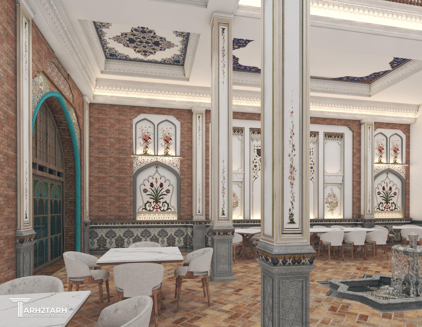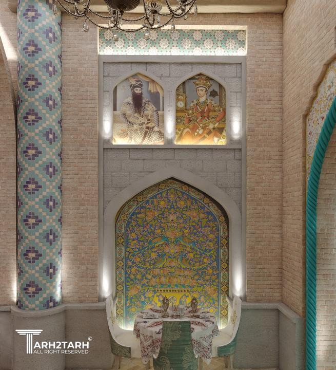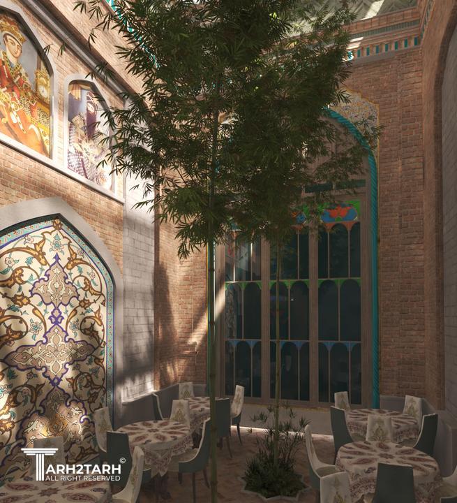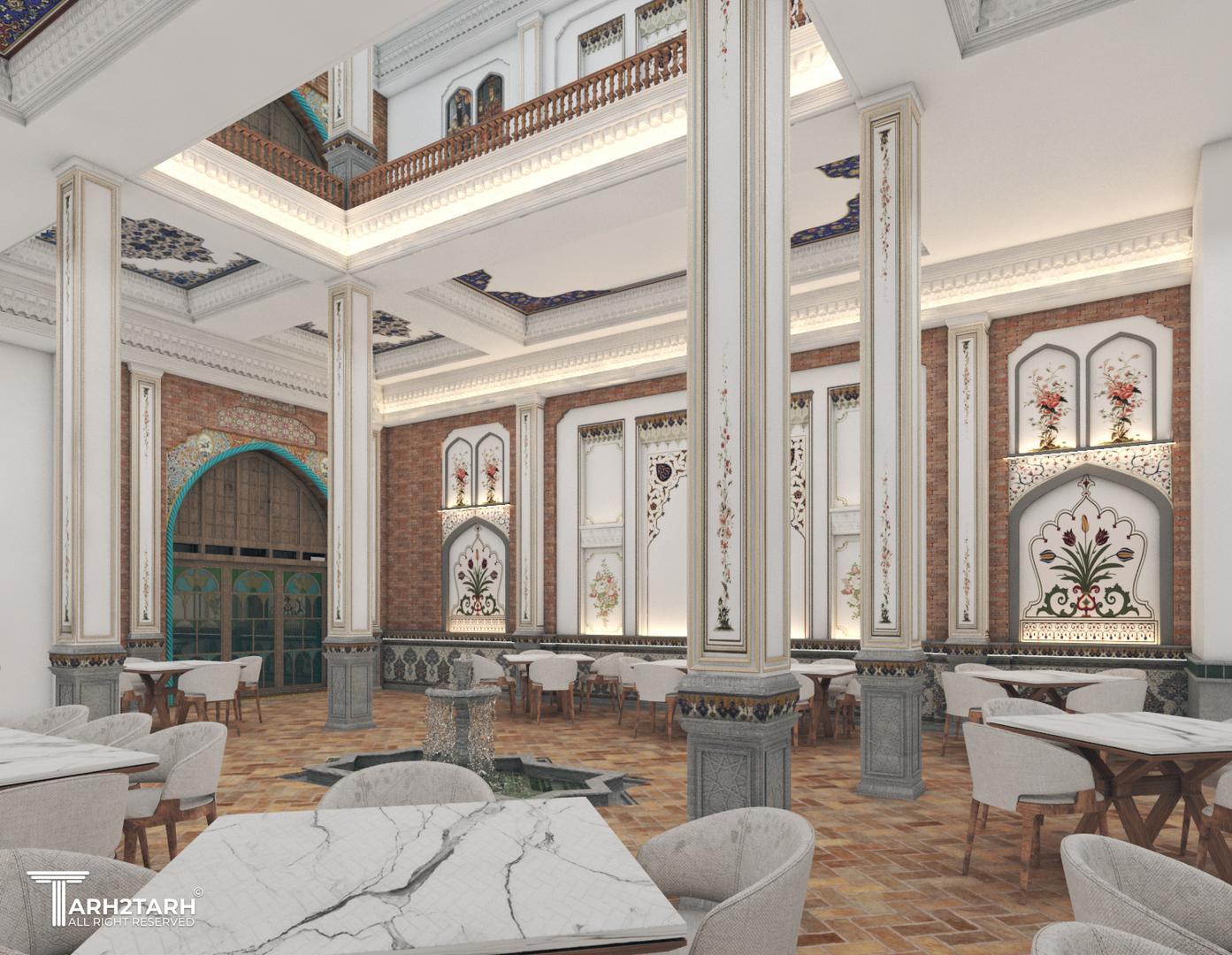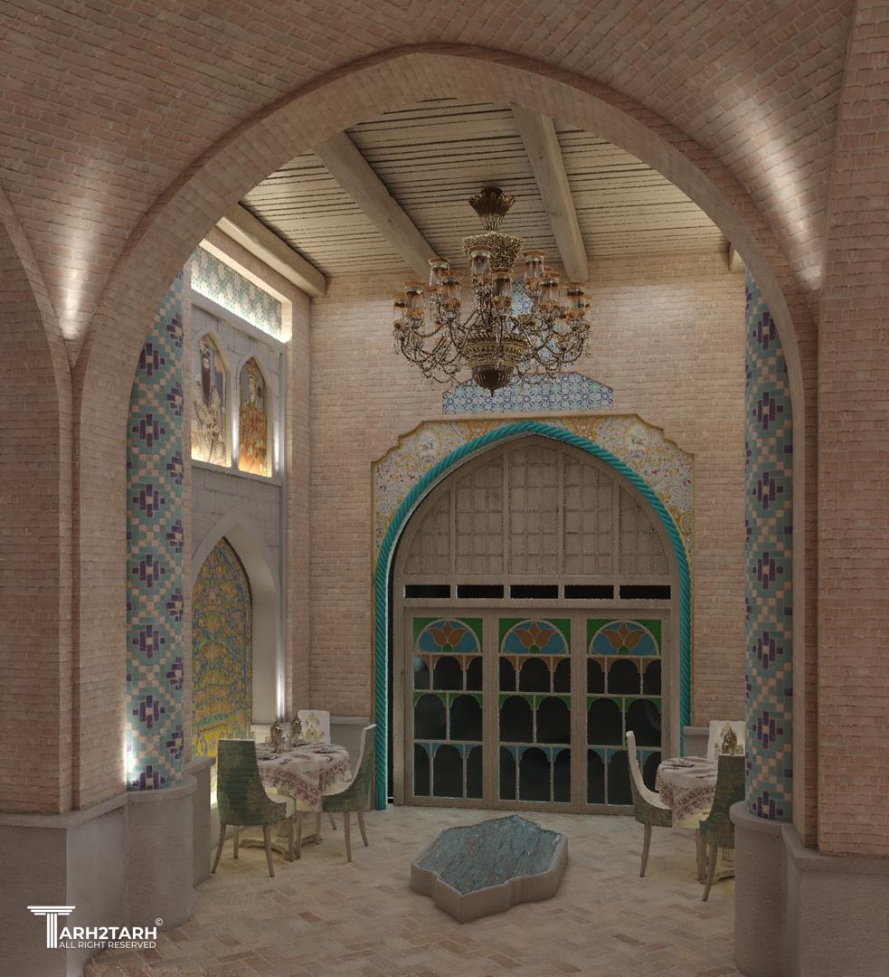 طراحی رستوران سنتی داخل بازار تبریز در دو طبقه که در کنار دروازه تاریخی شهر قرار گرفته و در طراحی با دروازه قدیمی تلفیق شده است