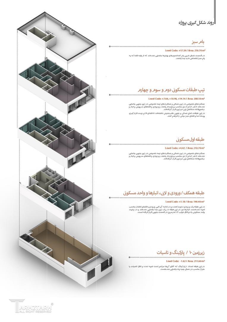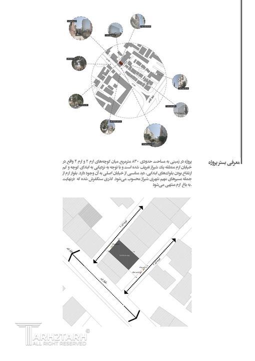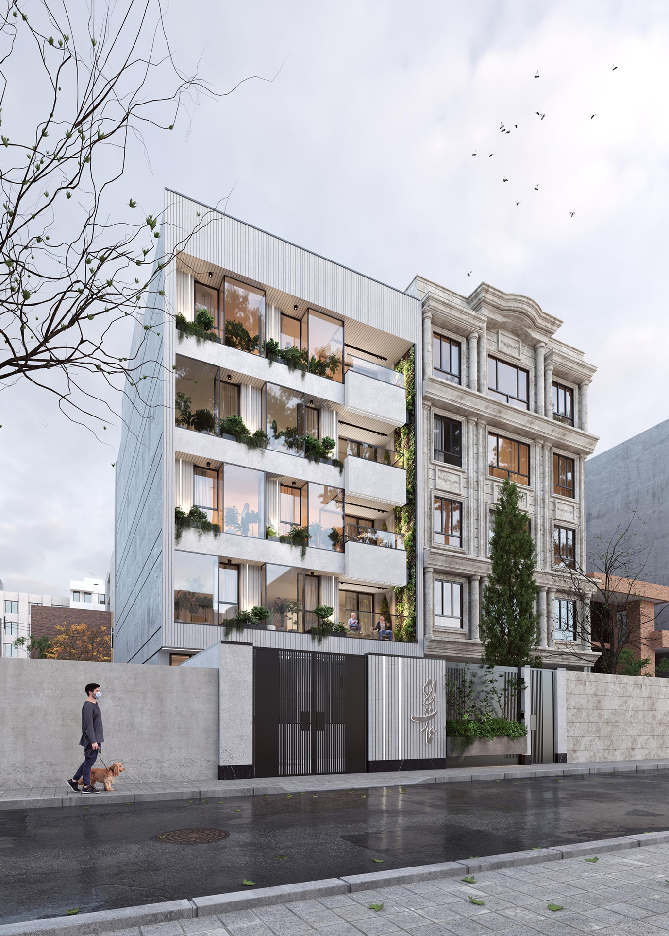 این پروژه مسکونی، در خیابان اصلی ارم که به باغ ارممنتهی می شود، در منطقه ۱ شهر شیراز تعریف شده است. در شروع پروژه، خیابان اصلی در راستای طرح شهرداری در دست نوسازی بود و بلوک های شهری زیادی در حال ساخت بودند. در این برهه کمبود فضاهای سبز به خصوص در واحدهای مسکونی در امتداد باغ ارم بسیار مشهود بود. از این رو طراحی در راستای برقراری یک "دیالوگ" سبز بین درون وبیرون نما و با منظر شهری پیش رفت. در این راستا به دنبال ایجاد تراسهایی عمیق در ضلع شرقی نمای جنوبی، یک دیوارسبز سر تا سری روبه خیابان اصلی، اولین "دیالوگ سبز" با شهر را برقرار می کند، در ادامه این سبزینگی عمودی در راستای افقی نیز در هر طبقه امتداد می یابد و با بازی شکستگی های نما، درون بنا نیز نفوذ می کند و این "دیالوگ" بین درون و بیرون نما نیز شکل می گیرد.