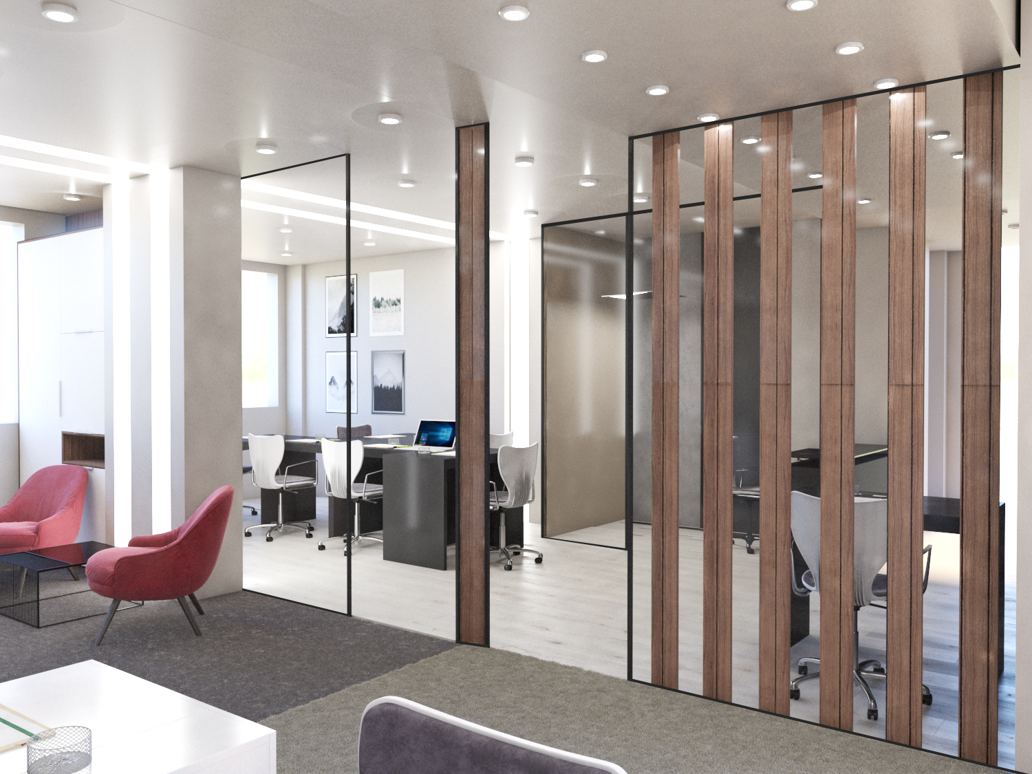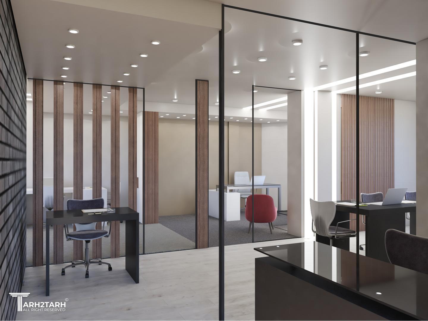 طراحی به صورت بازسازی و تغییرات جزیی در اندازه پلان اتاق ها و طراحی فضا به شکل مدرن برای یک محیط اداری با بیشترین بهره گیری از نور طبیعی