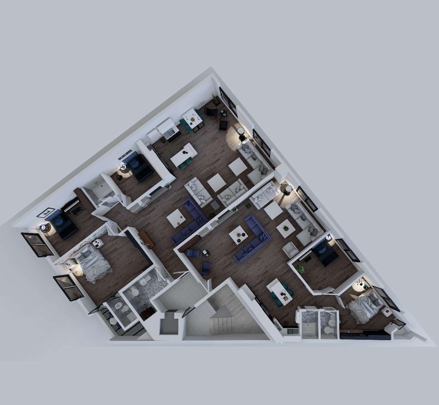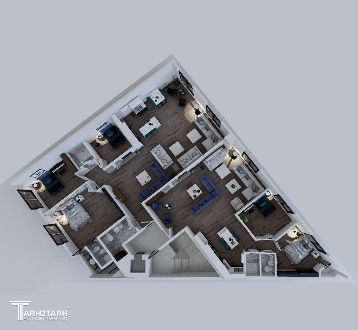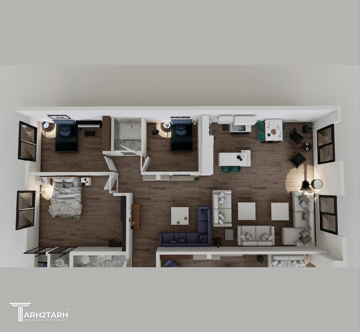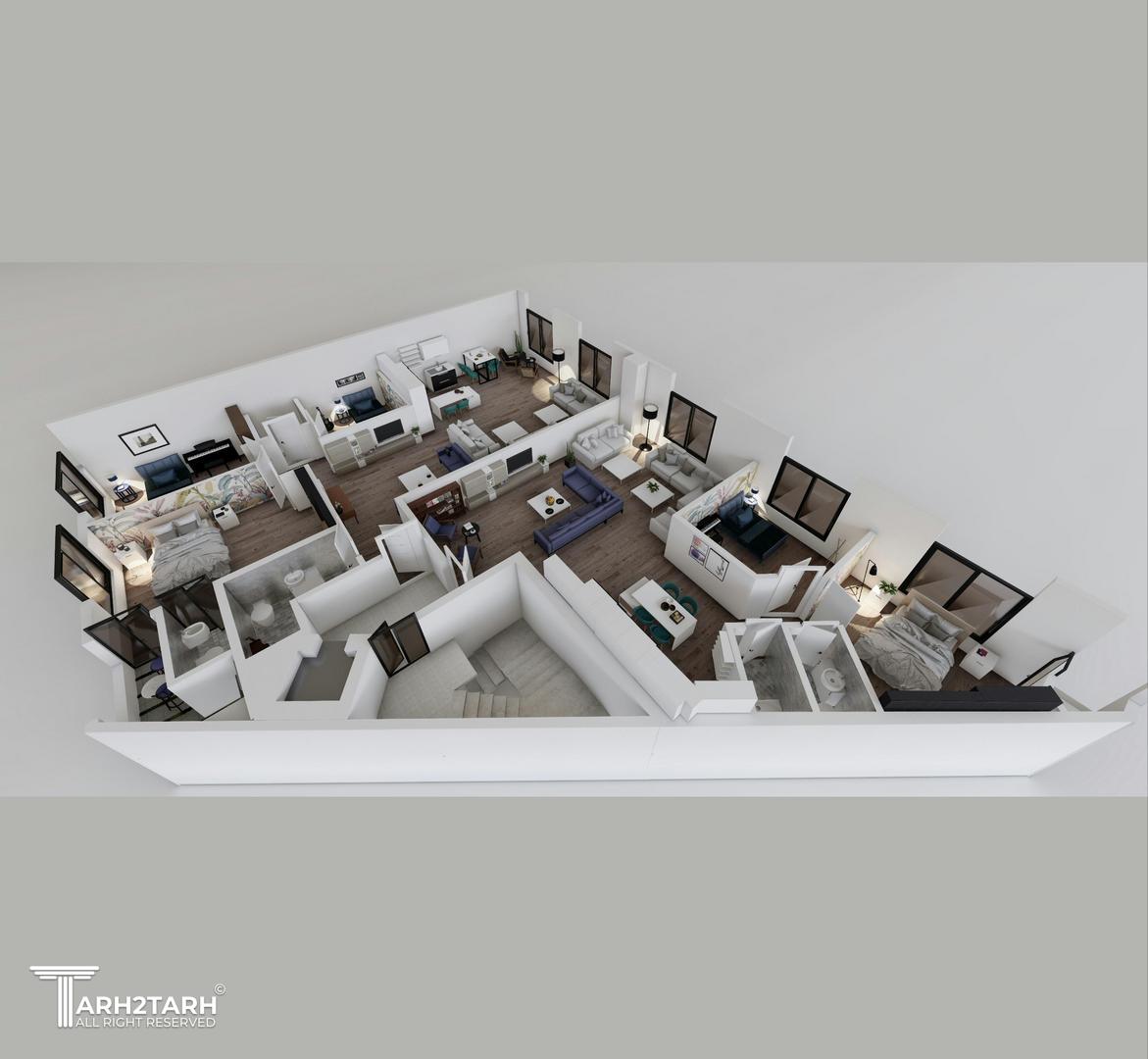 پلان سه بعدی طبقات 2 واحدی برای نشان دادن تفکیک فضاها