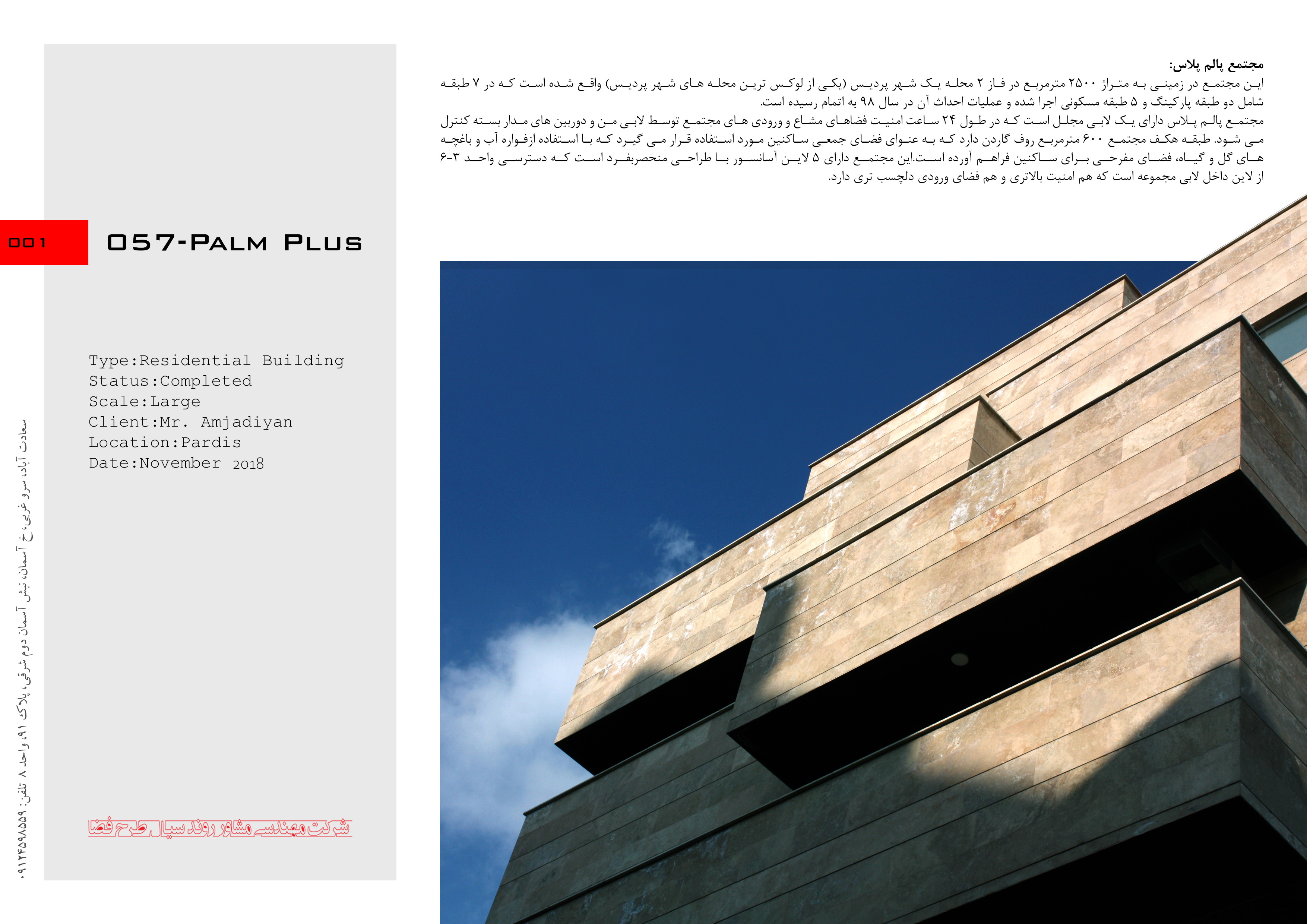 این مجتمع در فاز 2 شهر پردیس واقع شده است. در زمان ورود ما، پروژه یک اسکلت بتنی طبق نقشه های جواز داشت که در مراحل طراحی سعی شد با حداقل دخل و تصرف در سازه بتنی در دجه اول واحدهای مجتمع را سامادنهی کنیم و هم حجم بنا و فضاهای مشاعات را بروز و تکمیل کنیم