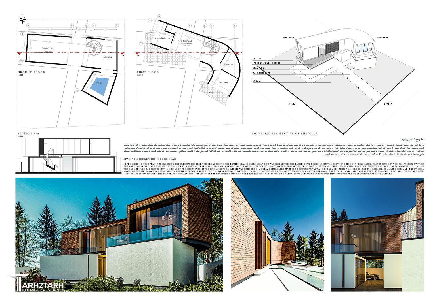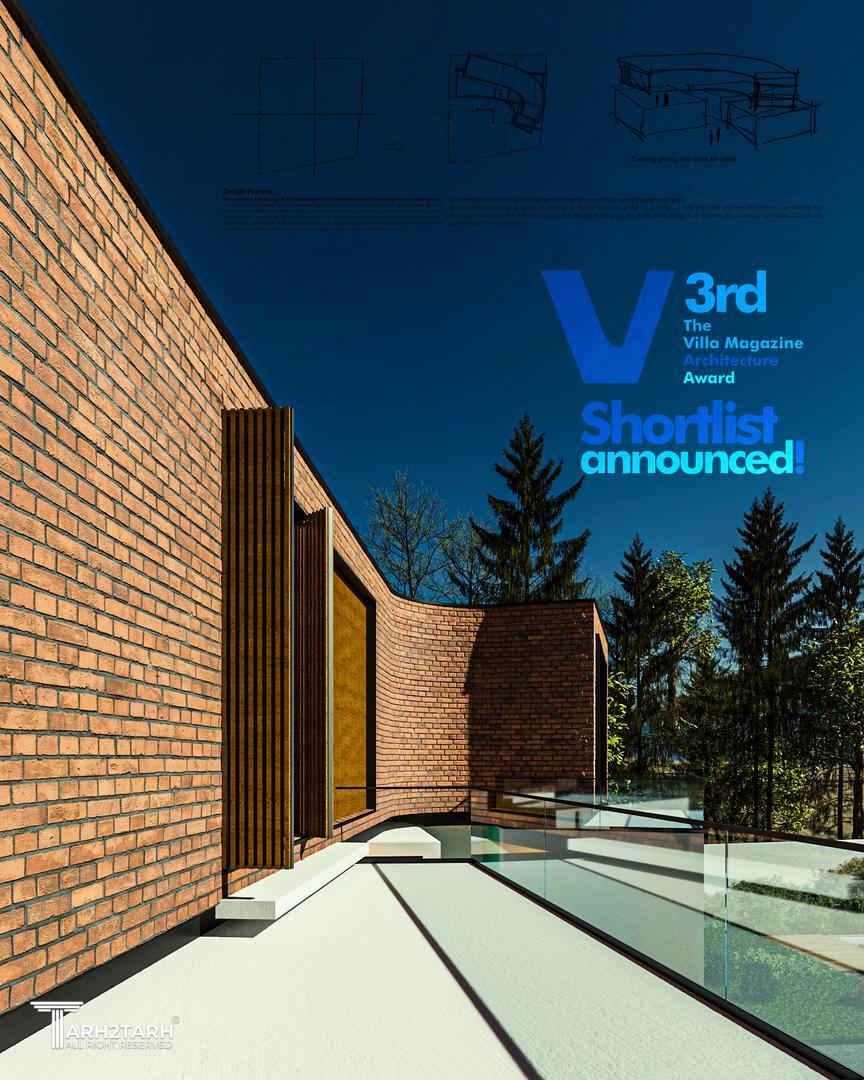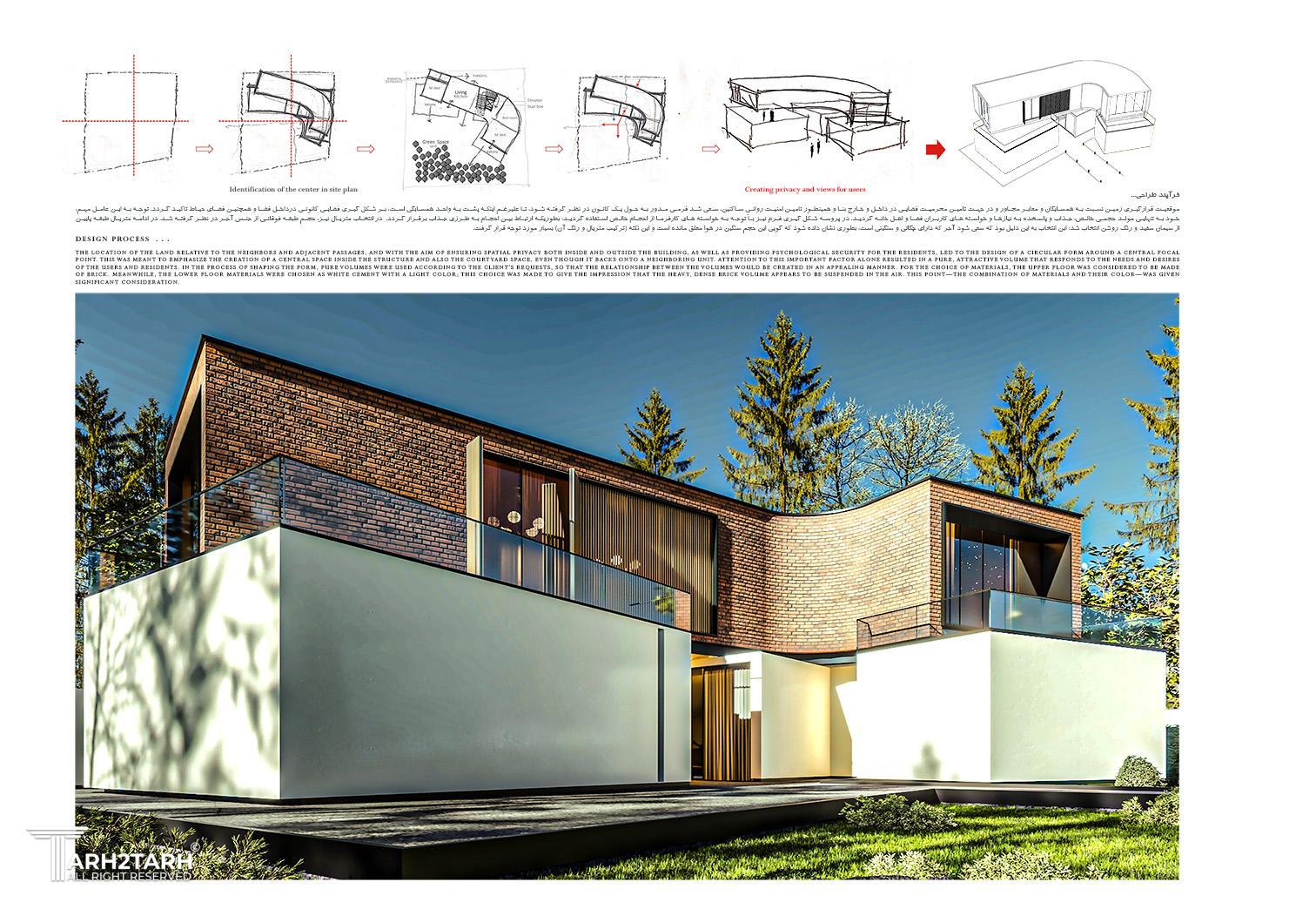 موقعیت قرارگیری زمین نسبت به همسایگان و معابر مجاور و در جهت تامین محرمیت فضایی در داخل و خارج بنا و همینطور تامین امنیت روانیِ ساکنین، سعی شد فرمی مدور به حول یک کانون در نظر گرفته شود، تا علیرغم اینکه پشت به واحد همسایگی است، بر شکل گیری فضایی کانونی درداخل فضا و همچنین فضای حیاط تاکید گردد. توجه به این عامل مهم، خود به تنهایی مولد حجمی خالص، جذاب و پاسخده به نیازها و خواسته های کاربران فضا و اهل خانه گردید. در پروسه شکل گیری فرم نیز با توجه به خواسته های کارفرما از احجام خالص استفاده گردید؛ بطوریکه ارتباط بین احجام به طرزی جذاب برقرار گردد. در انتخاب متریال نیز، حجم طبقه فوقانی از جنس آجر در نظر گرفته شد. در ادامه متریال طبقه پایین از سیمان سفید و رنگ روشن انتخاب شد؛ ابن انتخاب به این دلیل بود که سعی شود آجر که دارای چگالی و سنگینی است، بطوری نشان داده شود که گویی این حجم سنگین در هوا معلق مانده است و این نکته (ترکیب متریال و رنگ آن) بسیار مورد توجه قرار گرفت.