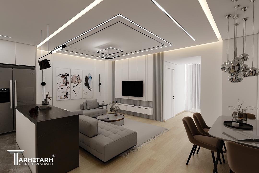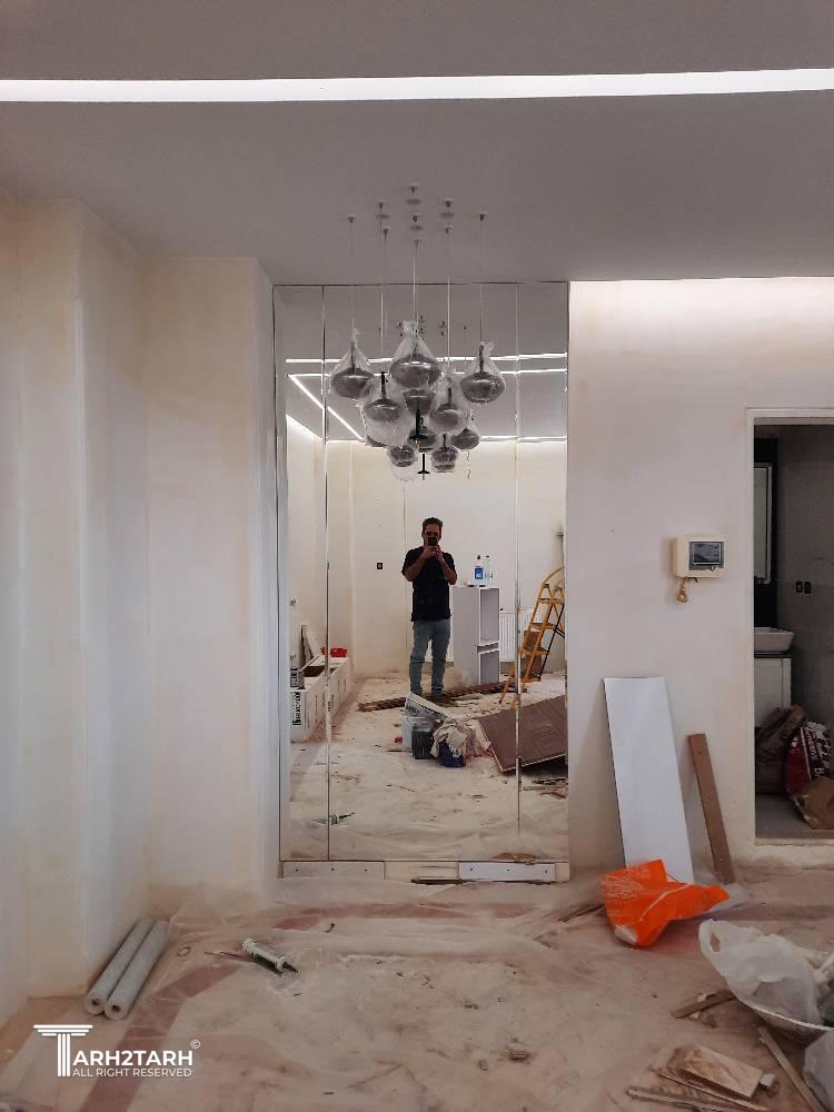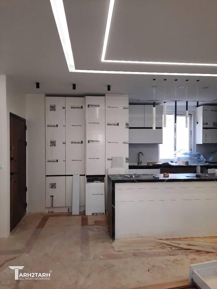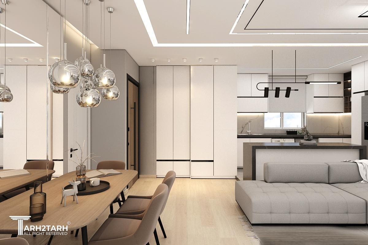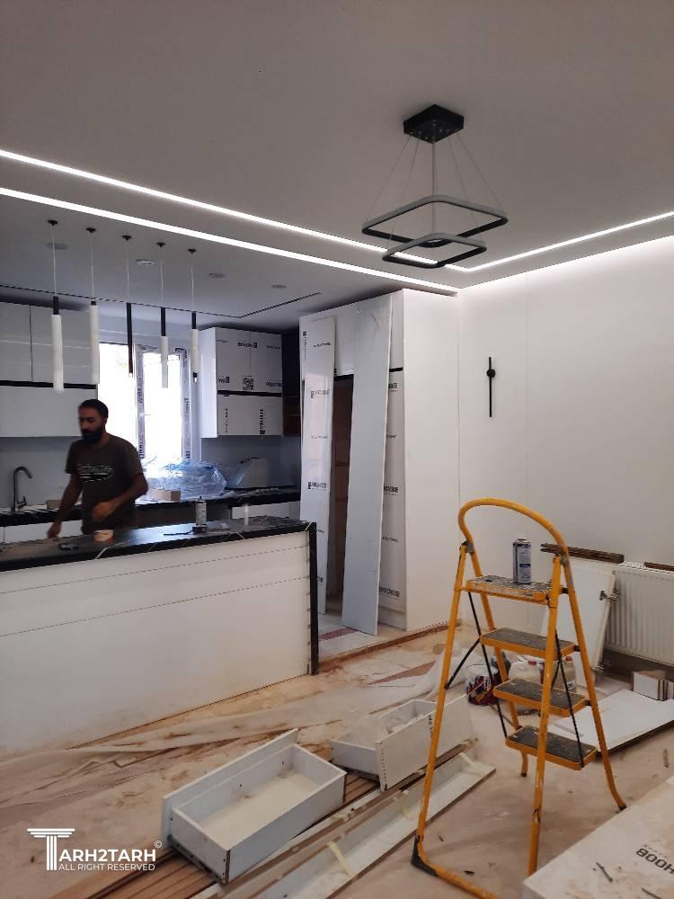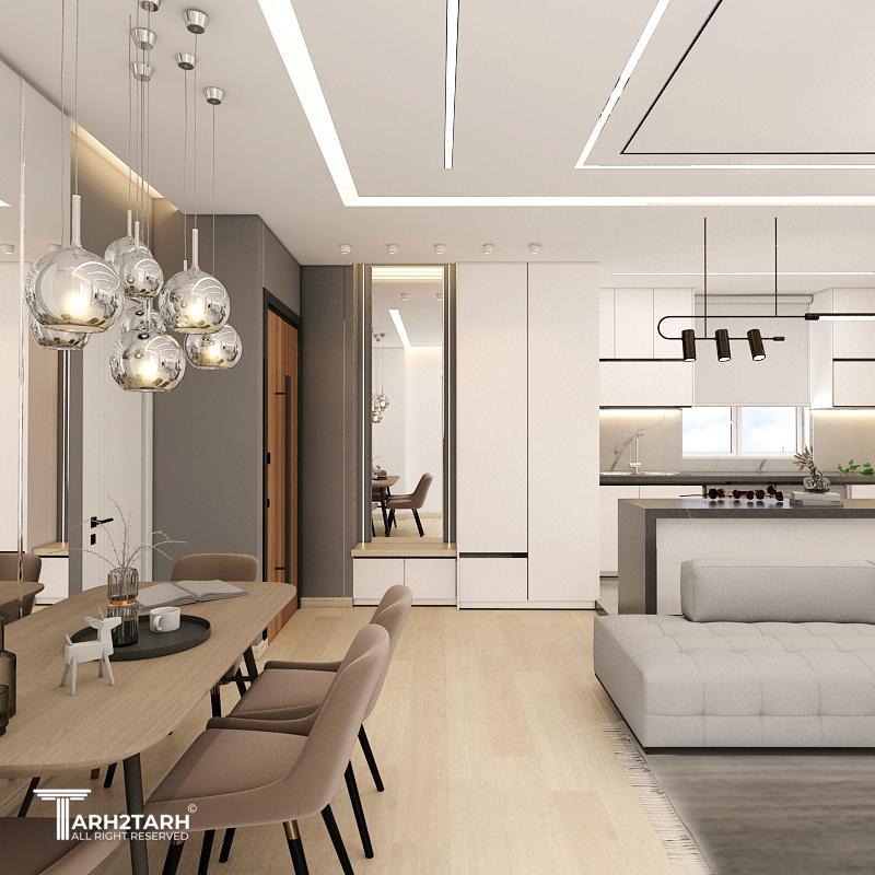 طراحی داخلی و بازسازی این آپارتمان که ۷۰ متر مربع بود به تیم ما سپرده شد .در ابتدا با توجه به خواسته کارفرما طراحی به سبک مدرن انجام شد .سقف های کاذب .بدنه ها درب ورودی ..کابینت ها و کمد های دیواری می بایست مجددا ساخته .اجرا و نصب میشدند.نور پردازی سقف و اتاق ها با استفاده از نورهای خطی و هالوژن ها و لوستر ها و چراغ های آویز انجام شد .