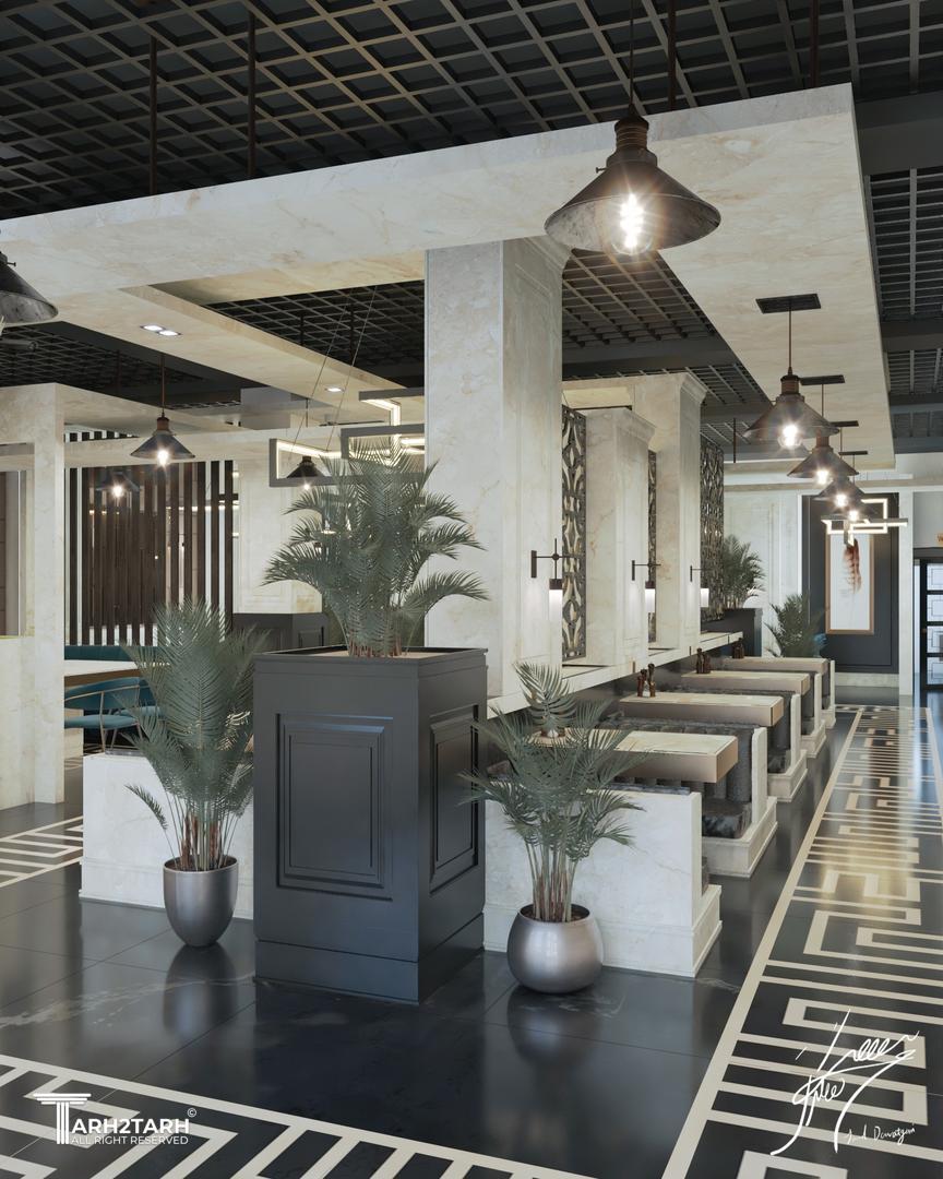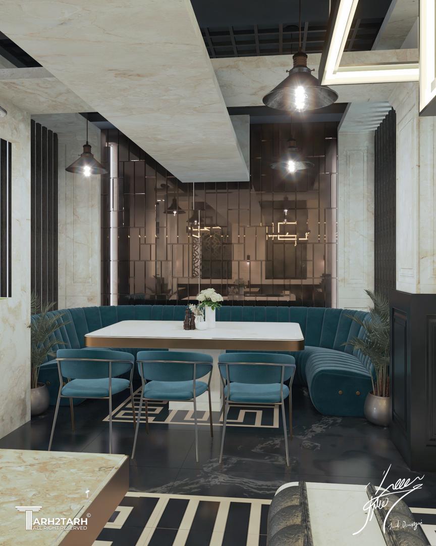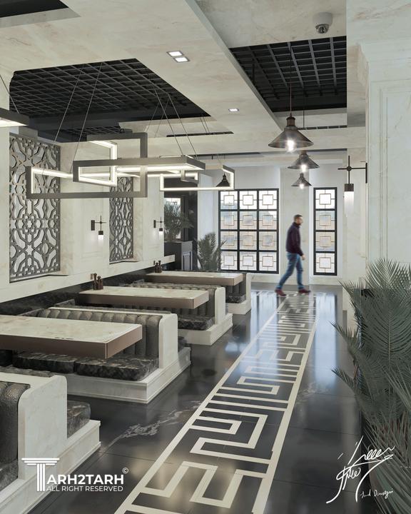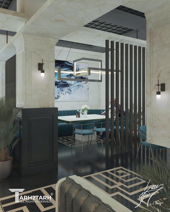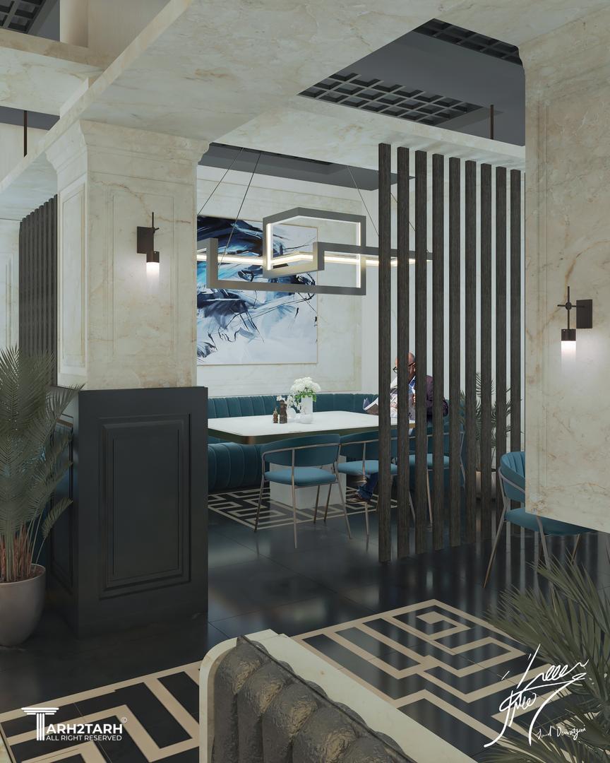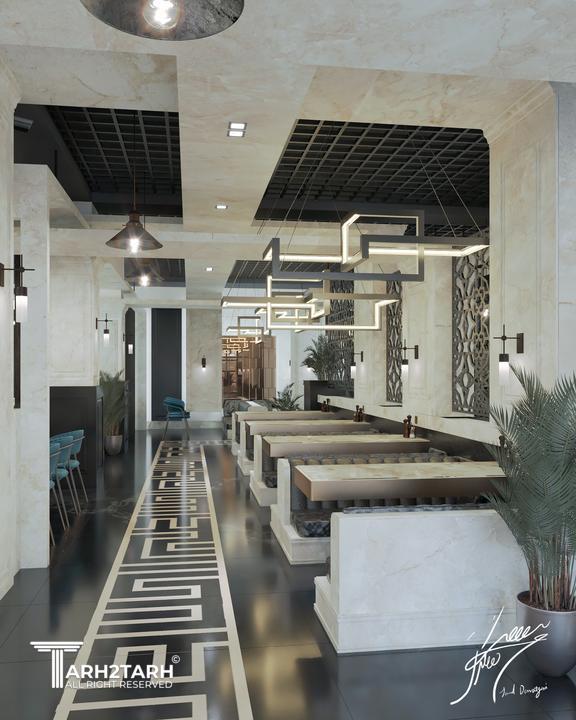 طراحی این کافهرستوران بر پایهی ترکیب ظرافت مدرن و الهام از الگوهای کلاسیک شرقی شکل گرفته است. استفاده از خطوط هندسی منظم در کف و سقف، همراه با رنگهای خنثی و متریال سنگ و فلز، فضایی منسجم و باوقار ایجاد کرده است. فرم کلی فضا از نظم هندسی و تکرار الگوها پیروی میکند تا حس هماهنگی و تعادل را القا کند. نورپردازی خطی و معلق در سقف، علاوه بر تأکید بر محوریت فضا، حس معاصریت و پویایی را وارد محیط کرده است. بهطور کلی، این فضا تلاش دارد تجربهای آرام، لوکس و در عین حال صمیمی را برای مهمانان فراهم آورد.